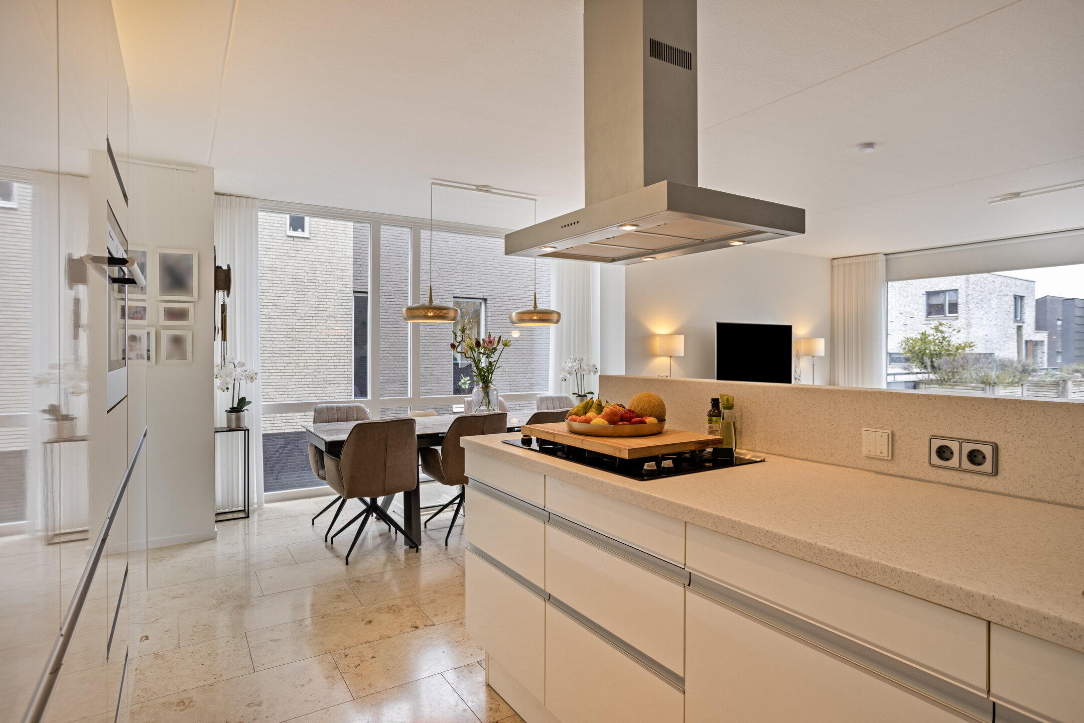 – de moderne open keuken in hoogglans wit is voorzien van een kookeiland met kookplaat en afzuigkap, een combimagnetron, koelkast, vriezer en vaatwasser, ideaal voor wie van koken en gezellig tafelen houdt;