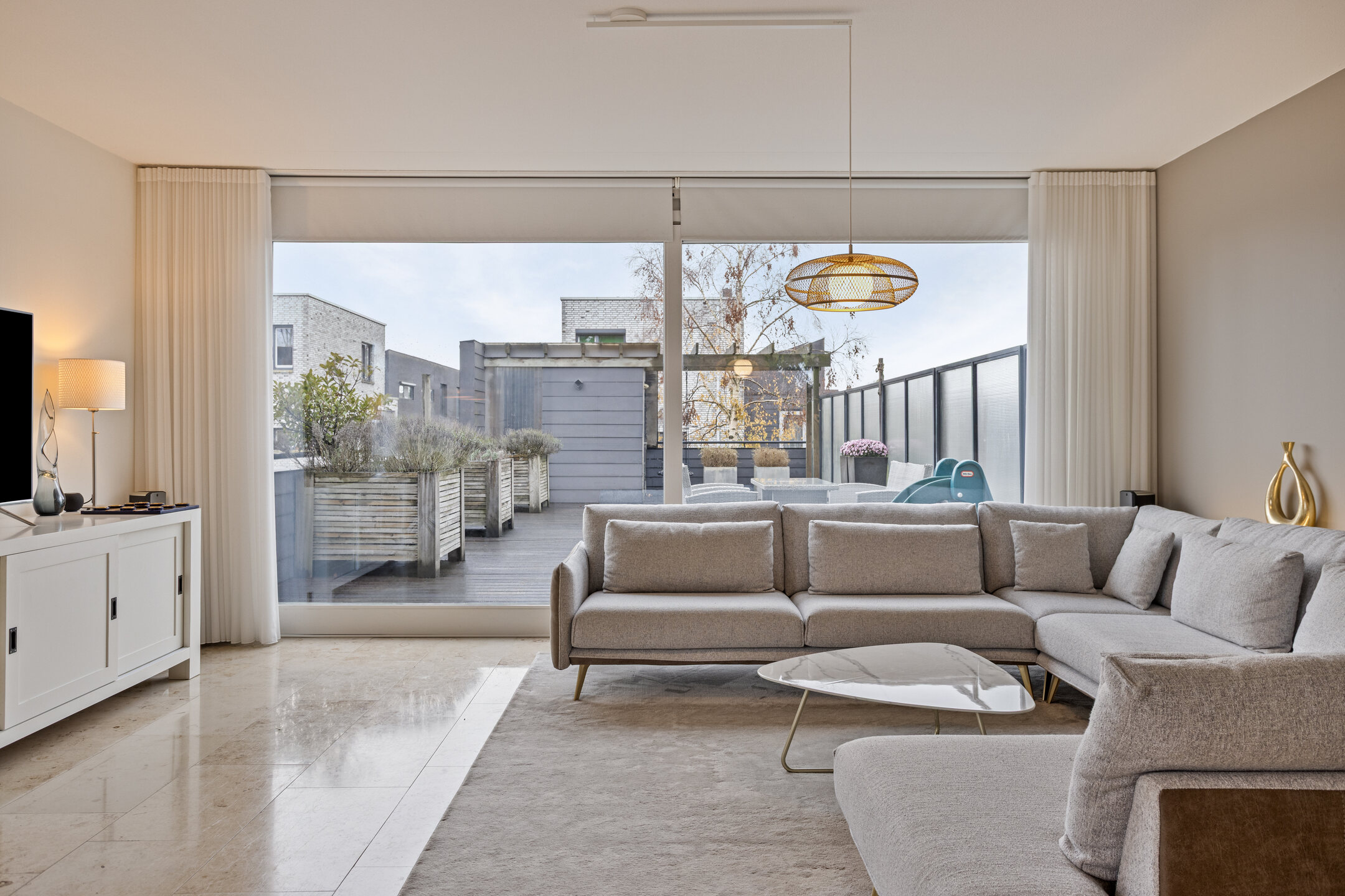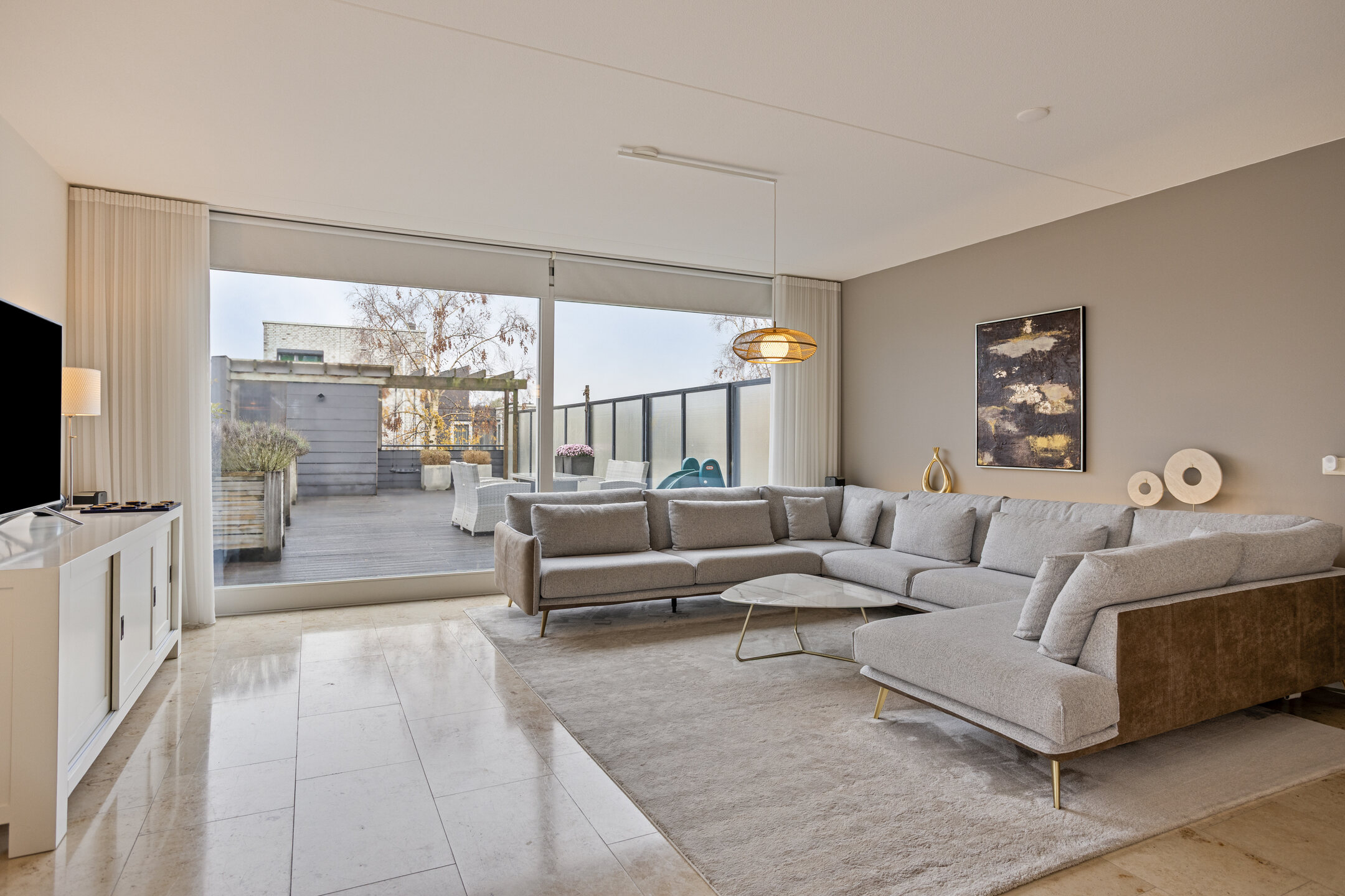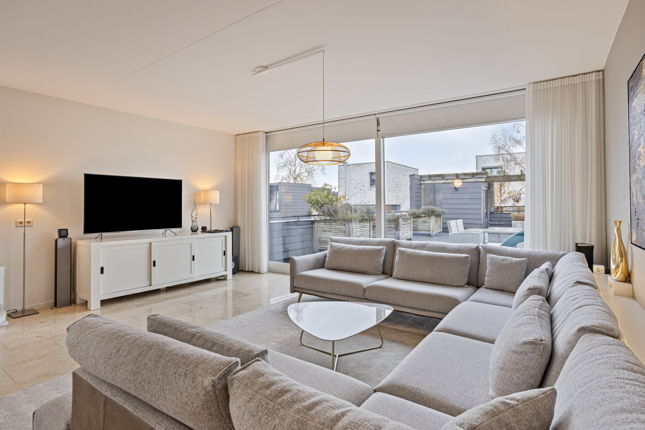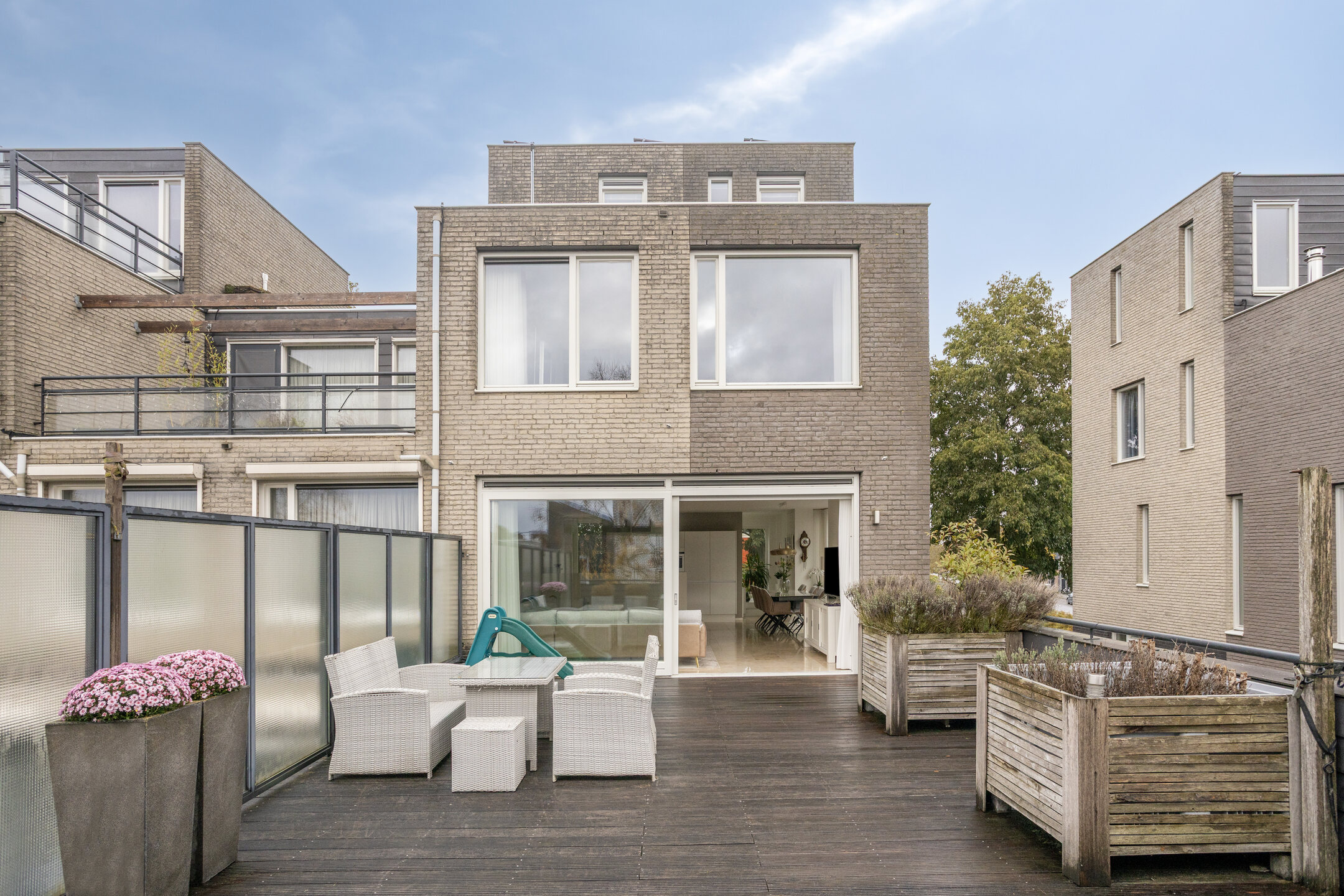 – de woonkamer opvallend licht is door de grote raampartijen aan twee zijden, wat zorgt voor een ruimtelijk gevoel en een aangename woonbeleving;