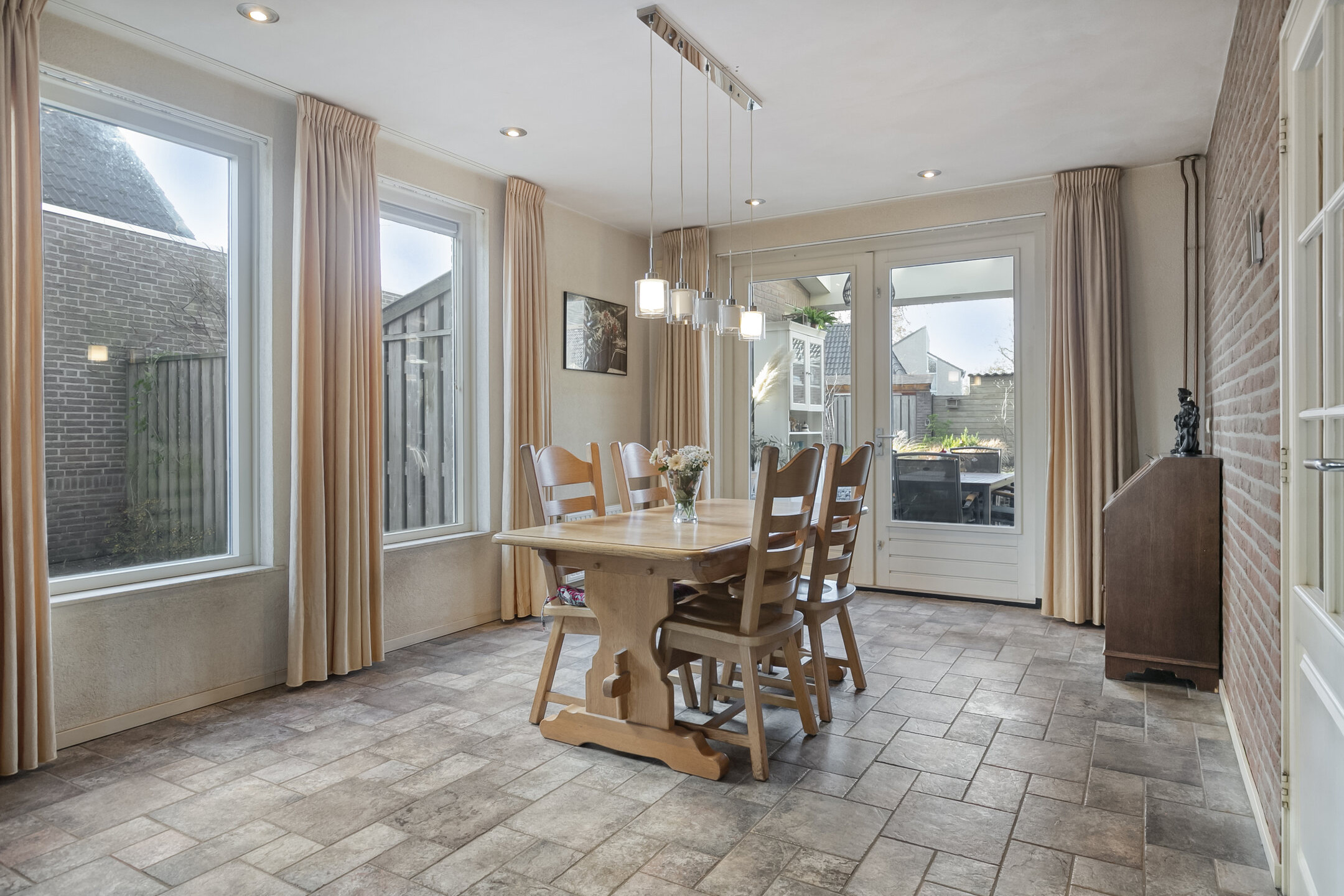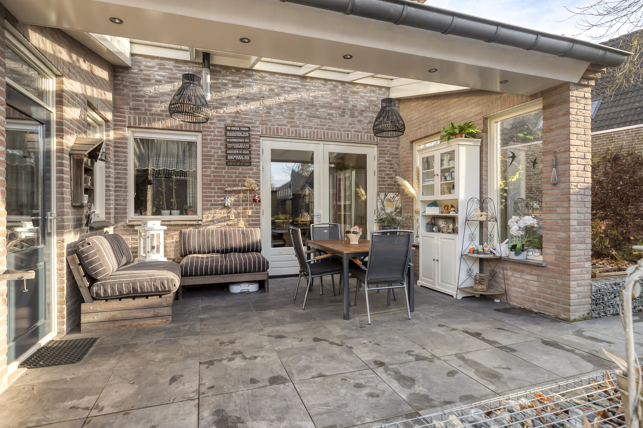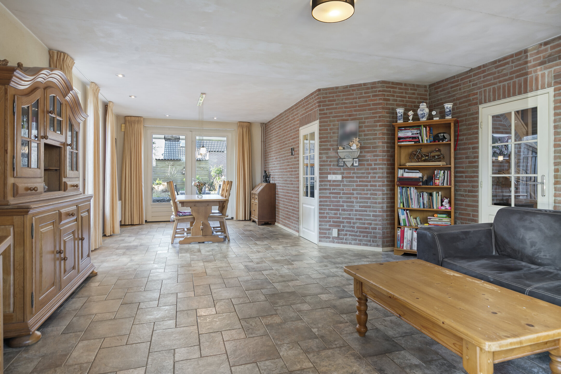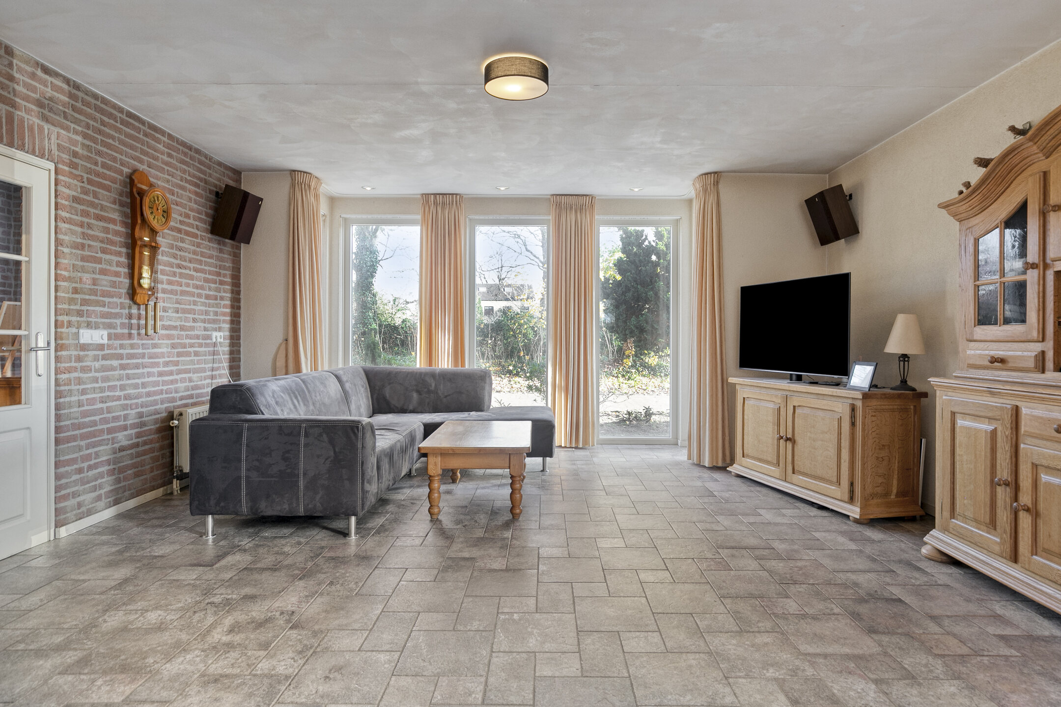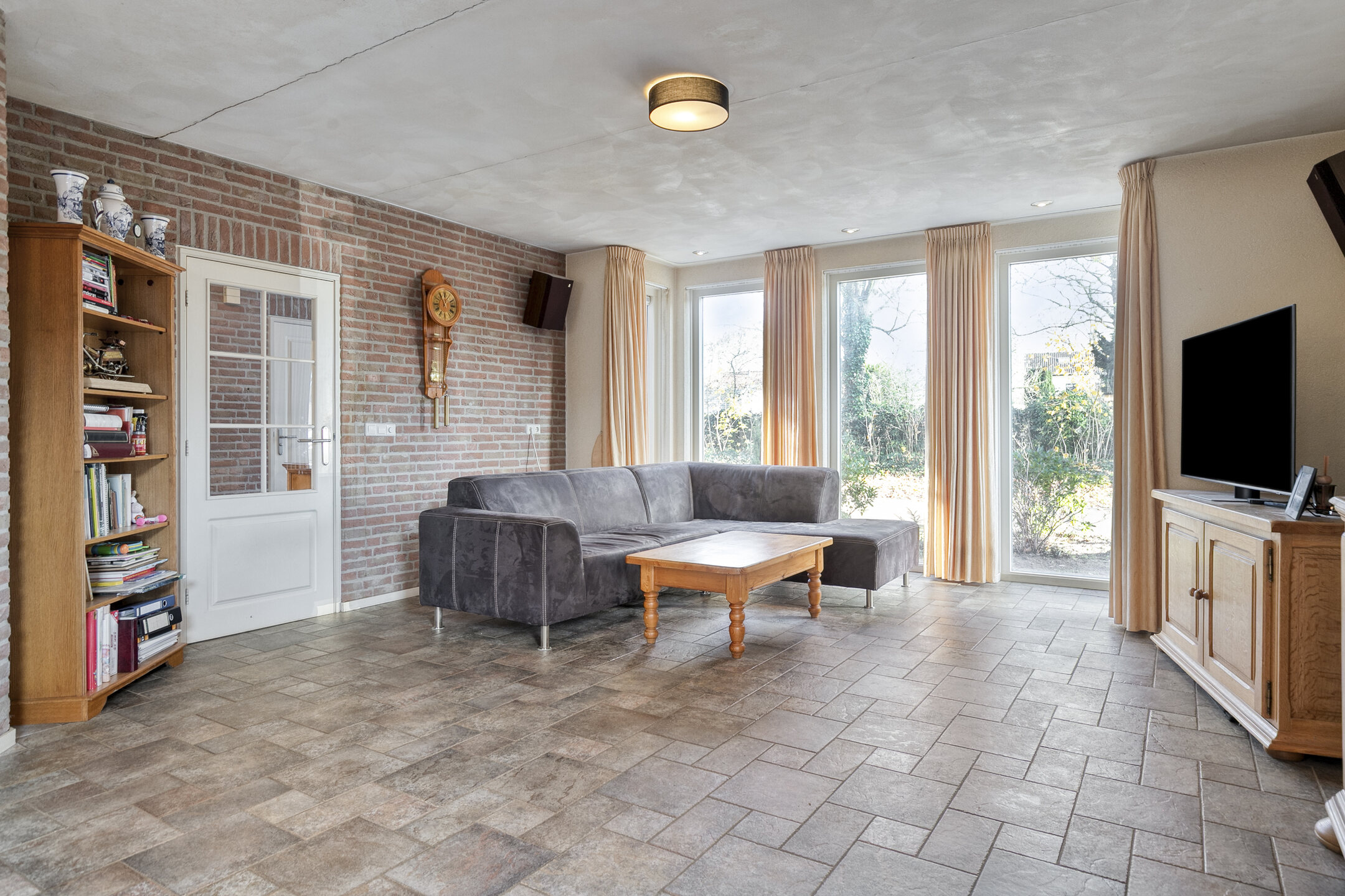 – De L-vormige woonkamer heerlijk ruim is en is voorzien van grote raampartijen die zorgen voor veel natuurlijk licht, een tegelvloer met comfortabele vloerverwarming en openslaande deuren naar de aangebouwde overkapping;