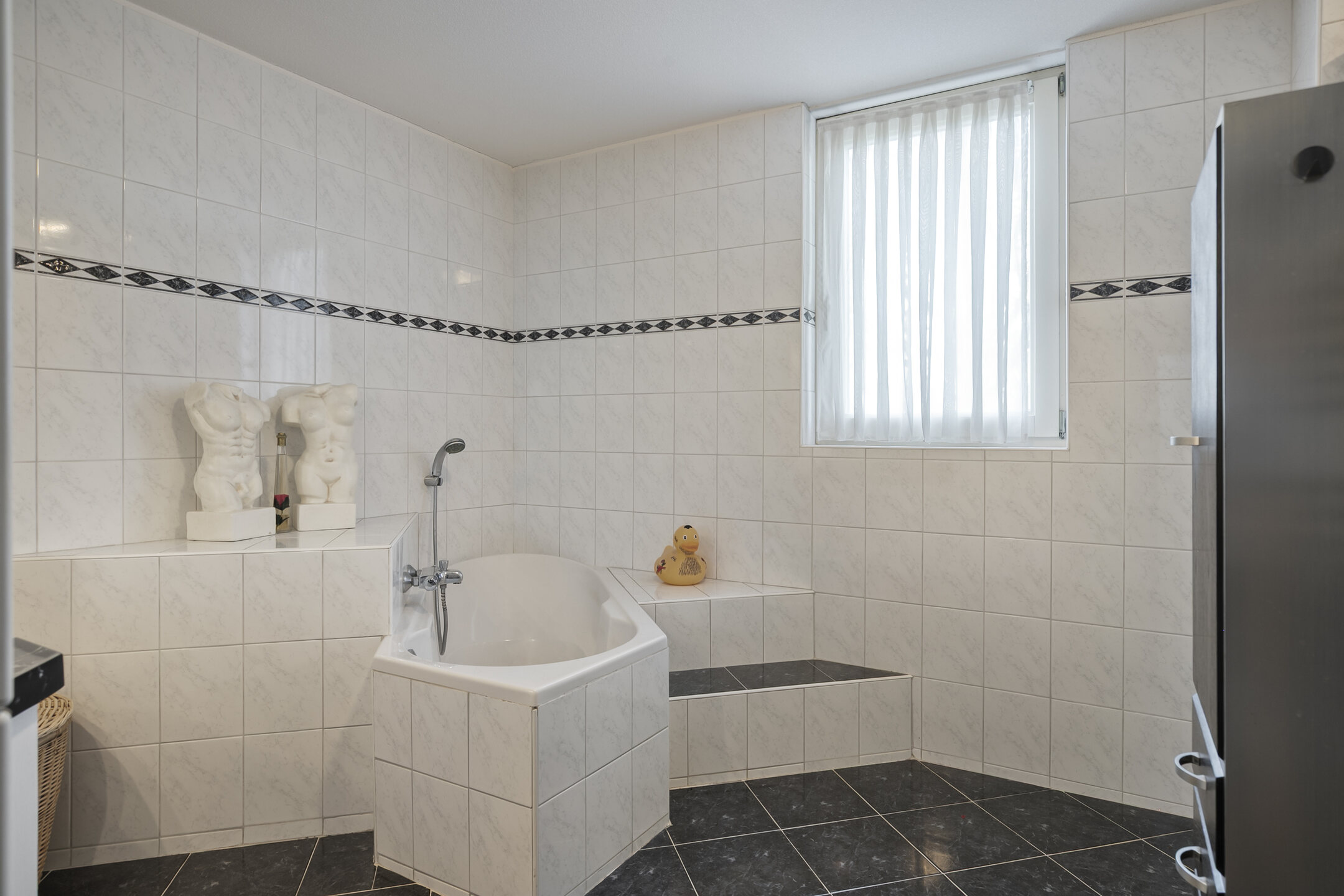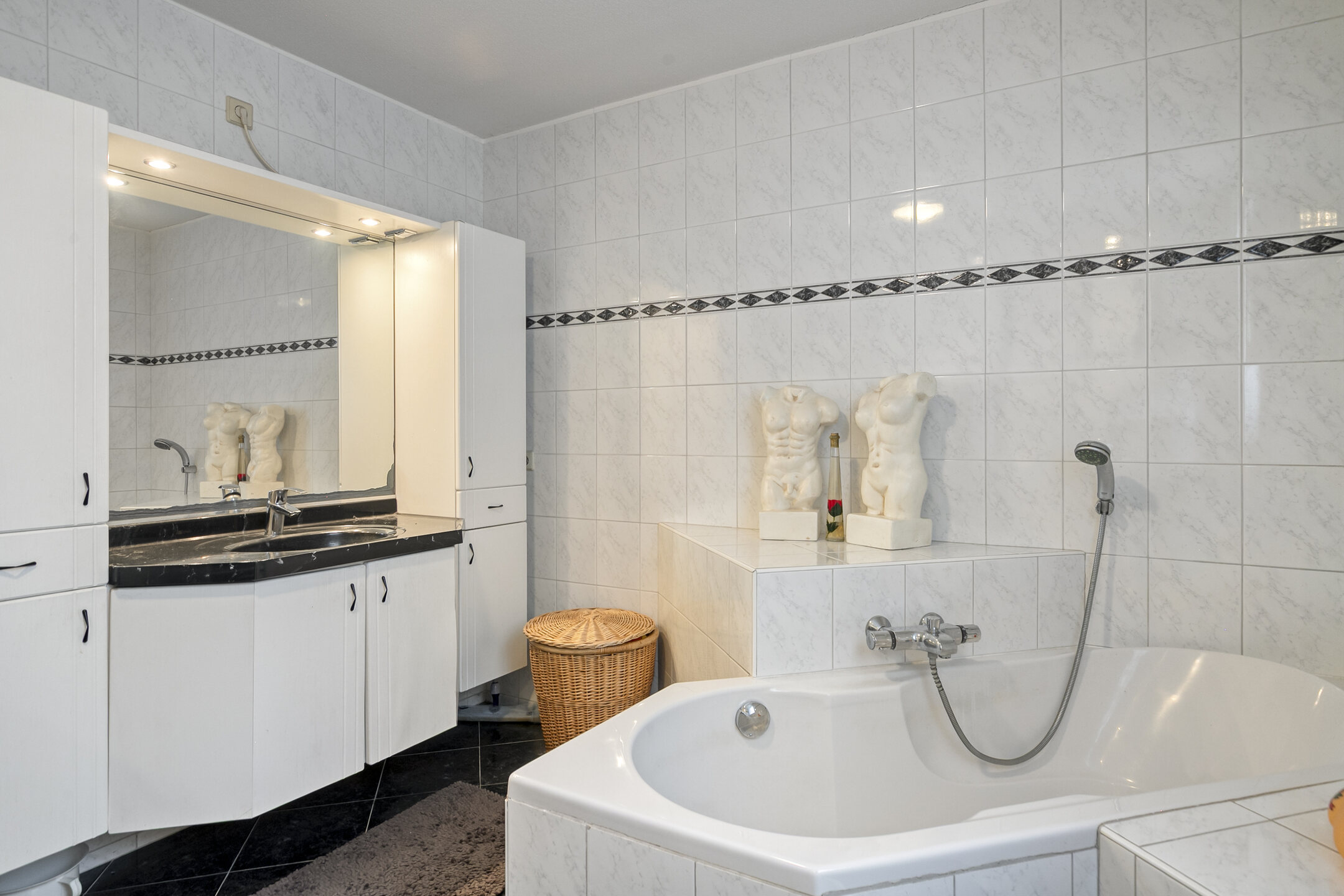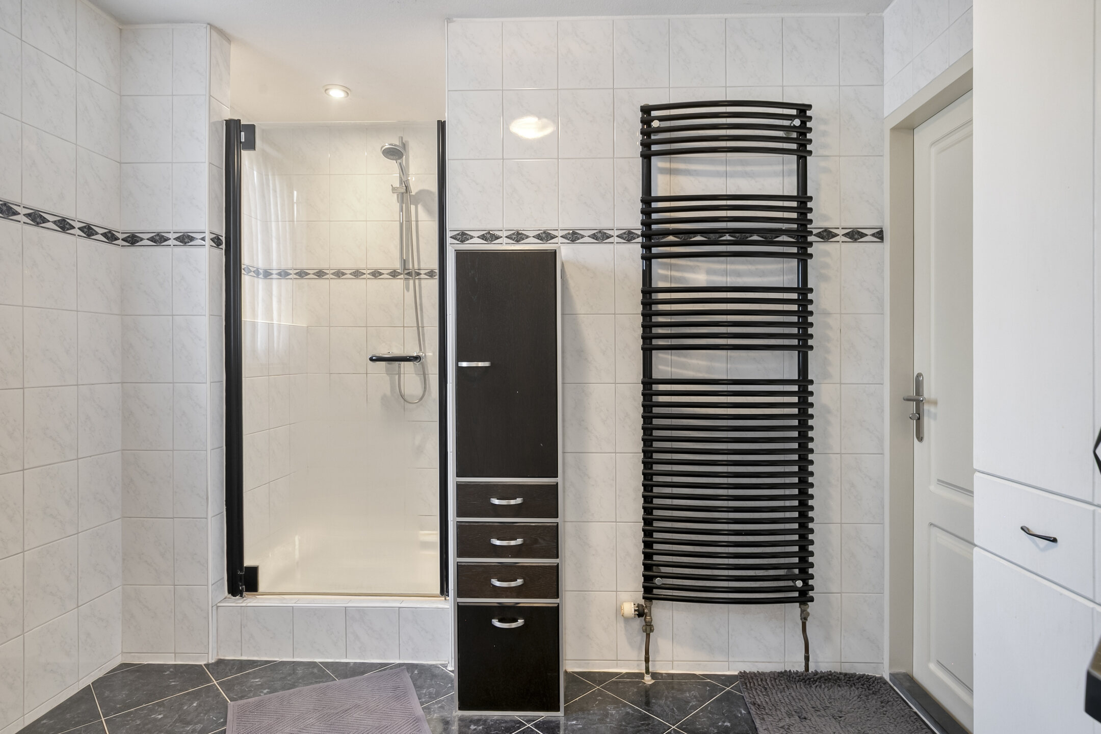 – De badkamer volledig betegeld is en voorzien is van comfortabele vloerverwarming, een ligbad, een douchecabine, een badkamermeubel met wastafel en een designradiator;