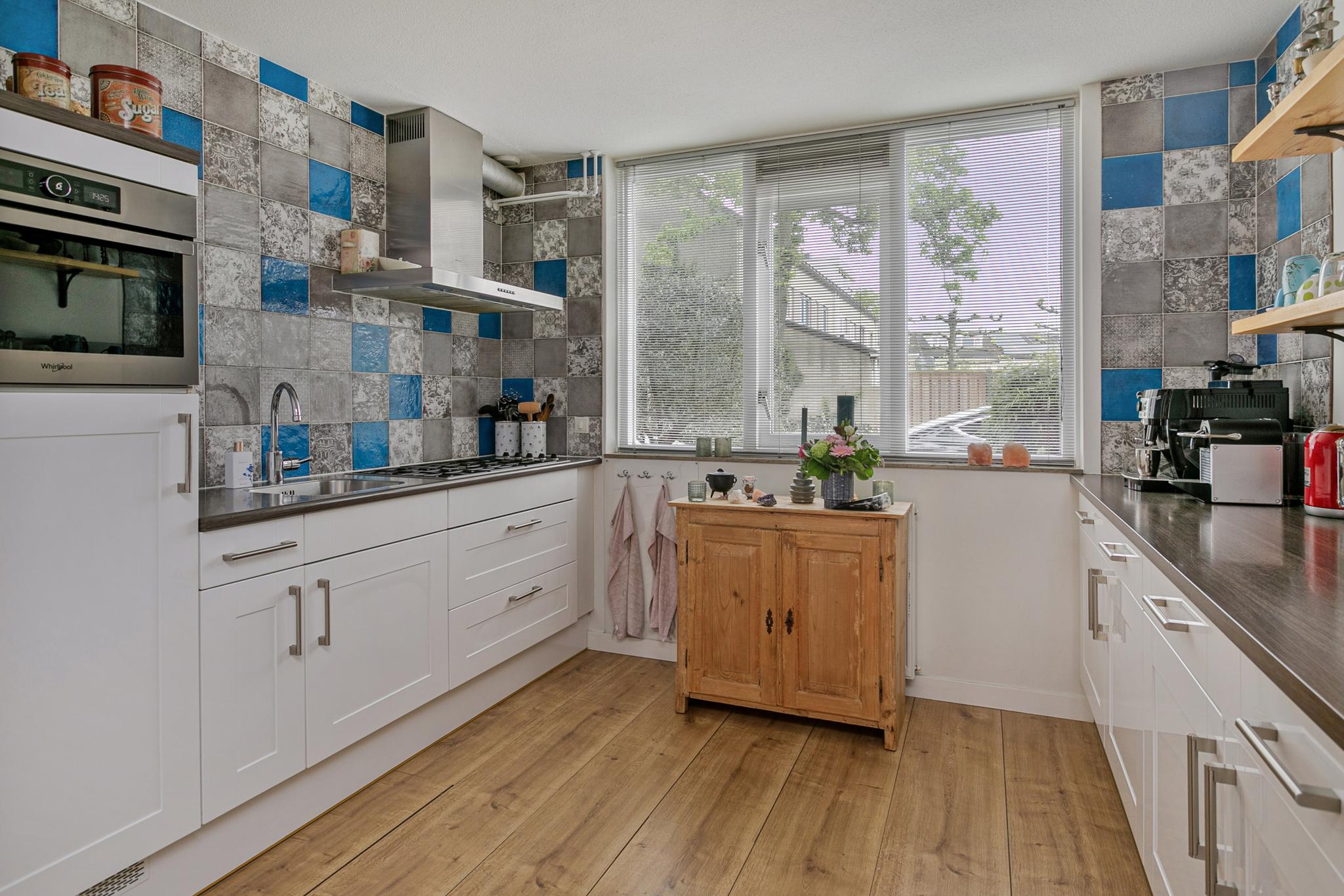 – de half open keuken in rechte opstelling (aan weerszijden) volledig is betegeld en beschikt over veel opbergruimte en inbouwapparatuur, te weten: een 5-pits gaskookplaat, afzuigkap (2016), combi-magnetron (2023) en een koelkast;