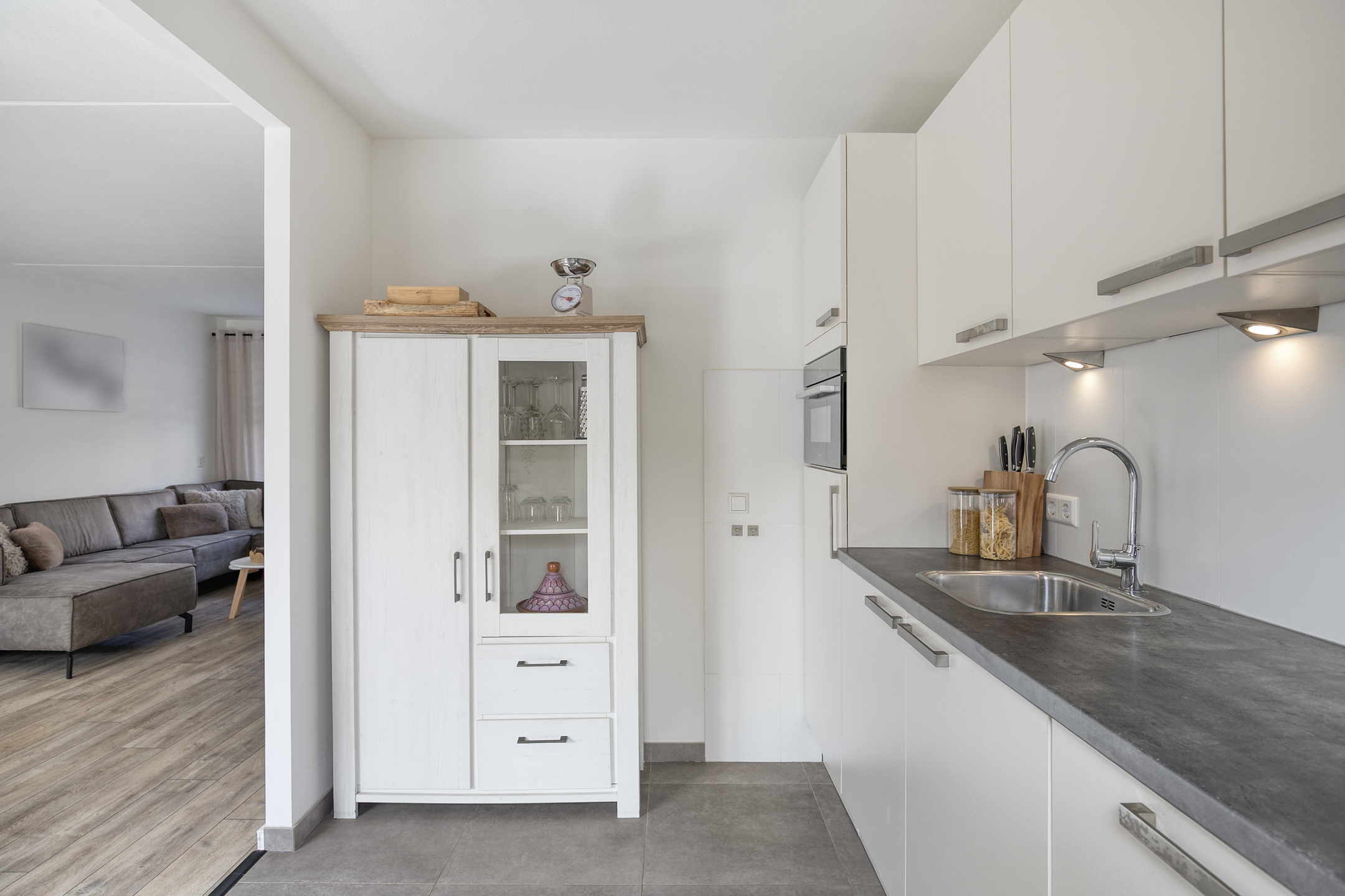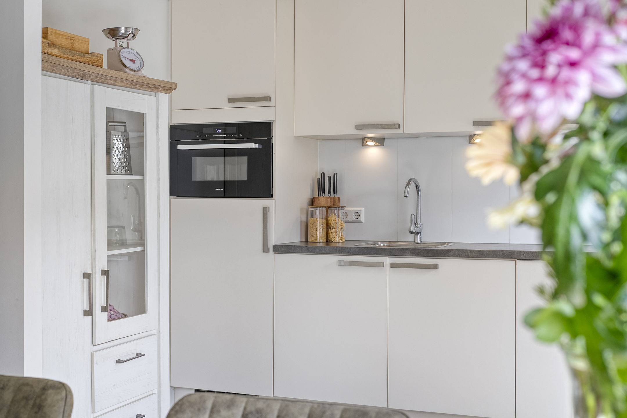 – de moderne open keuken is uitgevoerd in een rechte opstelling en voorzien van inbouwapparatuur, waaronder een 4-pits gaskookplaat, afzuigkap, koelkast, combi-oven en vaatwasser;