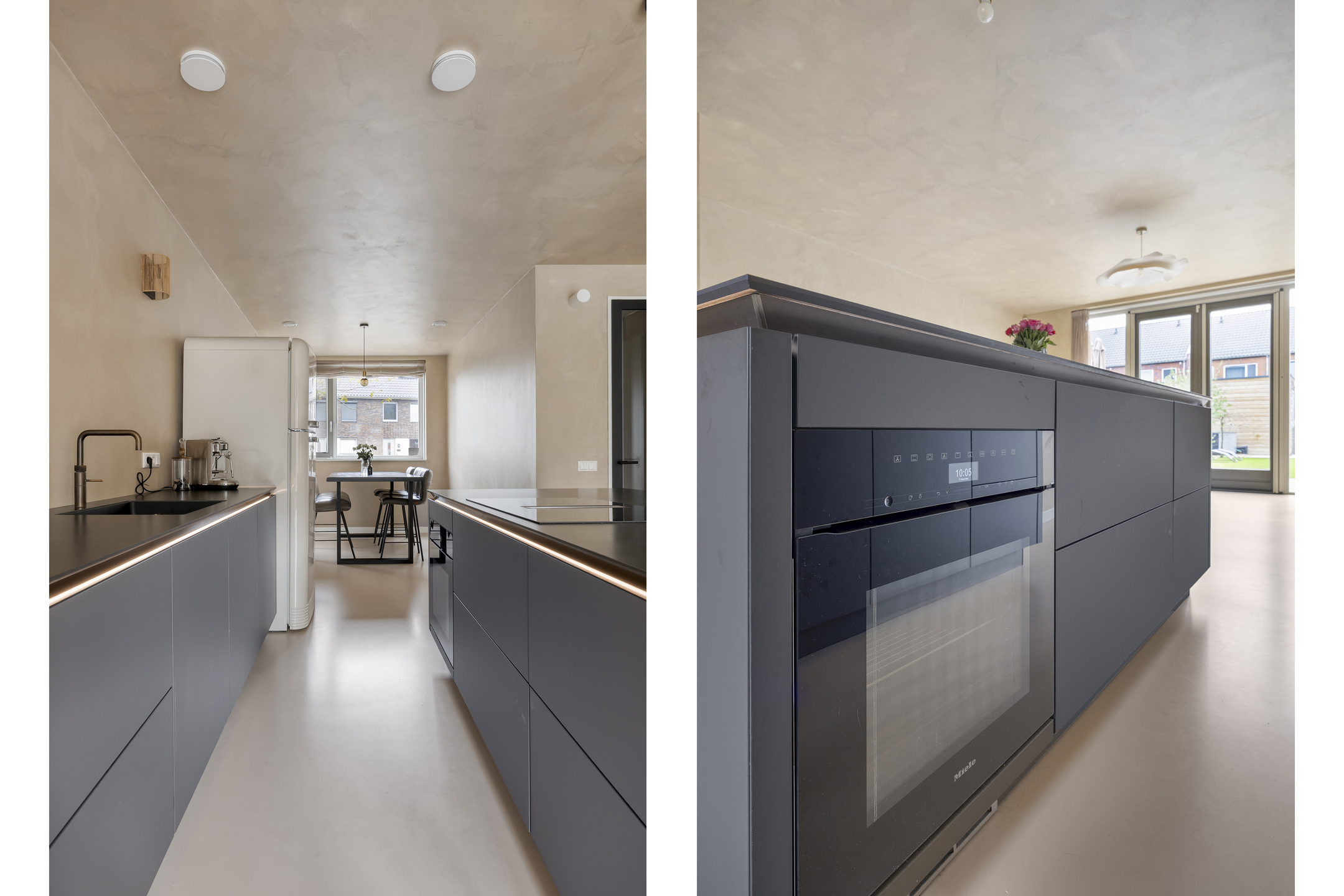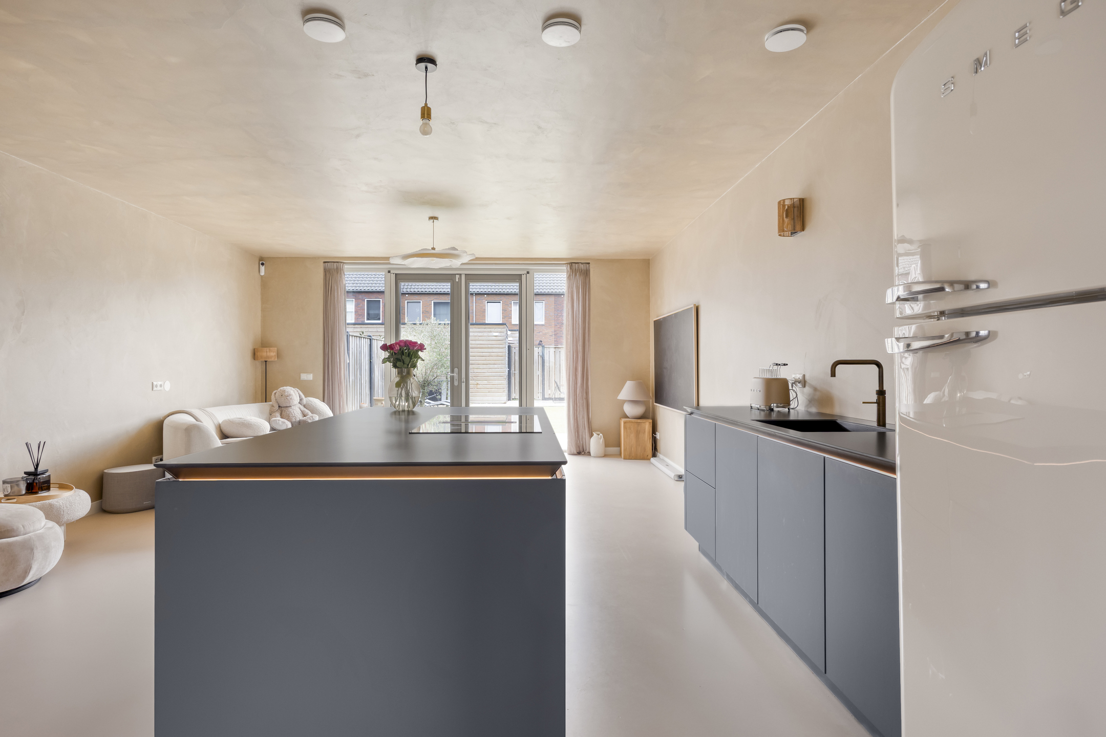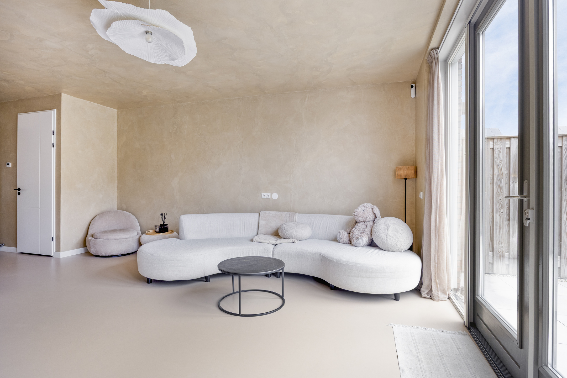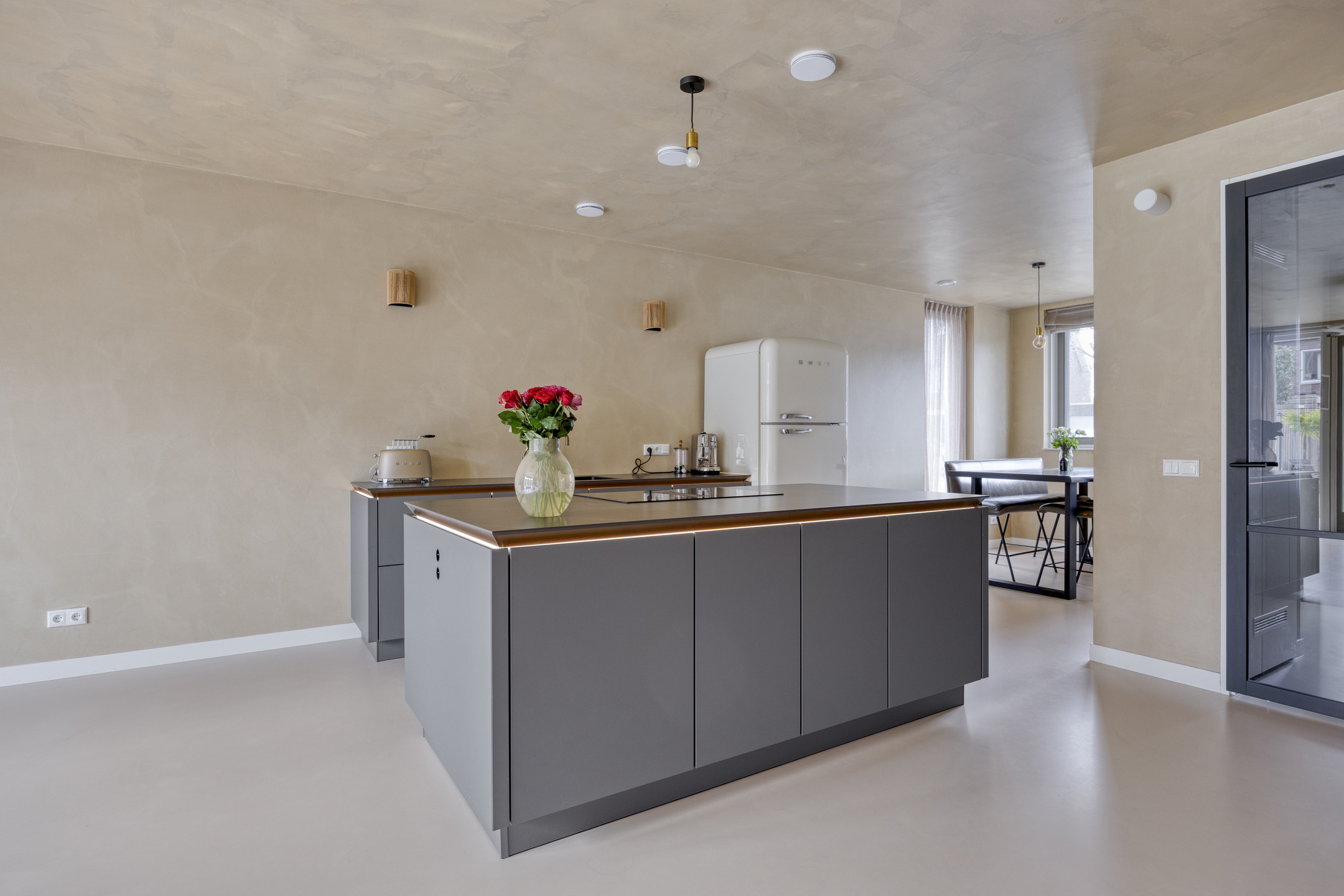 – de begane grond een stijlvolle basis heeft met beton ciré stucwerk en een strakke gietvloer, precies zo’n afwerking waar je zelf niets meer aan hoeft te doen;