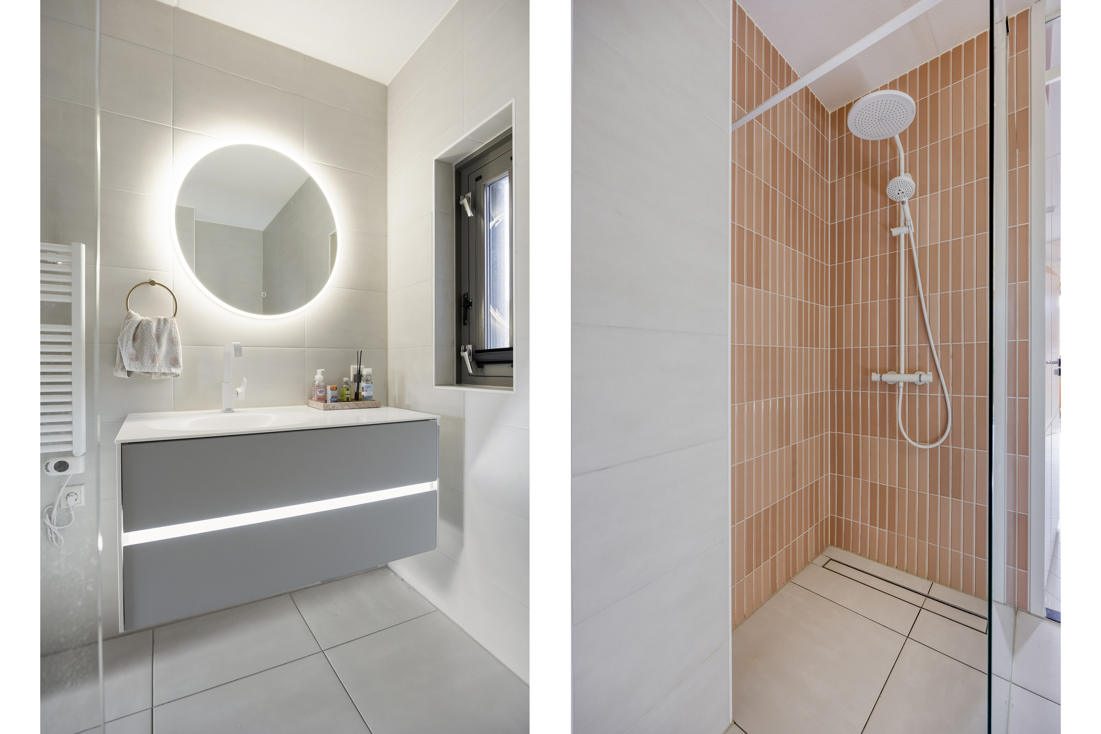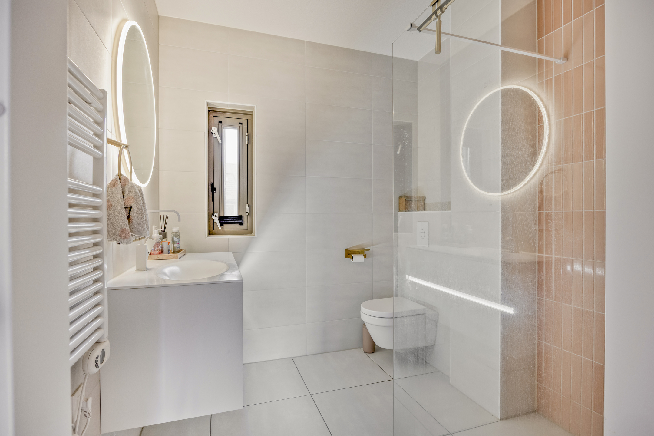 – de badkamer oogt fris en modern met een inloopdouche, strak wastafelmeubel, wandcloset, luxe spiegel en een designradiator;