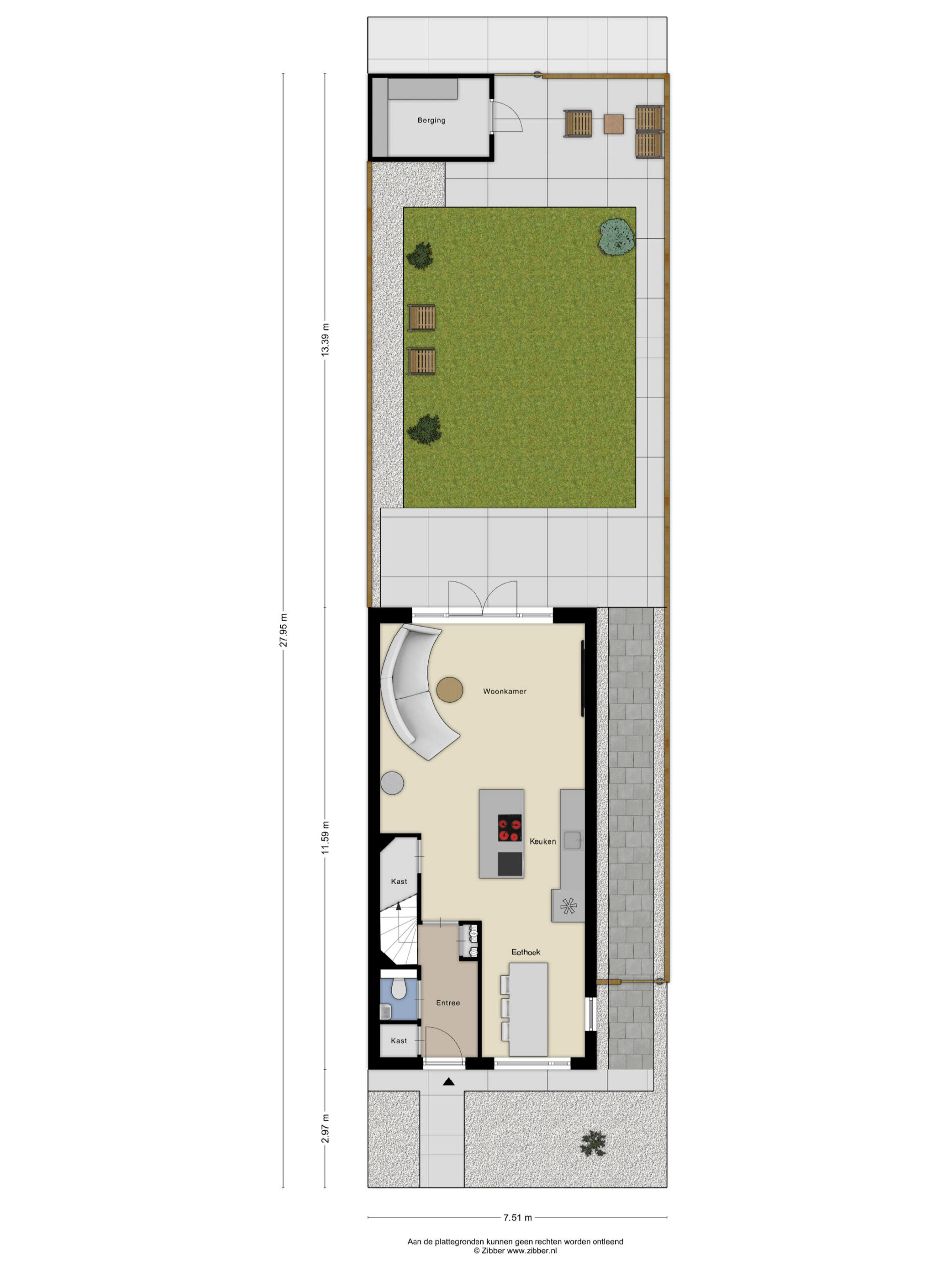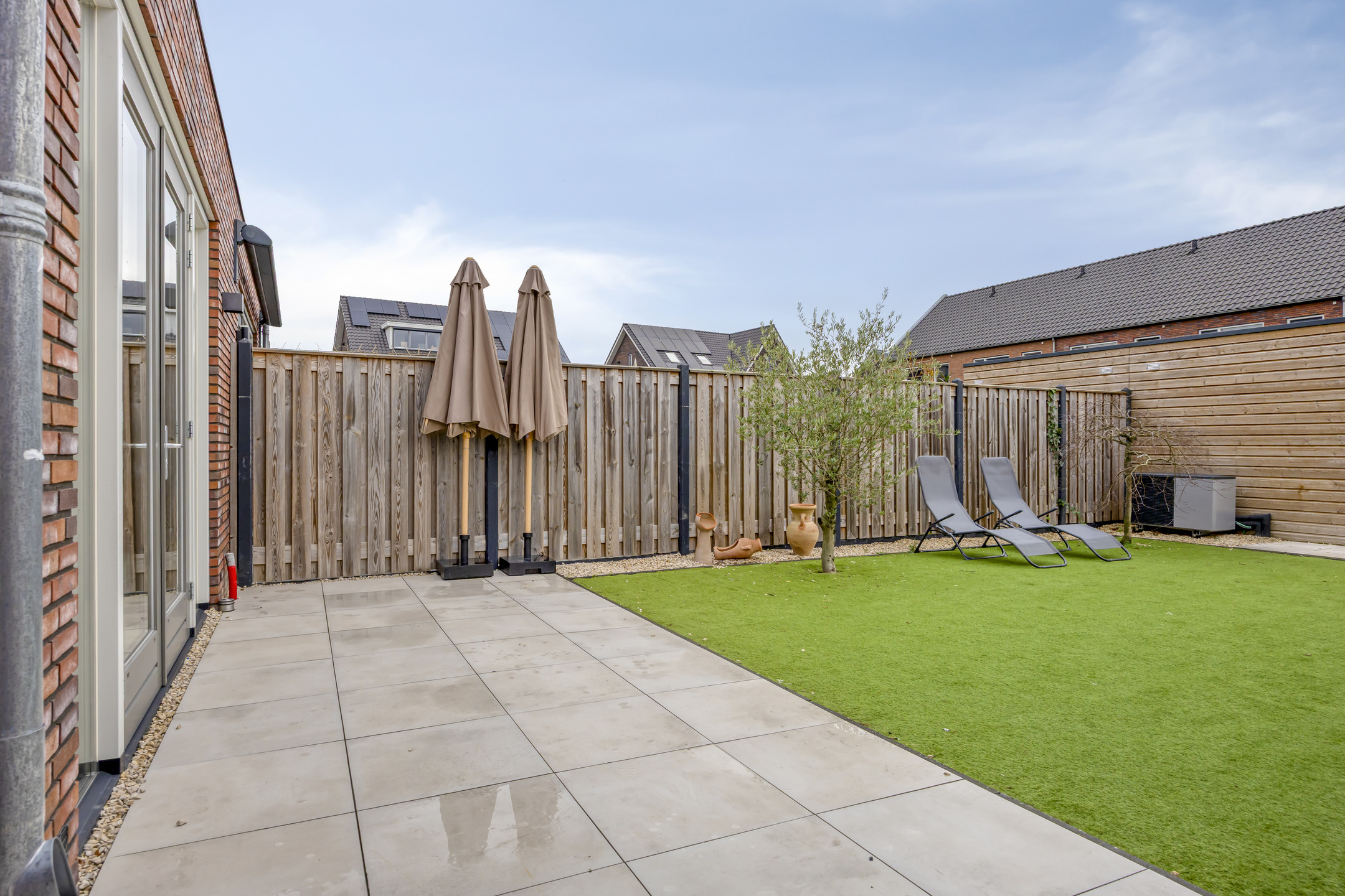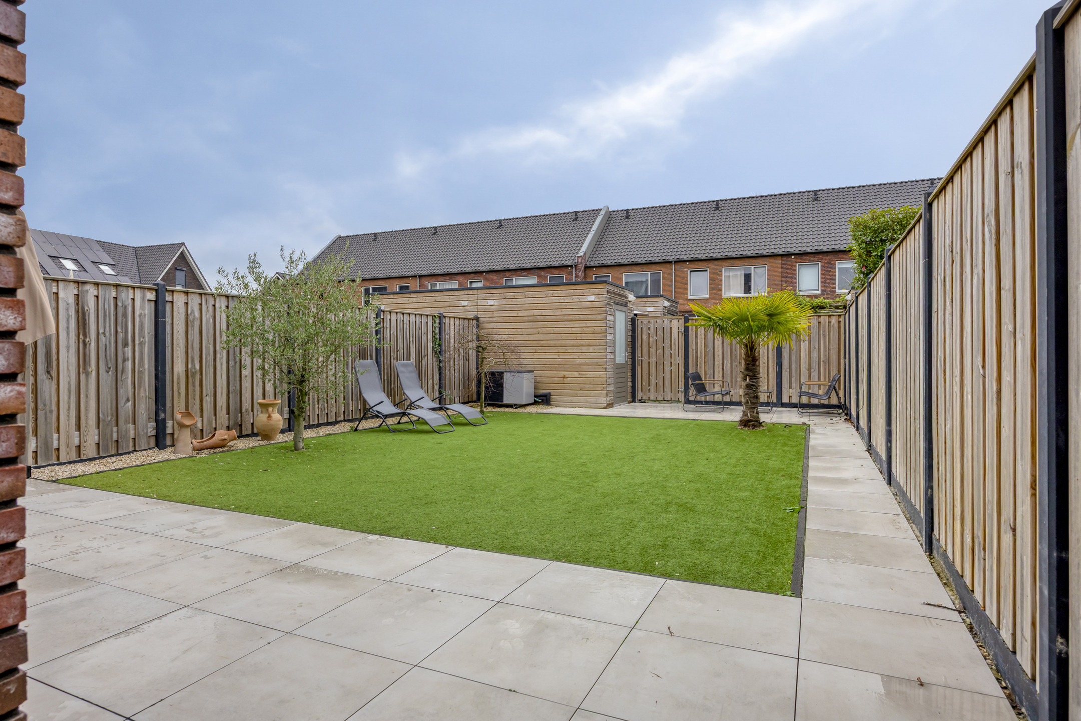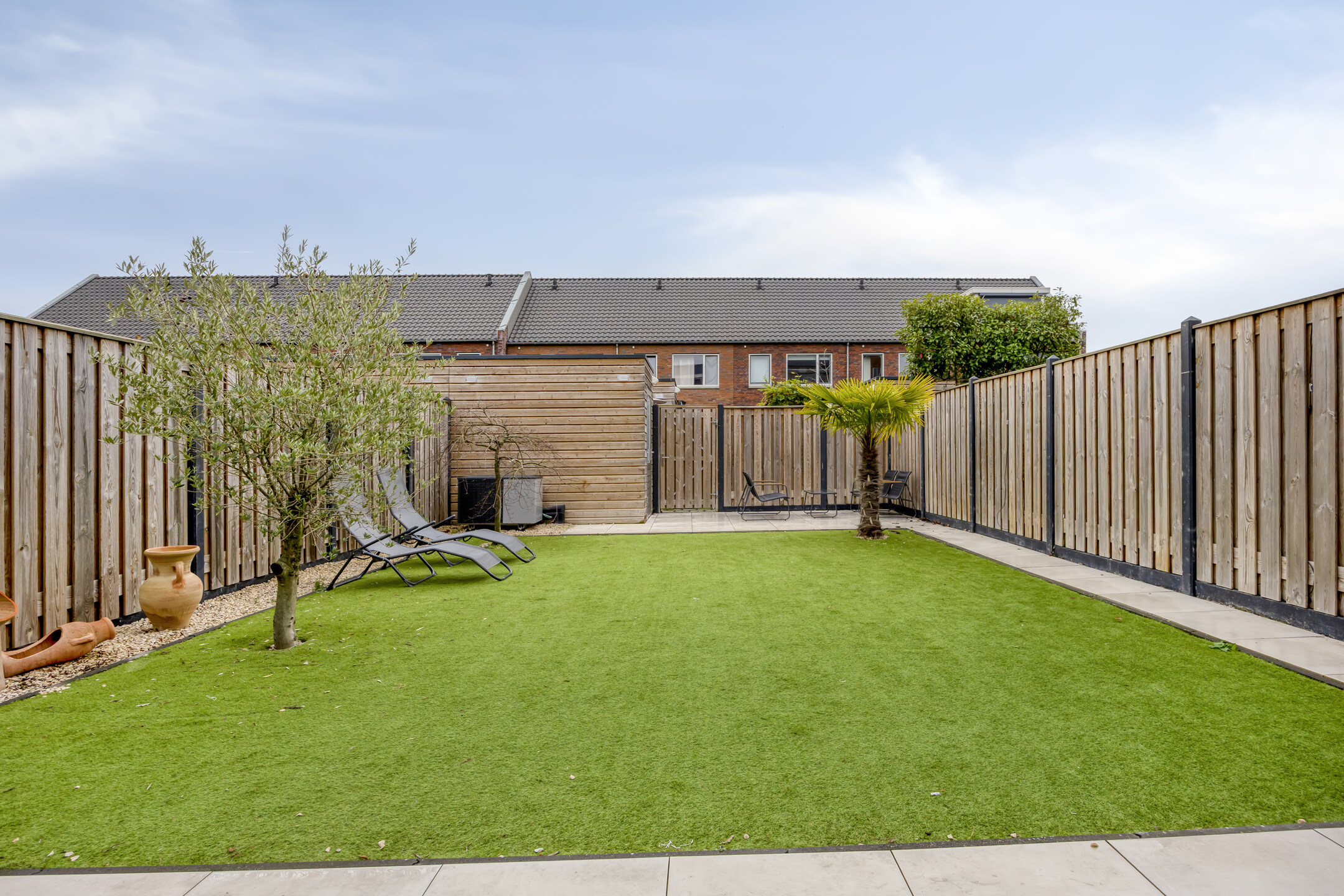– de achtertuin op het zuidoosten ruim en compleet is aangelegd met grote terrastegels, onderhoudsvriendelijk kunstgras, een vrijstaande houten berging, meerdere zitplekken, ideaal voor loungen of lange zomeravonden;