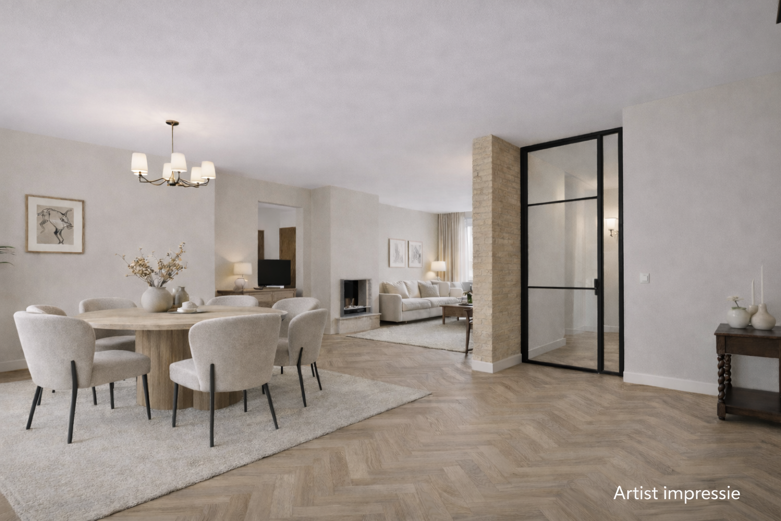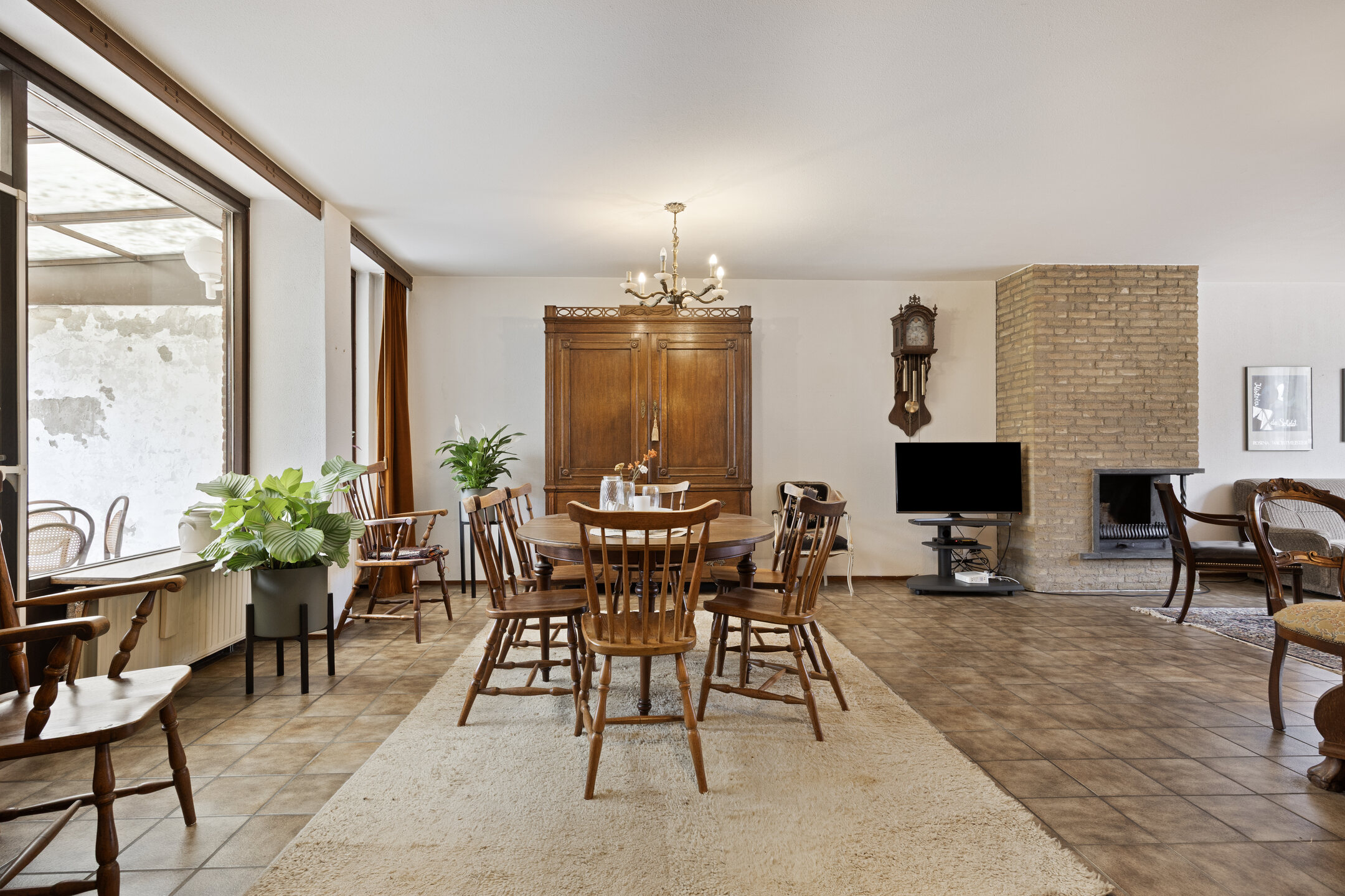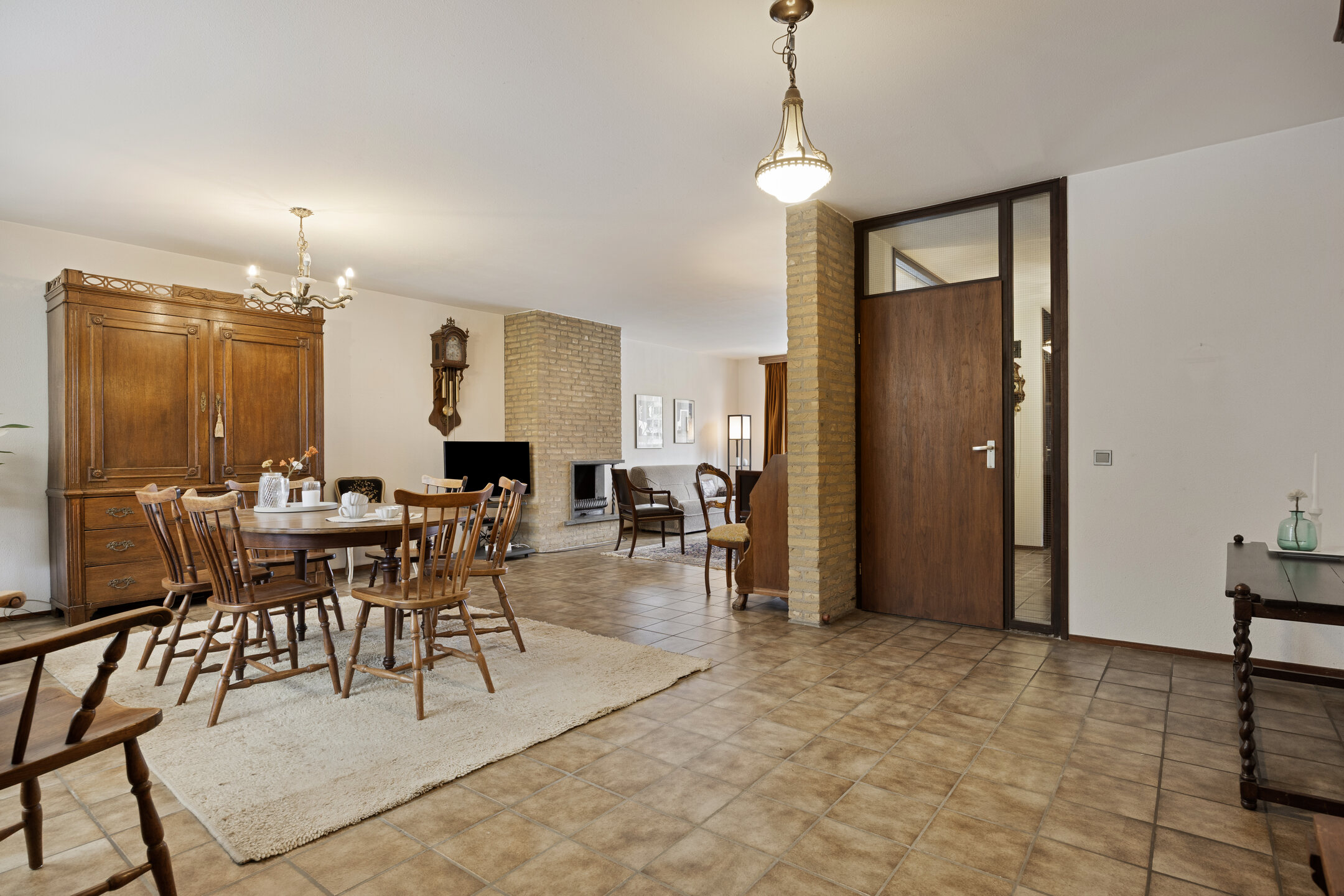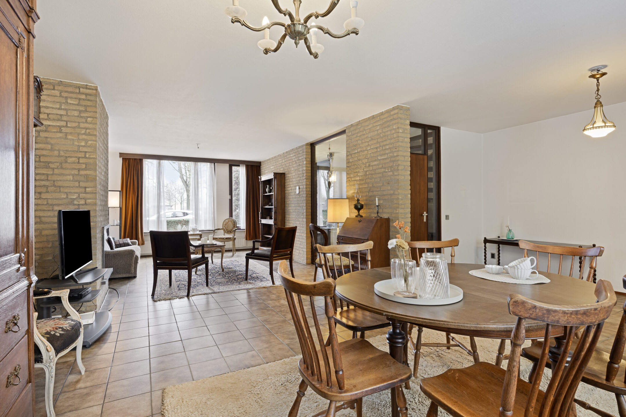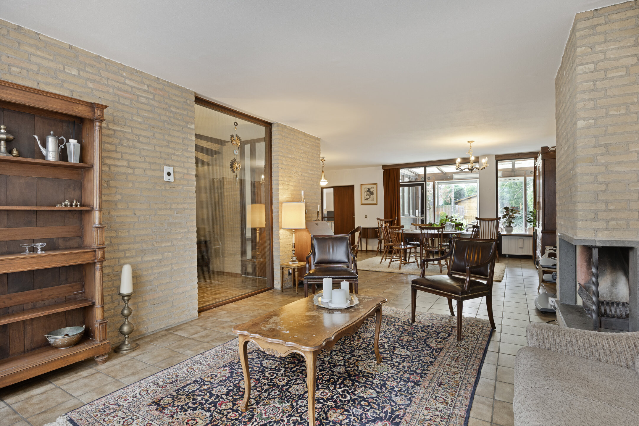 – de woonkamer royaal van opzet is, beschikt over prettig lichtinval en is afgewerkt met een tegelvloer, gedeeltelijk gestucte wanden en deels zichtbare bakstenen wanden;