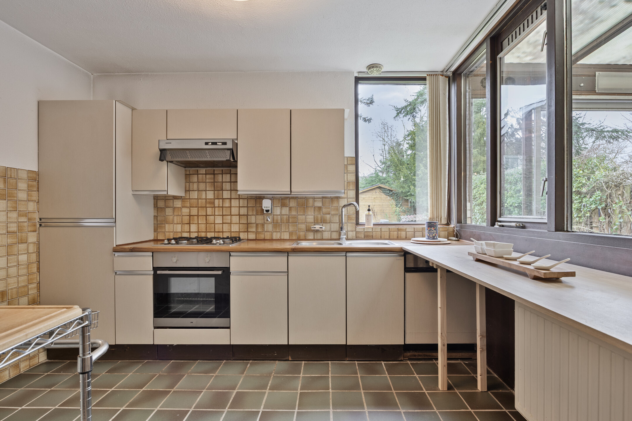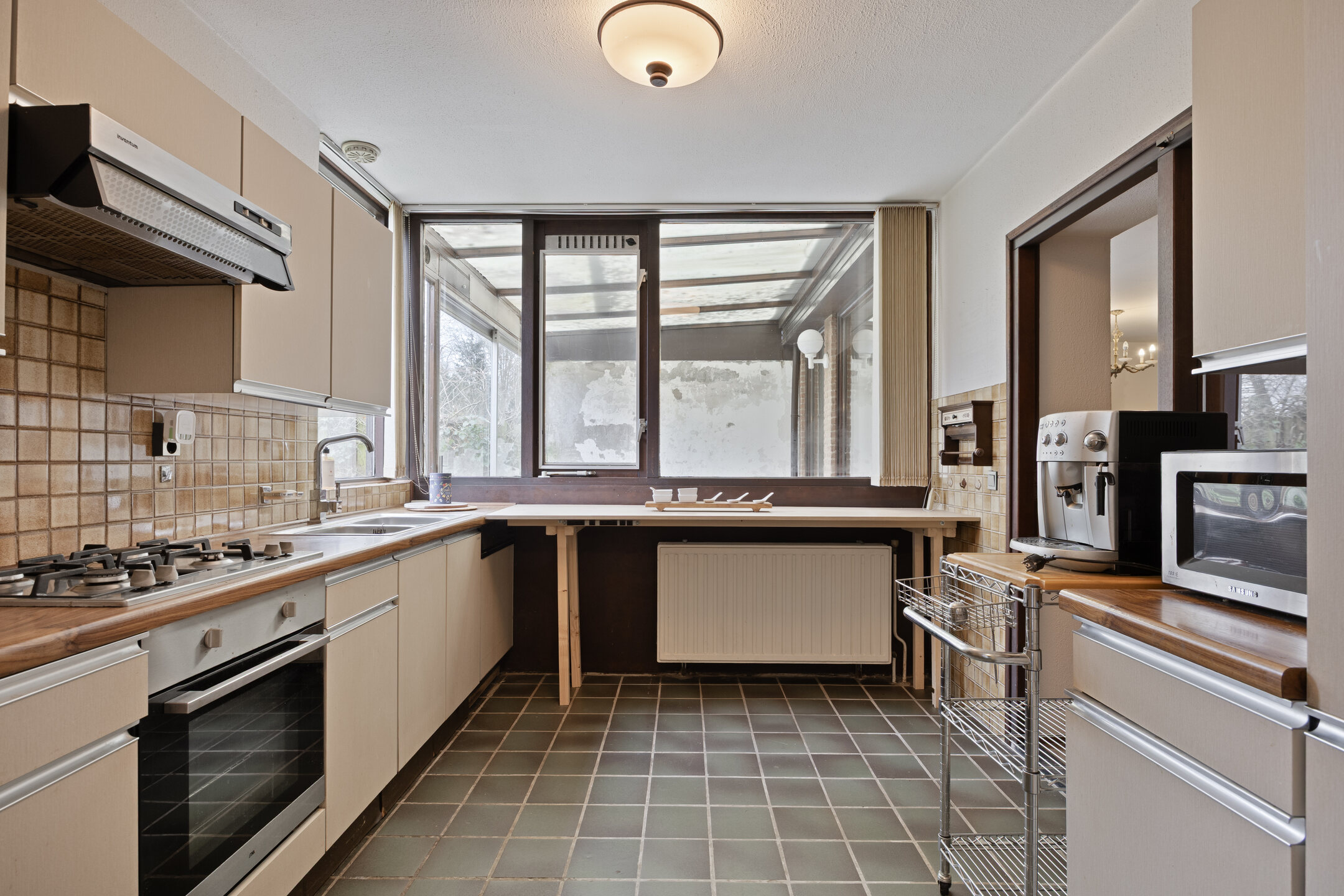 – de keuken in originele staat verkeert en is uitgerust met een gaskookplaat, oven, afzuigkap, koelkast en vaatwasser;