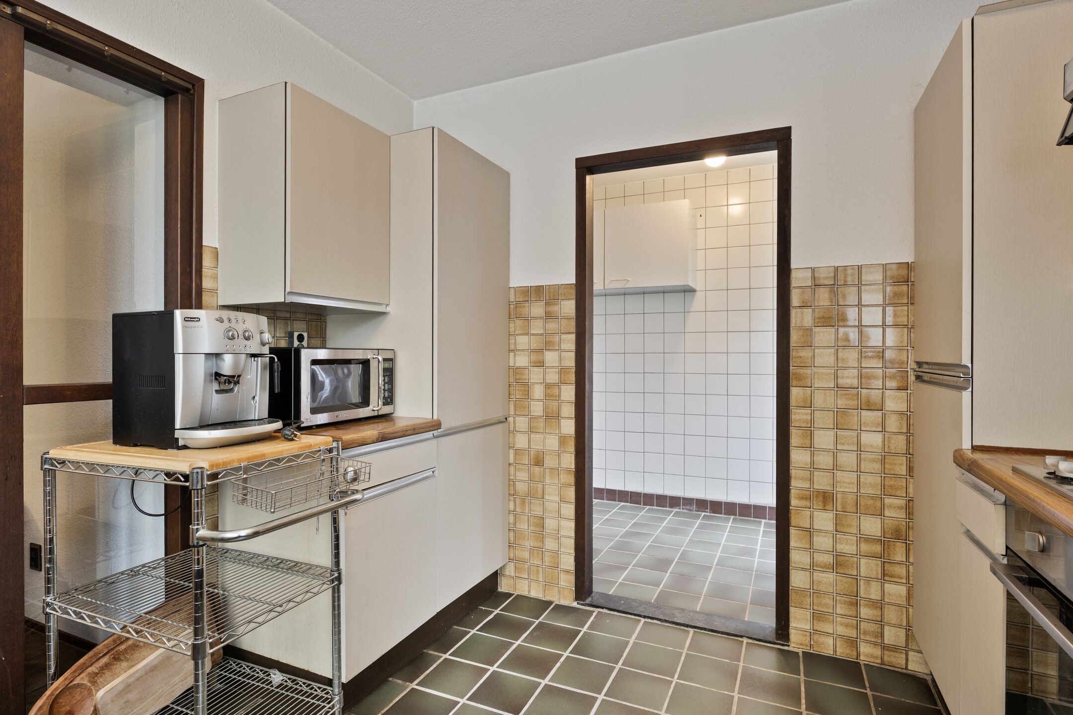 – de keuken gedeeltelijk is gestuct en betegeld en aansluit op de volledig betegelde bijkeuken;