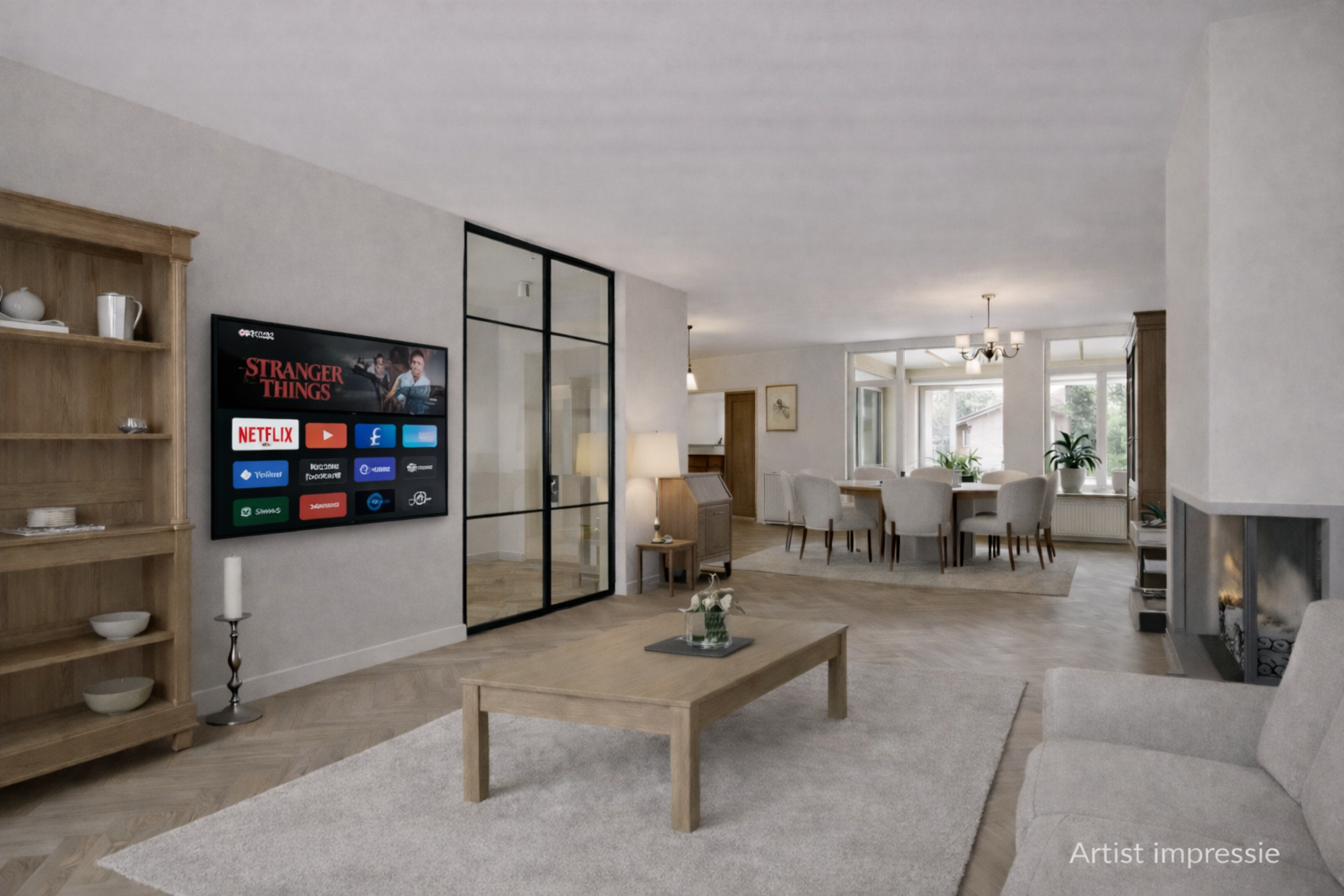 – de eetkamer in open verbinding staat met de woonkamer en zicht biedt op de tuin;