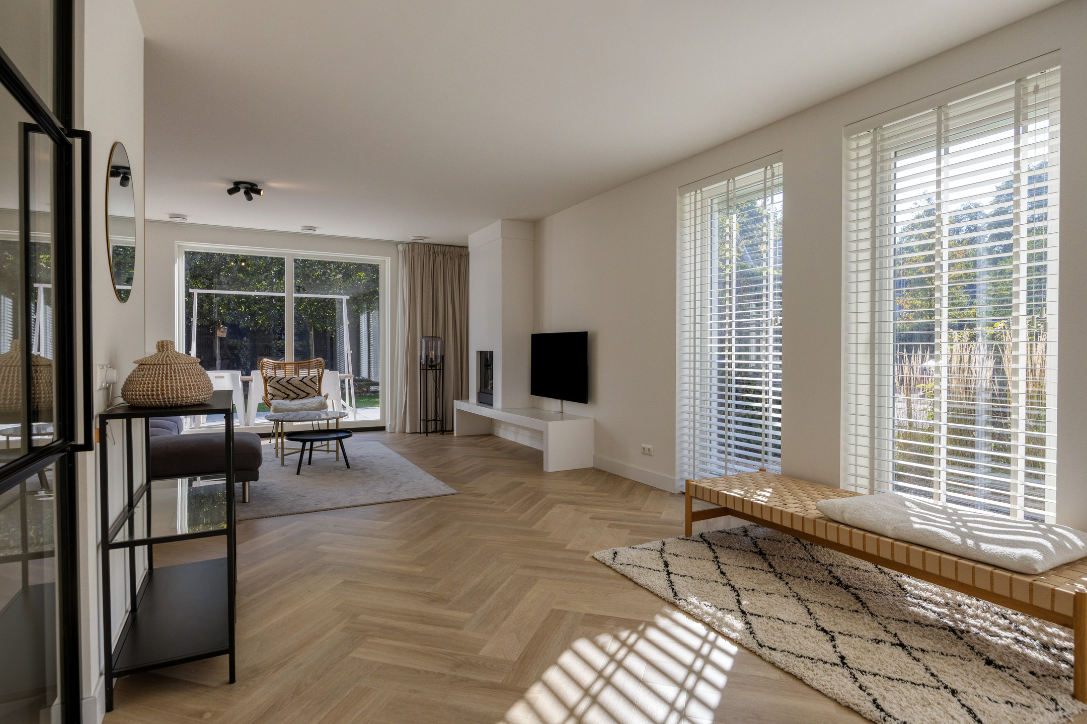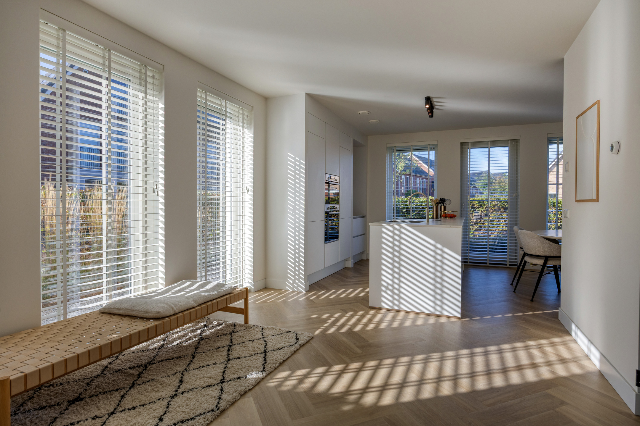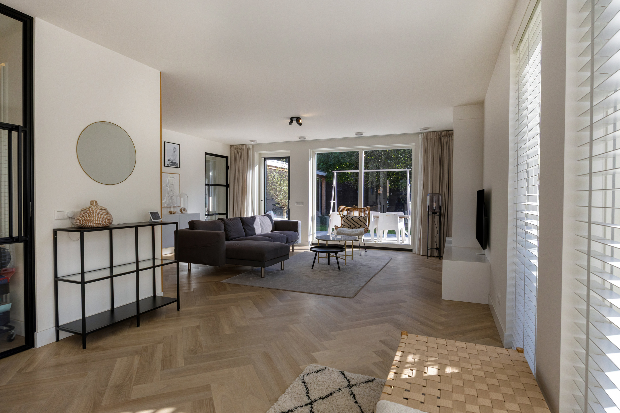– de royale L-vormige woonkamer is opvallend licht dankzij de grote raampartijen en afgewerkt met een fraaie visgraat pvc-vloer met comfortabele vloerverwarming, een strakke wandafwerking en een stucwerk plafond;