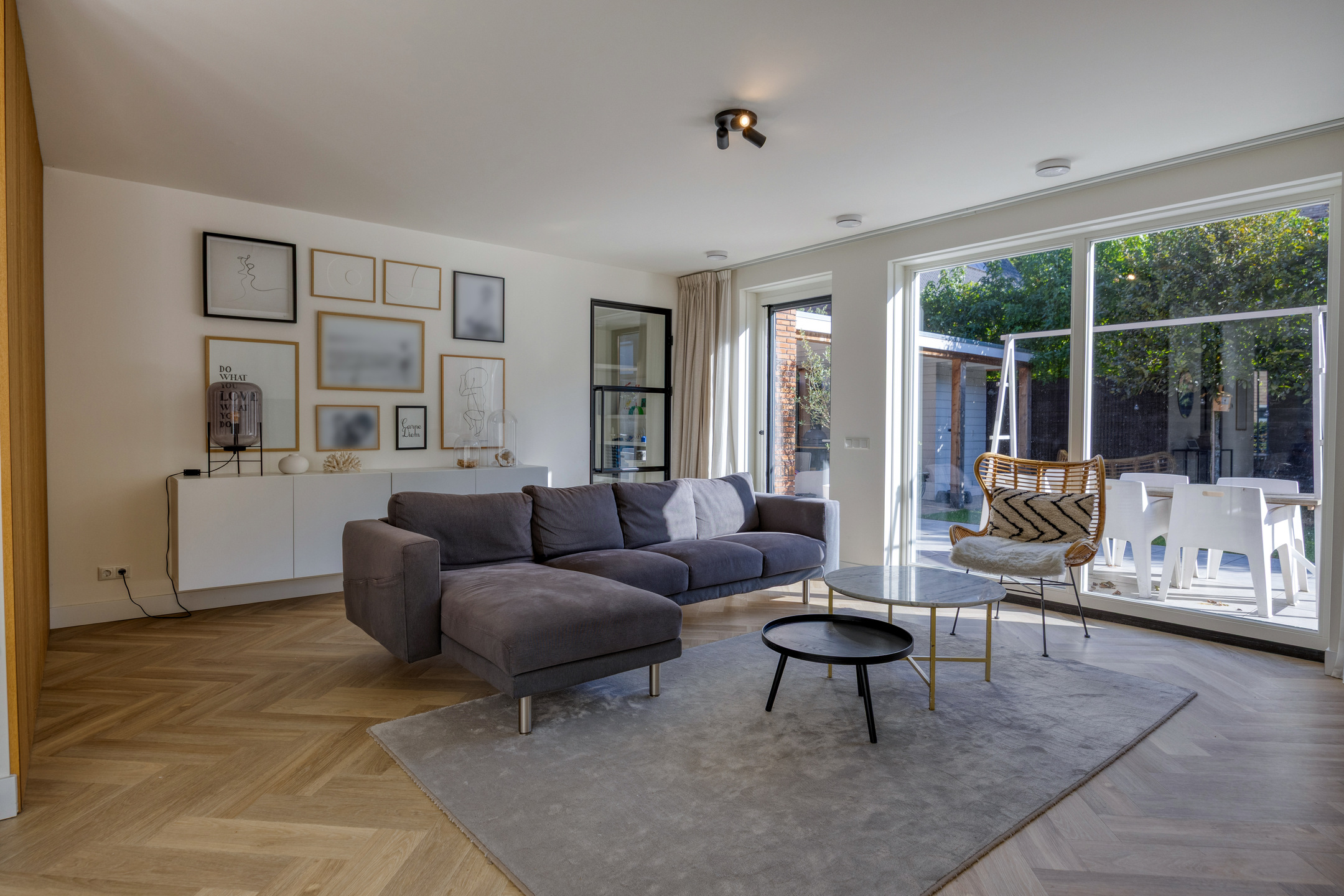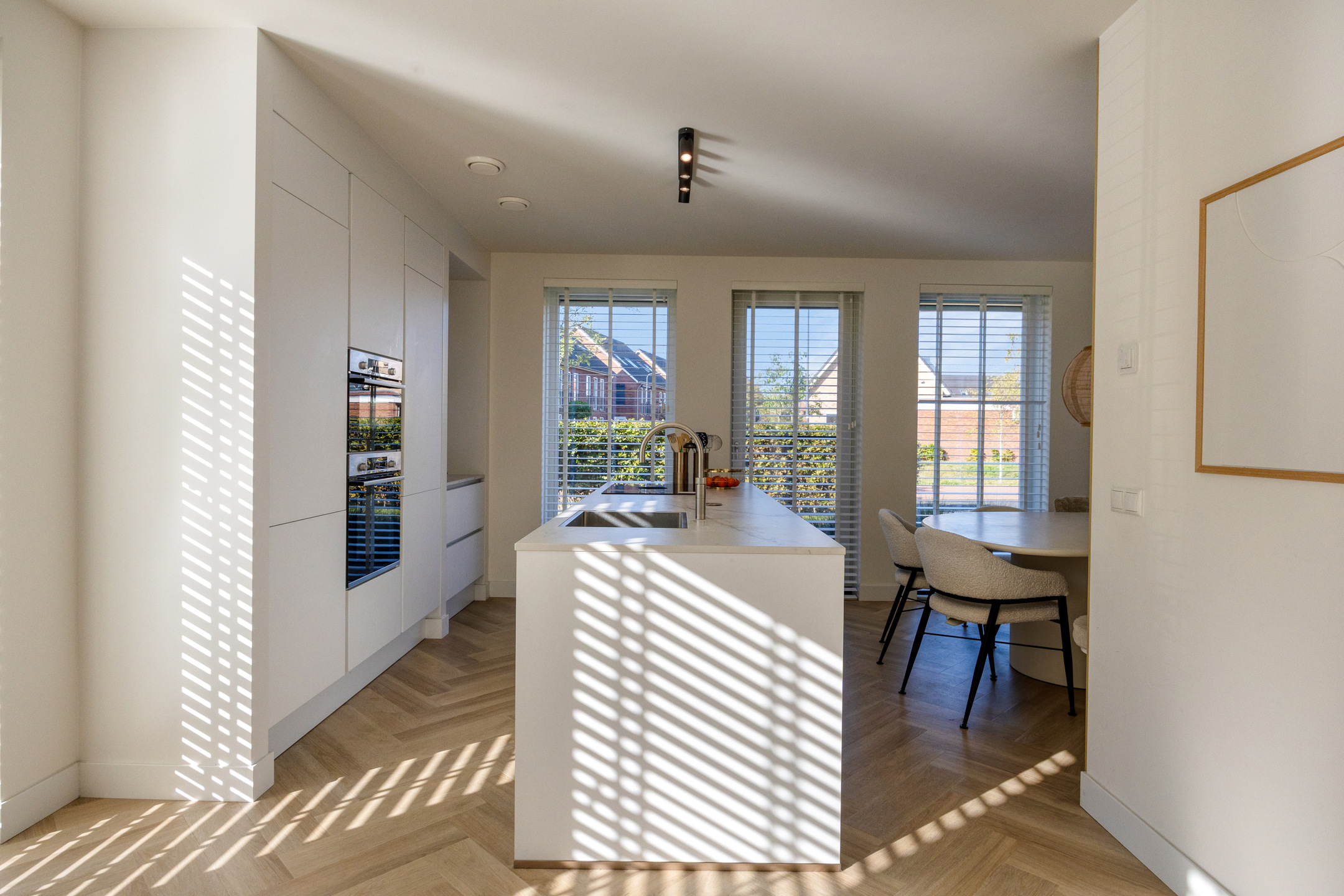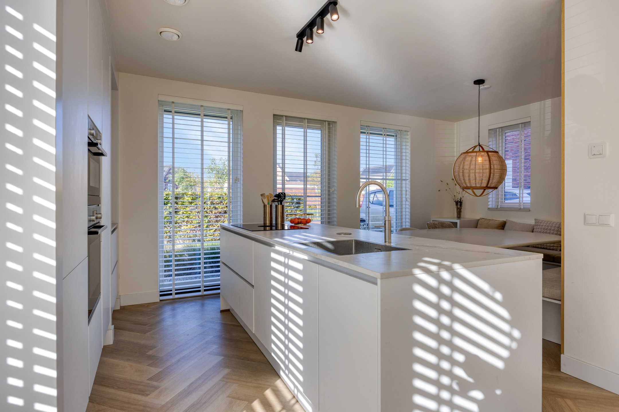 – de royale L-vormige woonkamer is opvallend licht dankzij de grote raampartijen en afgewerkt met een fraaie visgraat pvc-vloer met comfortabele vloerverwarming, een strakke wandafwerking en een stucwerk plafond;
