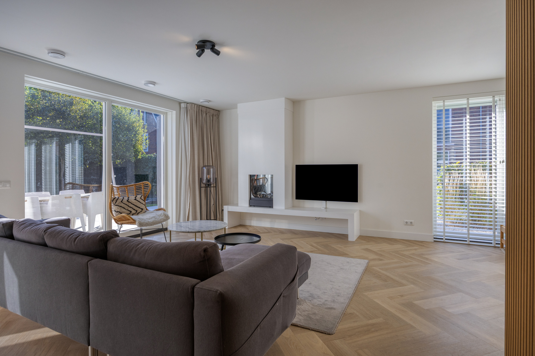 – een strakke schouw met elektrische sfeerhaard maakt het plaatje compleet;