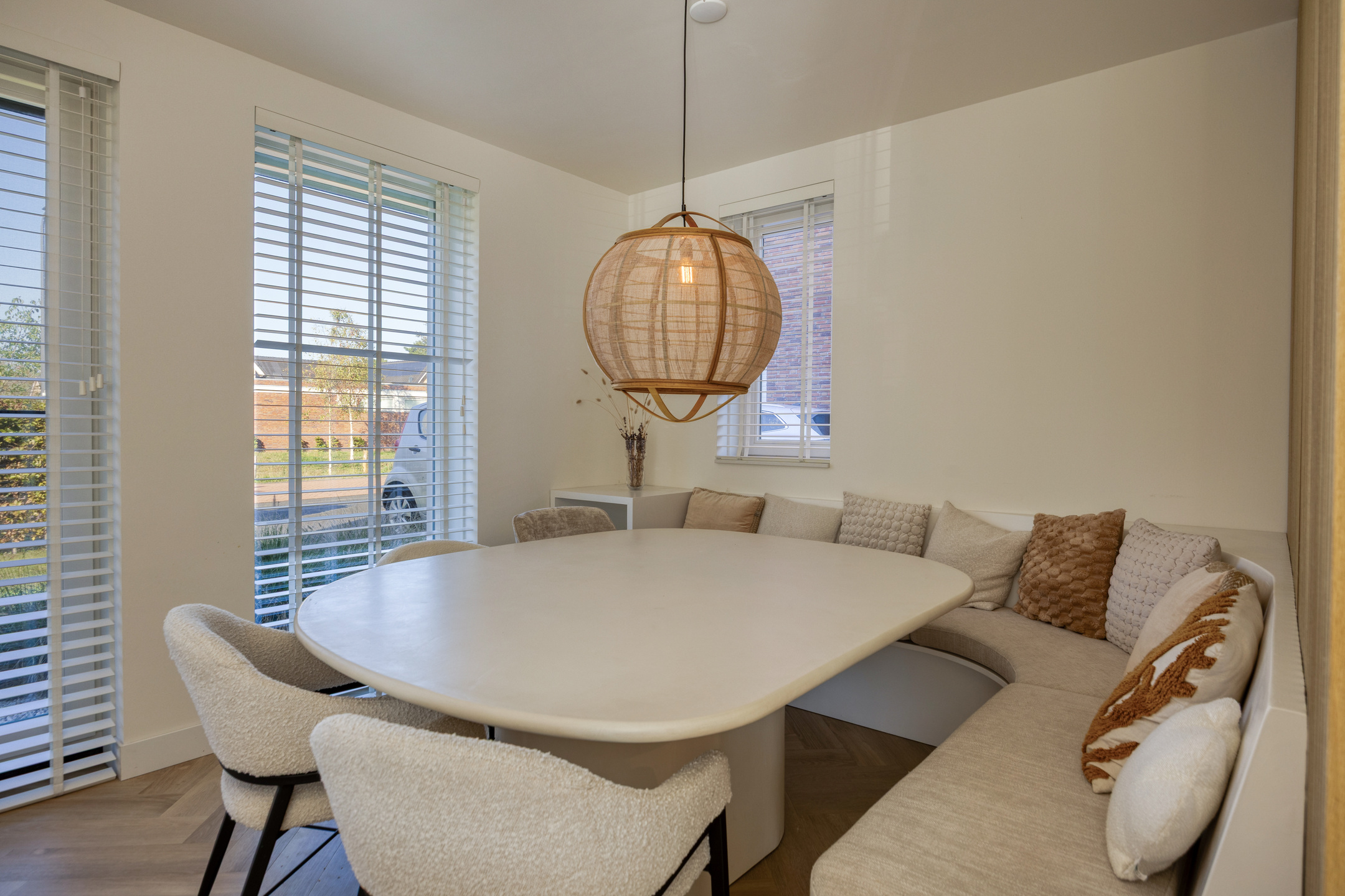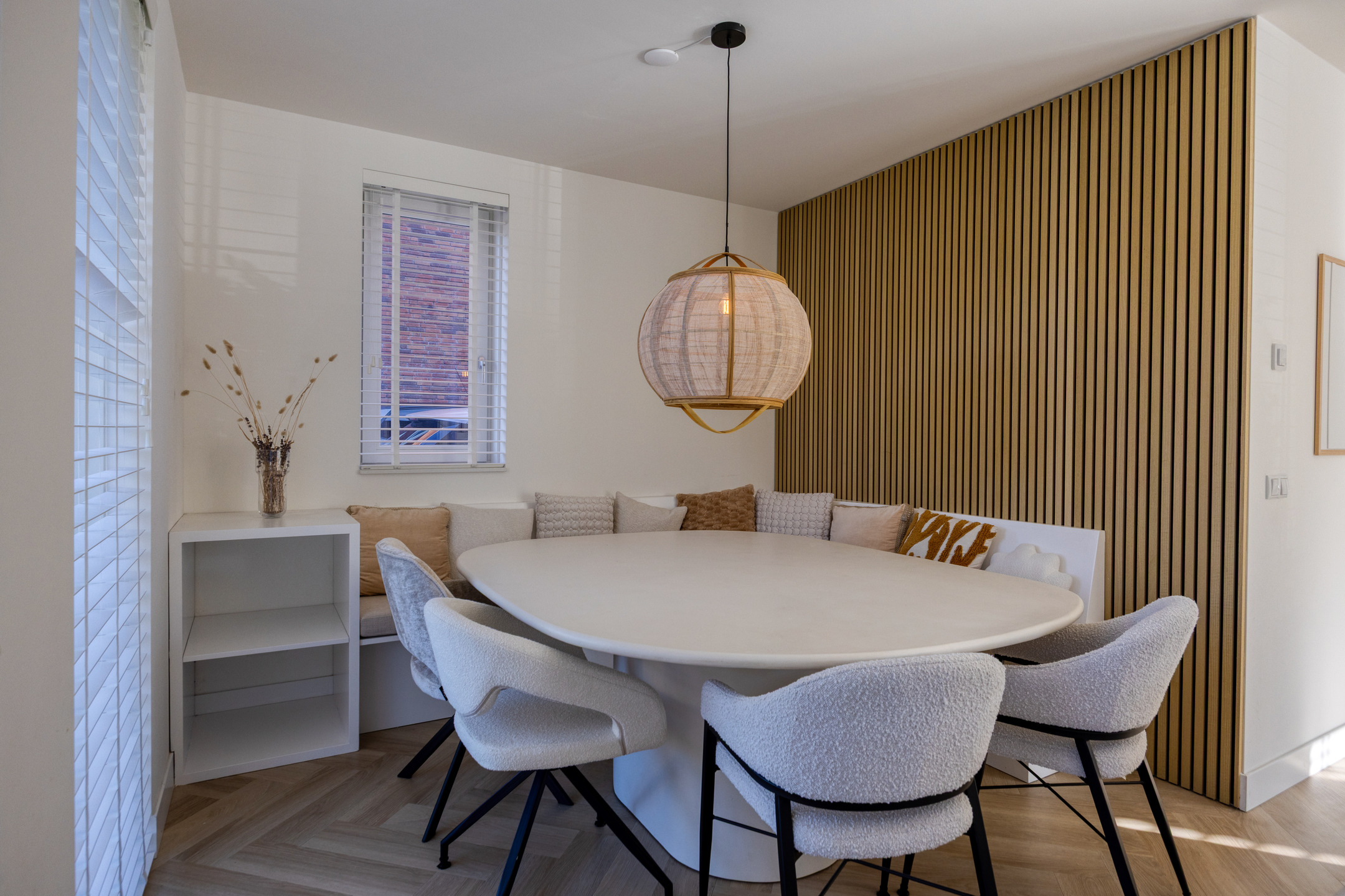 – de eethoek is sfeervol ingericht met een vaste, op maat gemaakte hoekbank en een houten lamellenwand;