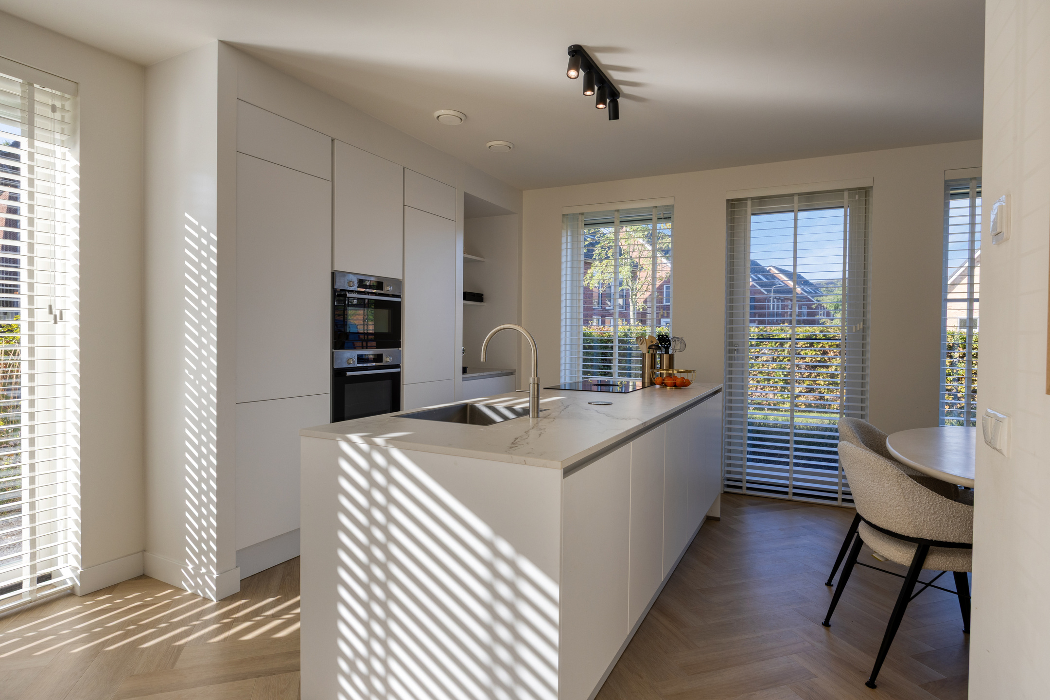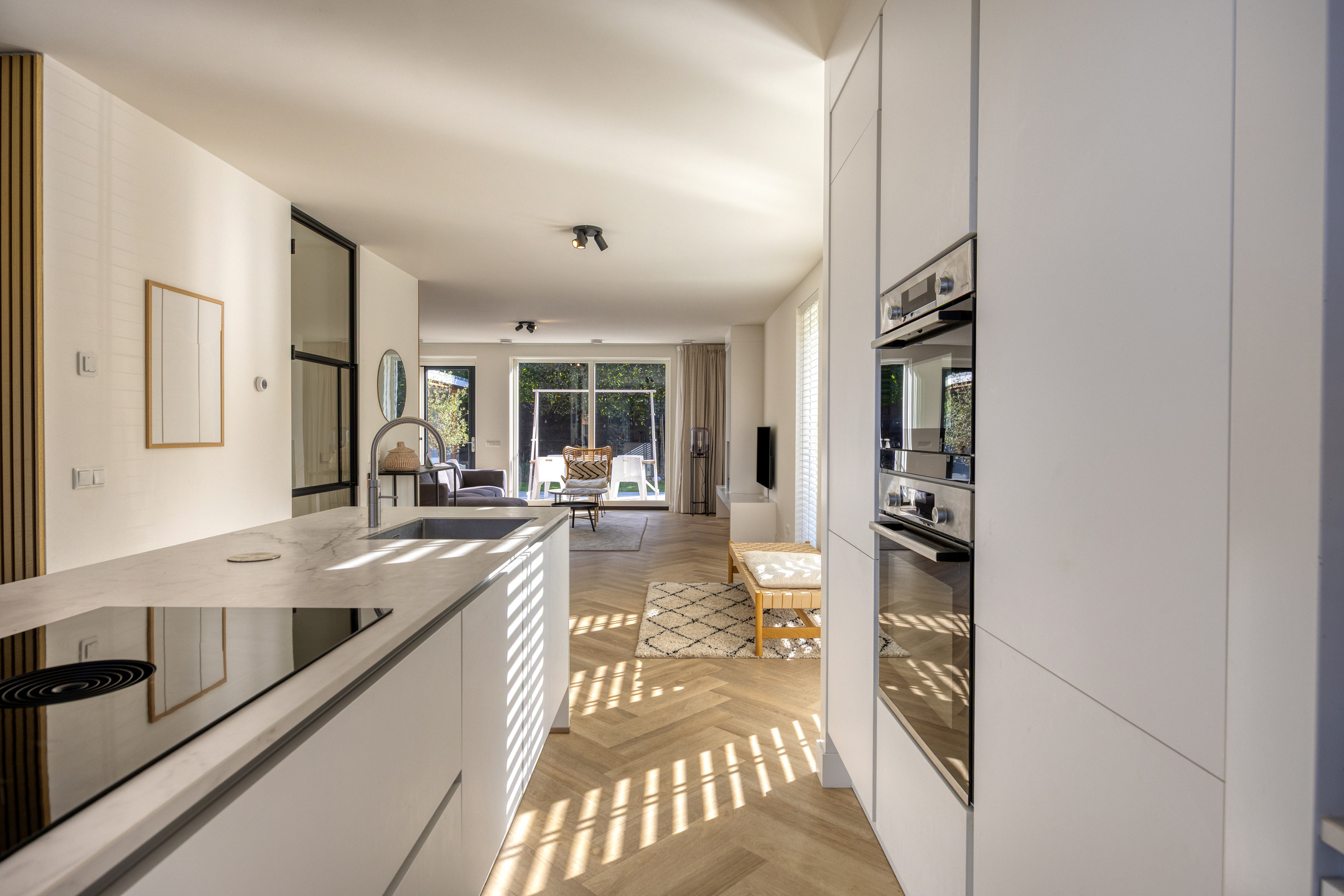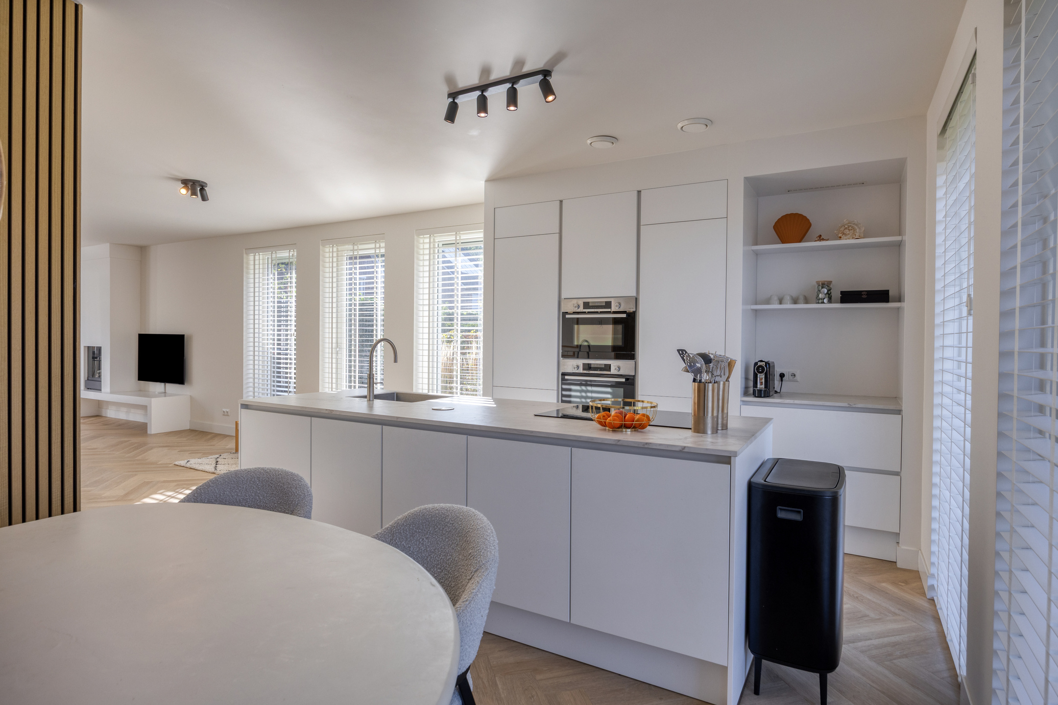 – de open keuken is voorzien van een luxe keukeninrichting met kookeiland voorzien van een composieten werkblad en een ingebouwde inductie kookplaat met afzuiging (Bora), de vaatwasser en een Quooker;