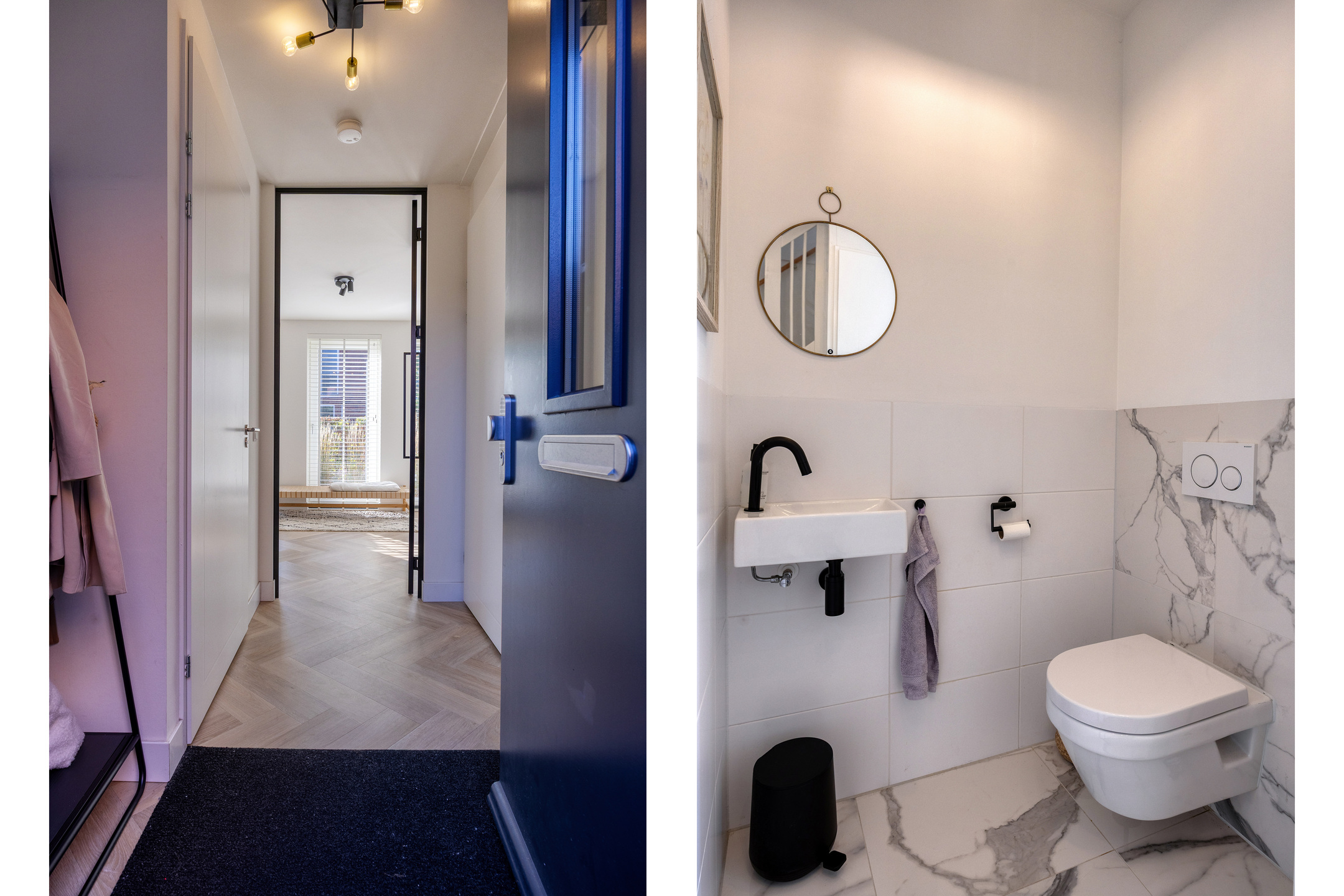 – de entree biedt toegang tot een garderobenis, de meterkast, de moderne toiletruimte met fonteintje, een trapkast en via een stalen deur tot de woonkamer;