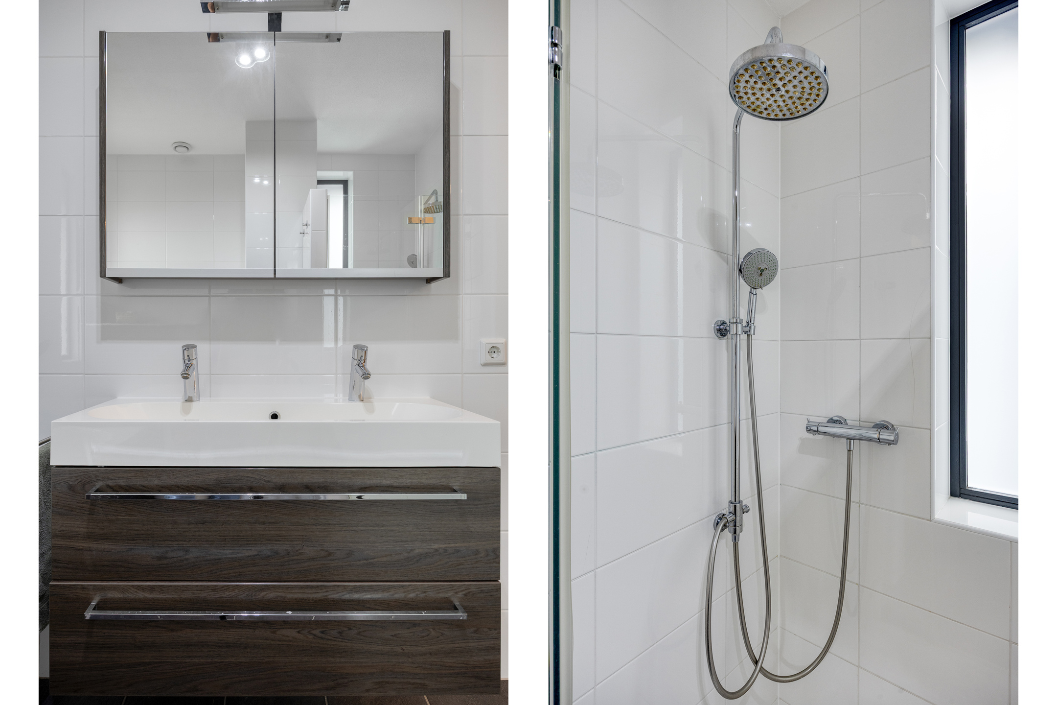 - Badkamervoorzieningen Ligbad, toilet, douche, dubbele wastafel, wastafelmeubel, vloerverwarming