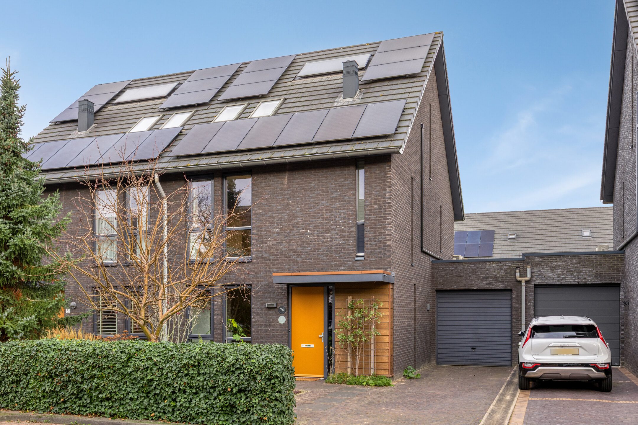 – parkeren kan met 2 auto’s op eigen terrein of op één van de vele parkeerplekken in de straat;