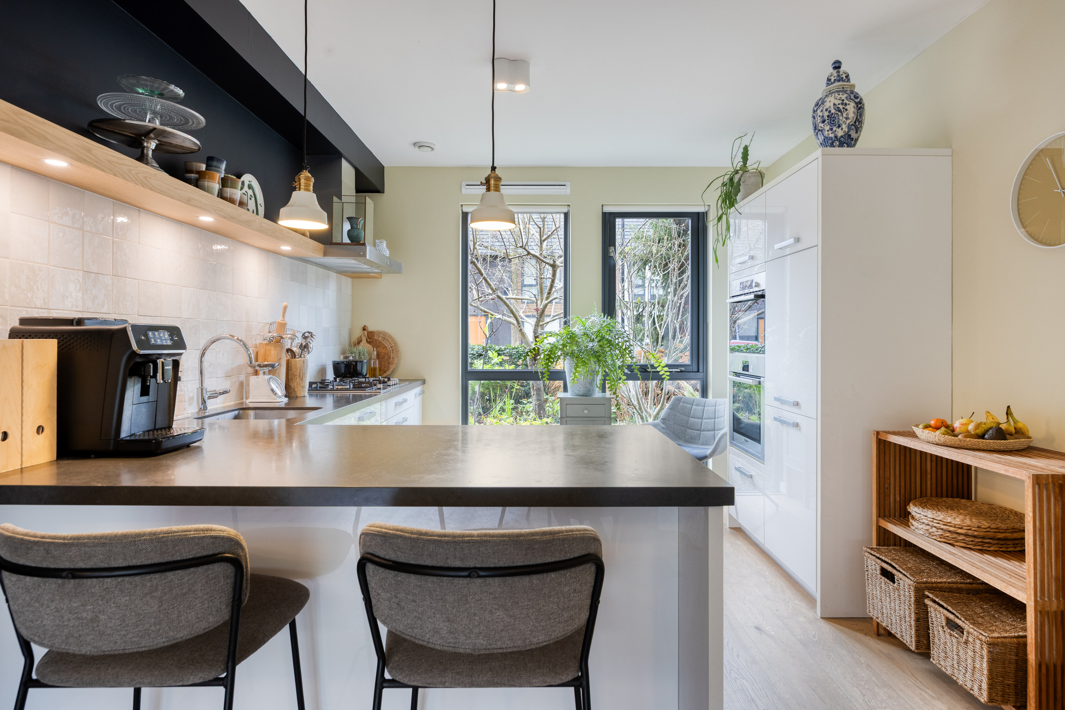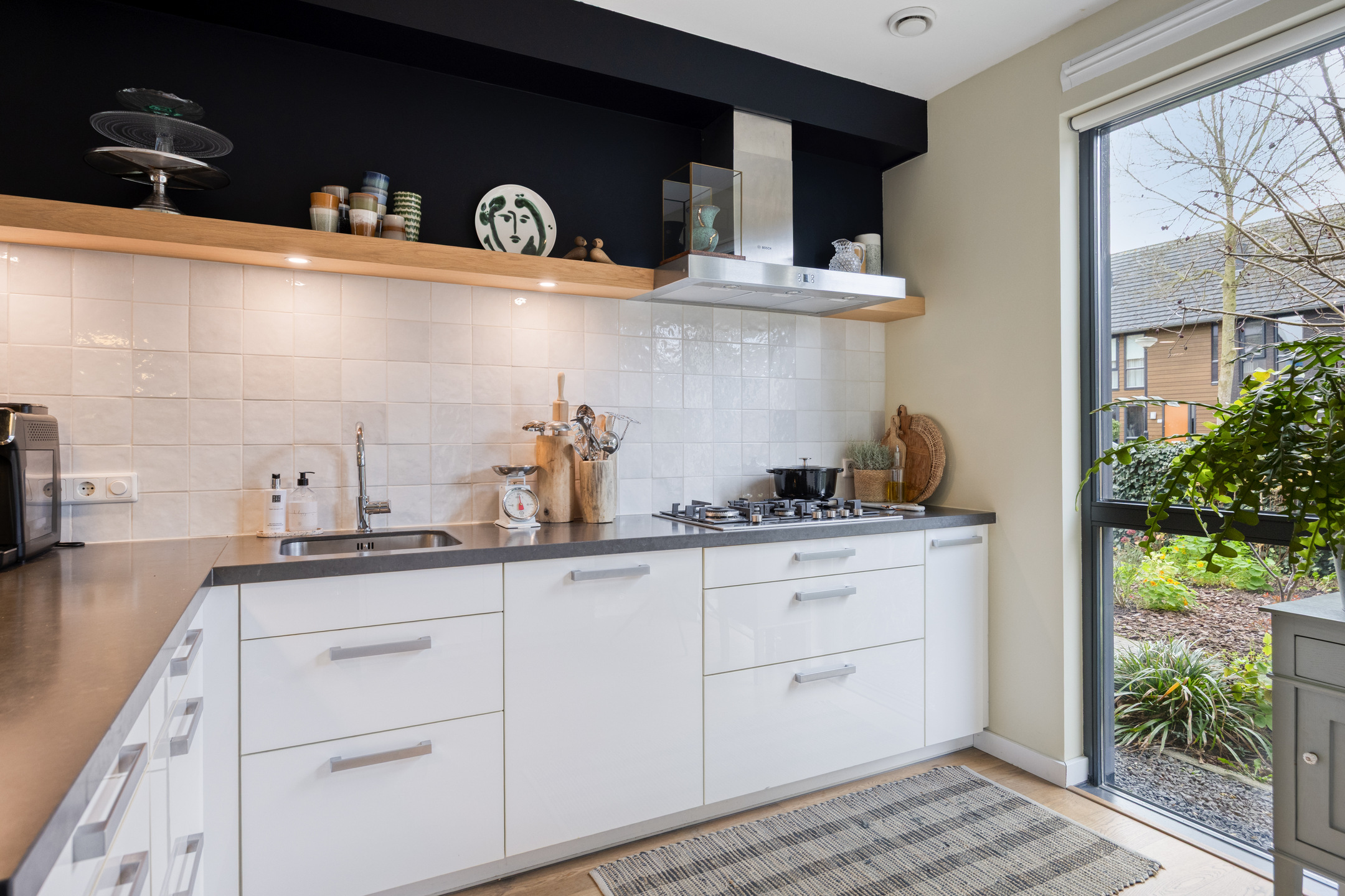 – de open keuken aan de voorzijde heeft een moderne uitstraling met baropstelling, veel kastruimte en Bosch inbouwapparatuur: oven, combimagnetron, koelkast met vriesvak, vaatwasser en een 5-pits gaskookplaat;