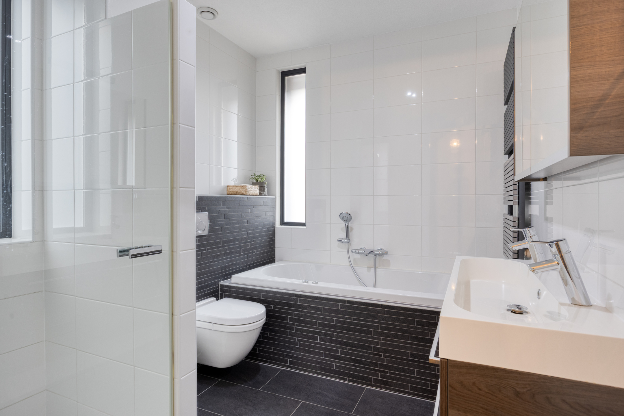 – de moderne badkamer beschikt over een ligbad (whirlpool), inloopdouche, wandcloset, breed wastafelmeubel en designradiator;