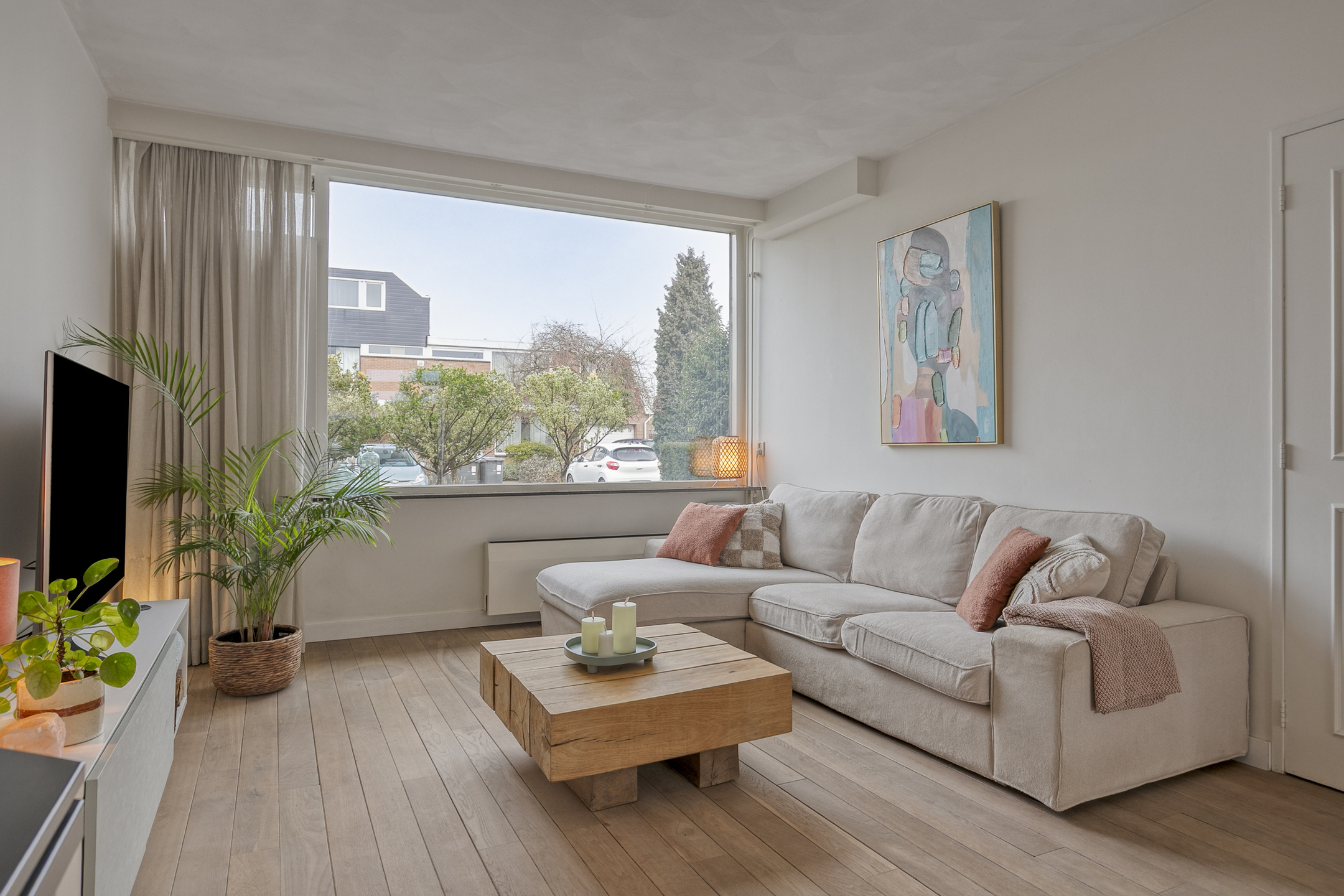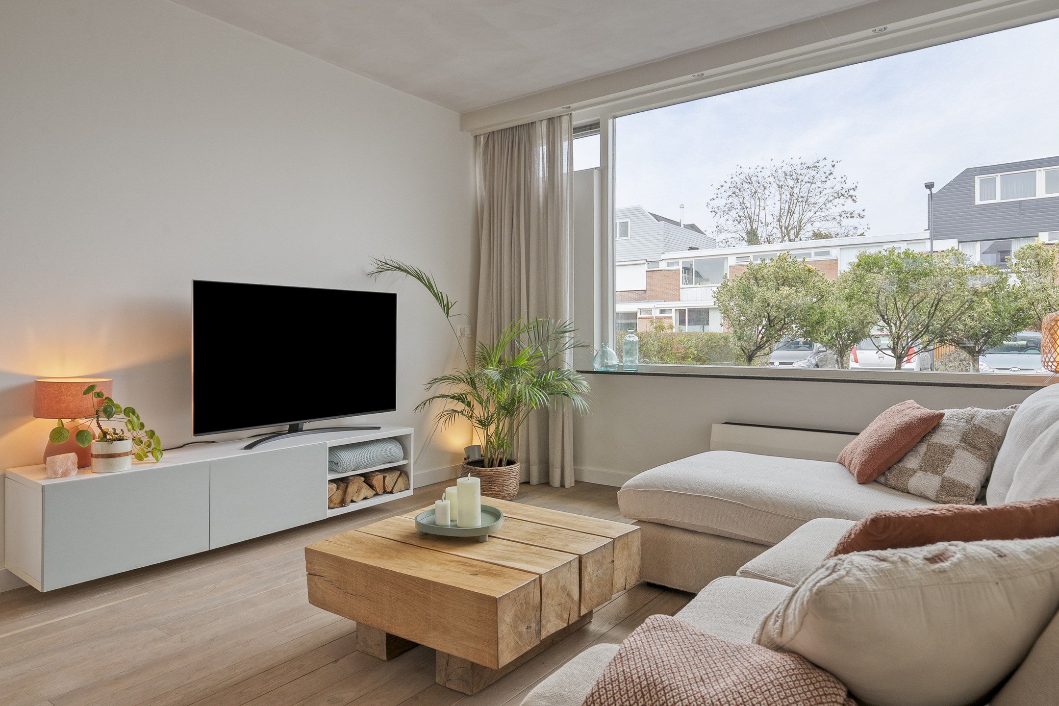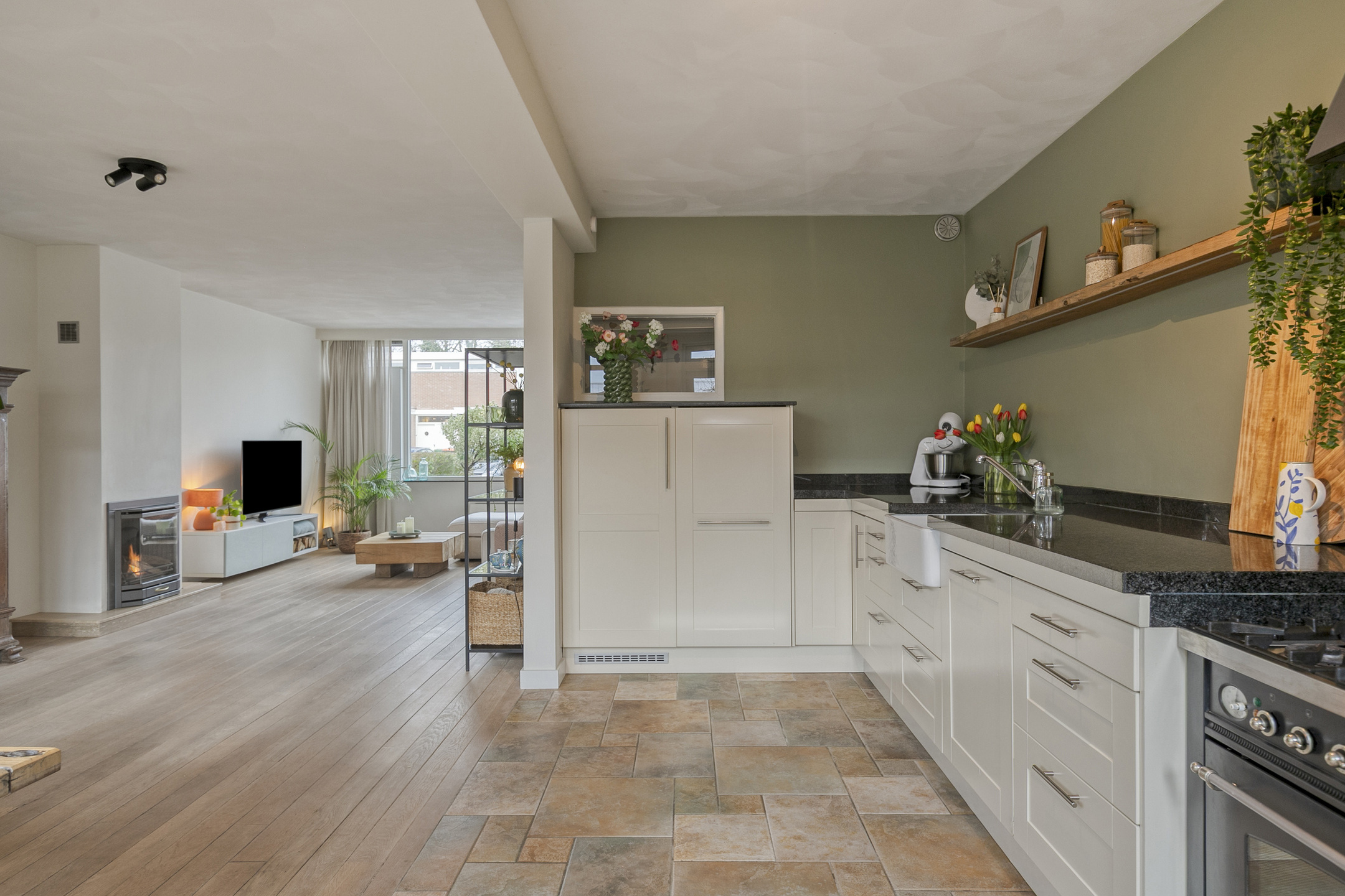 – de woonkamer is aan de voorzijde gelegen en ingericht met een comfortabele zithoek en beschikt over een sfeervolle gashaard;