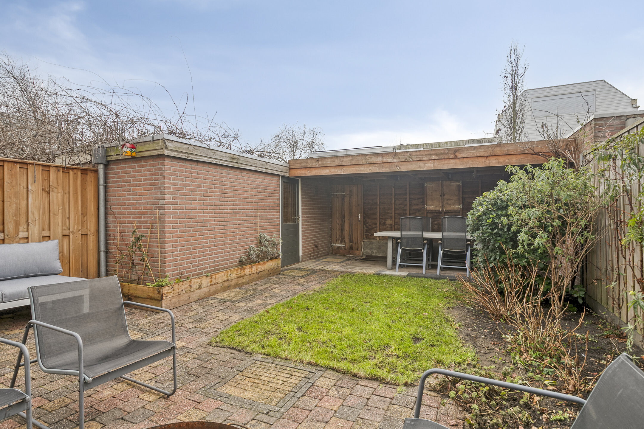 – de zonnige achtertuin is fraai aangelegd en gunstig gelegen op het zuiden. Daarnaast is er een fijne overkapping, een achterom én een stenen berging aanwezig;