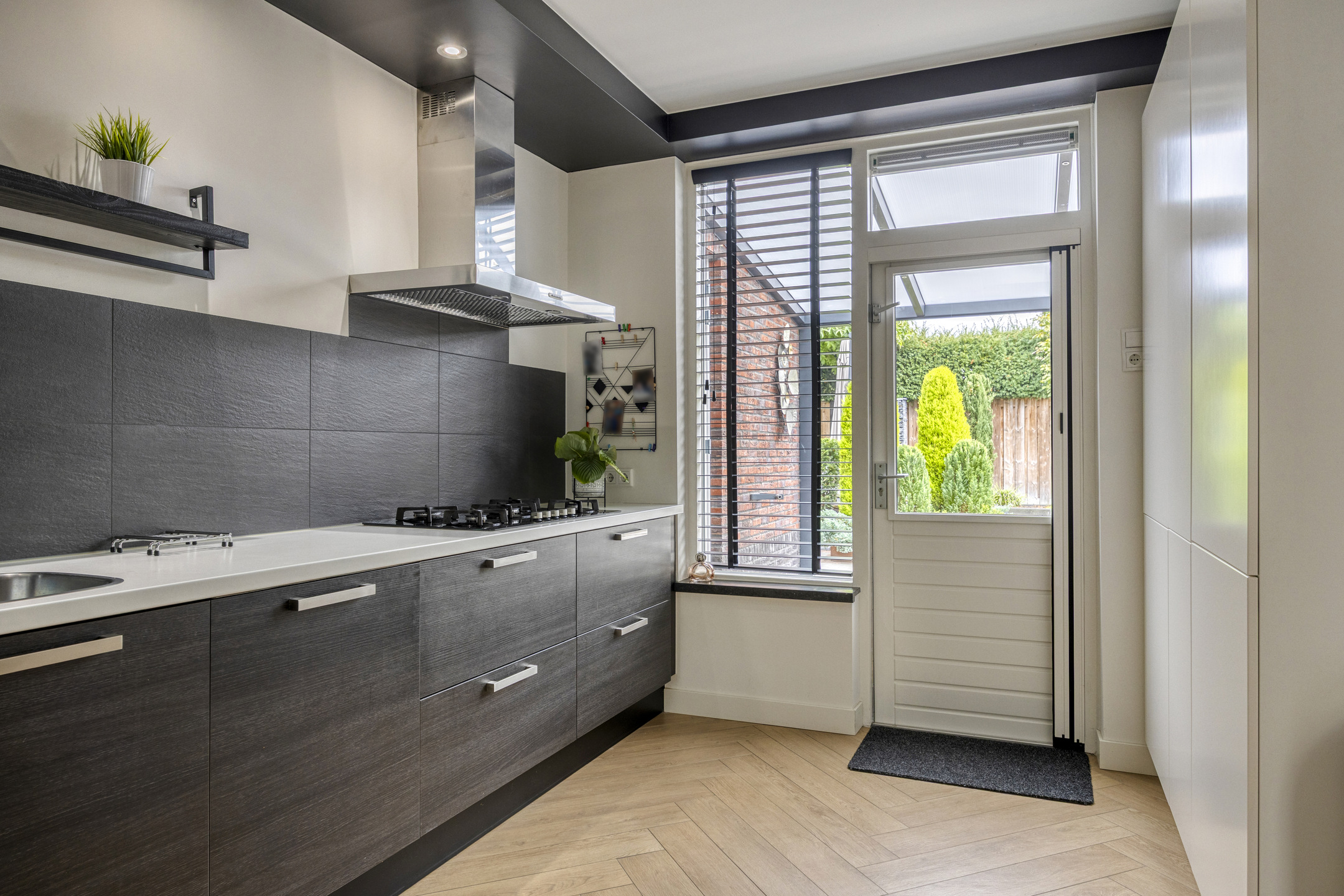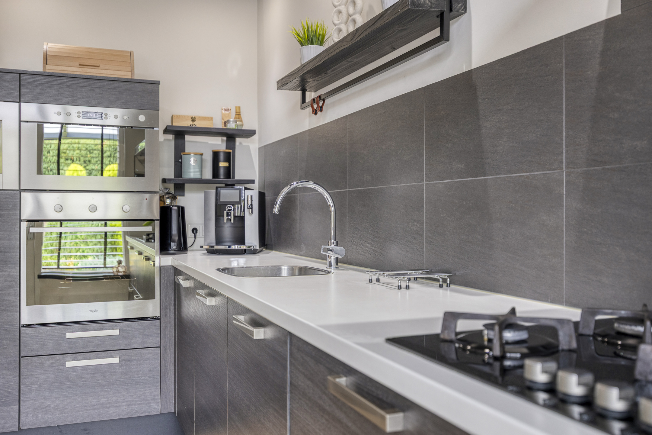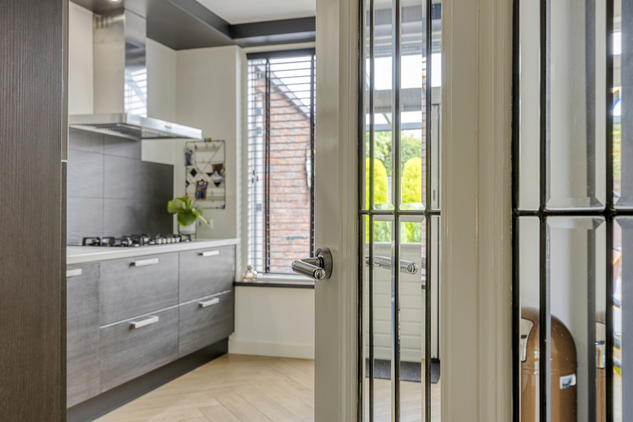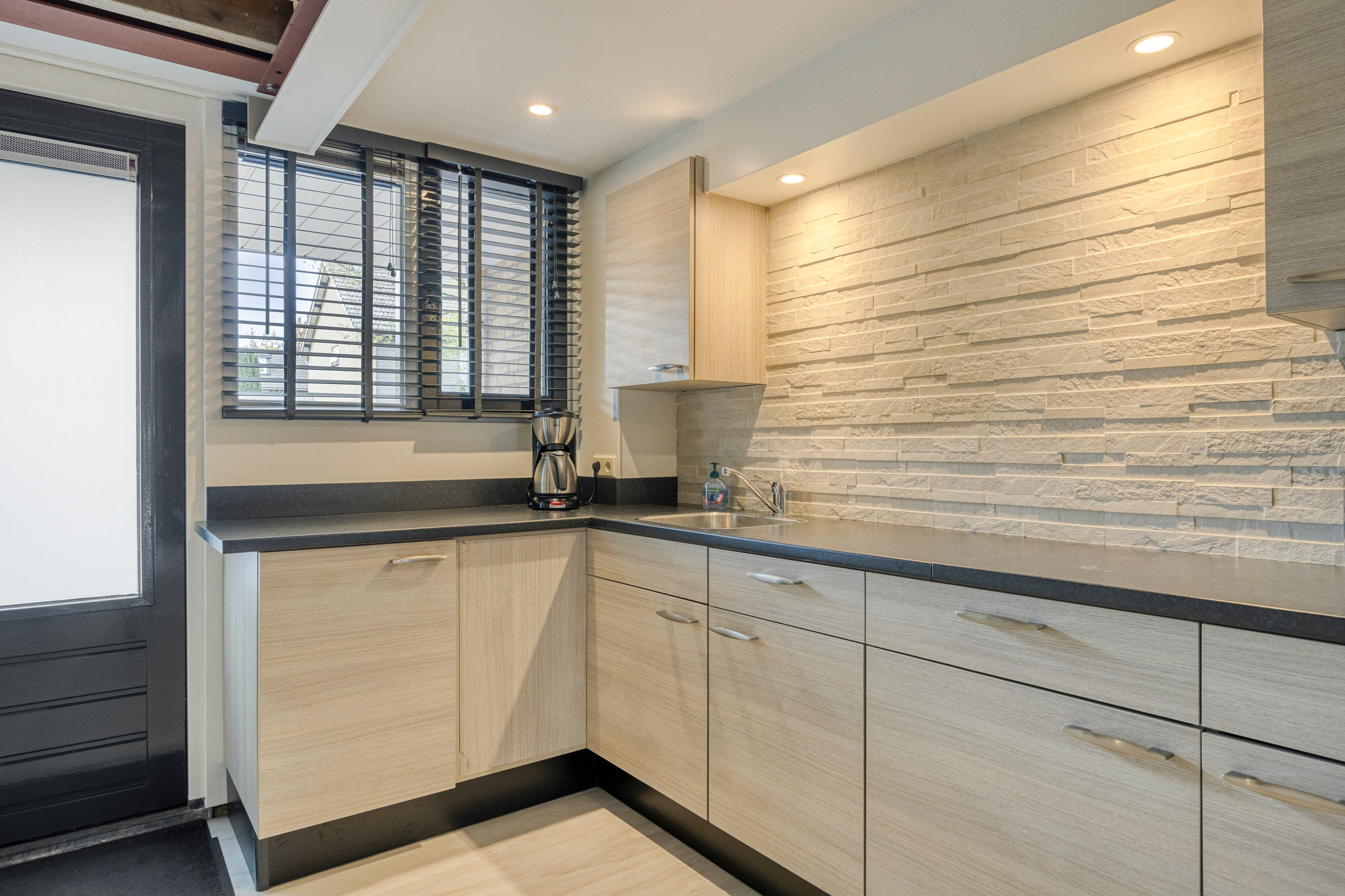 -de moderne keuken (L-opstelling) is uitgerust met onder andere een 5-pits gasfornuis, afzuigkap, oven, combi-magnetron, koffiemachine, koelkast en vaatwasser, en via een loopdeur toegang biedt tot de achtertuin;