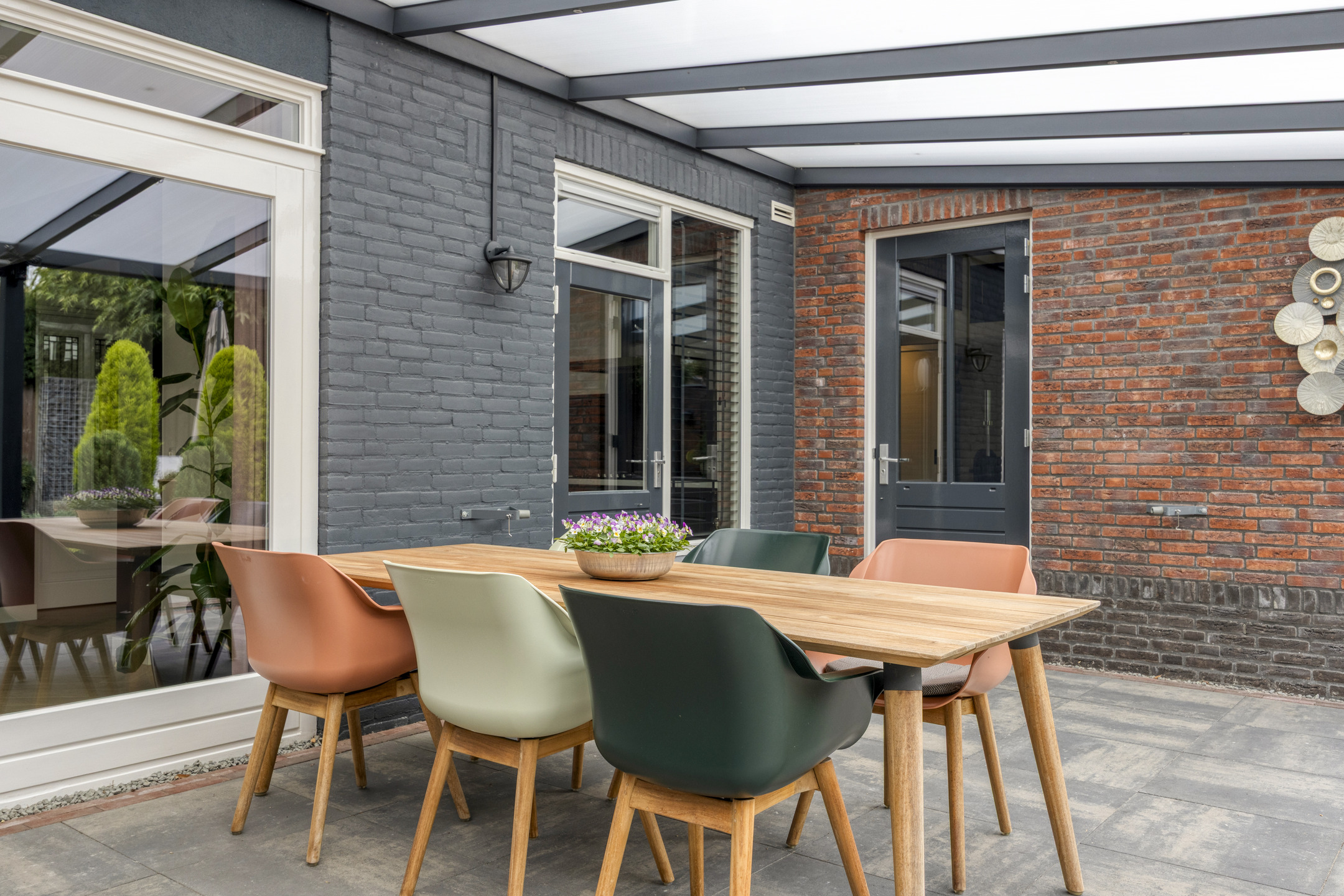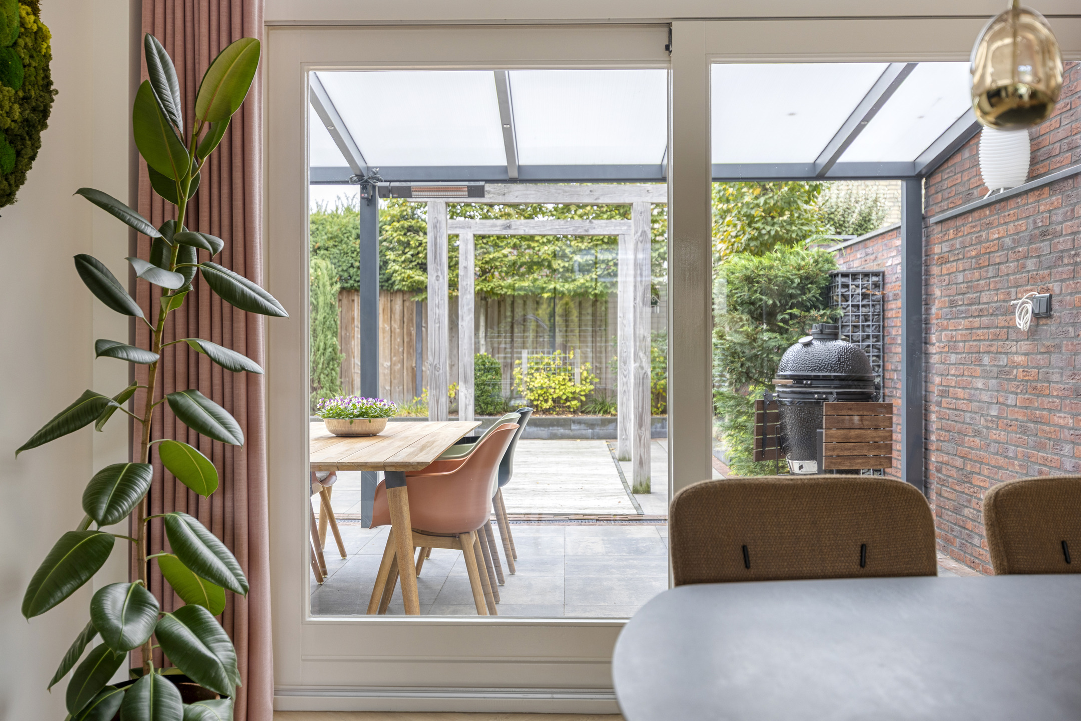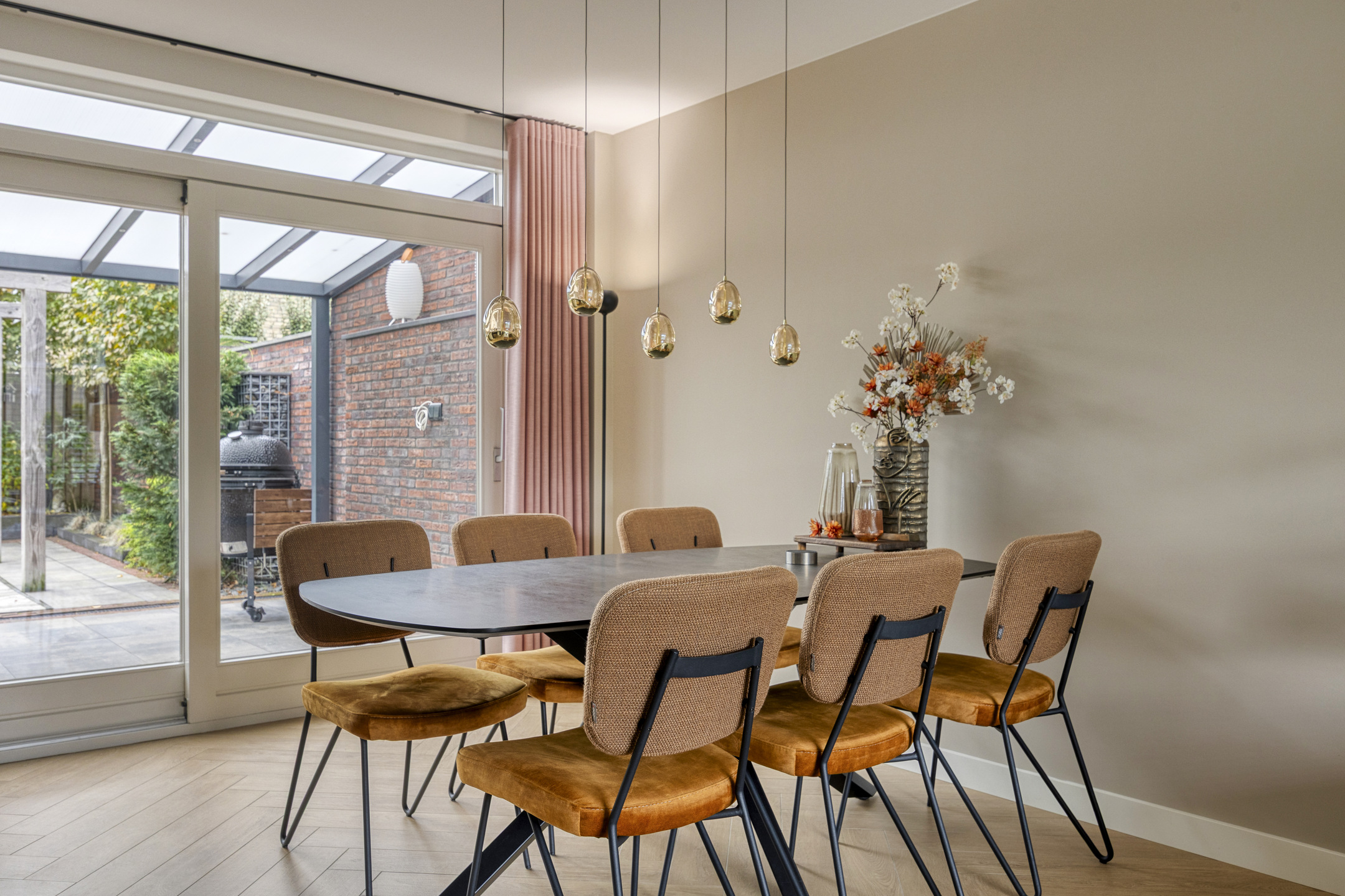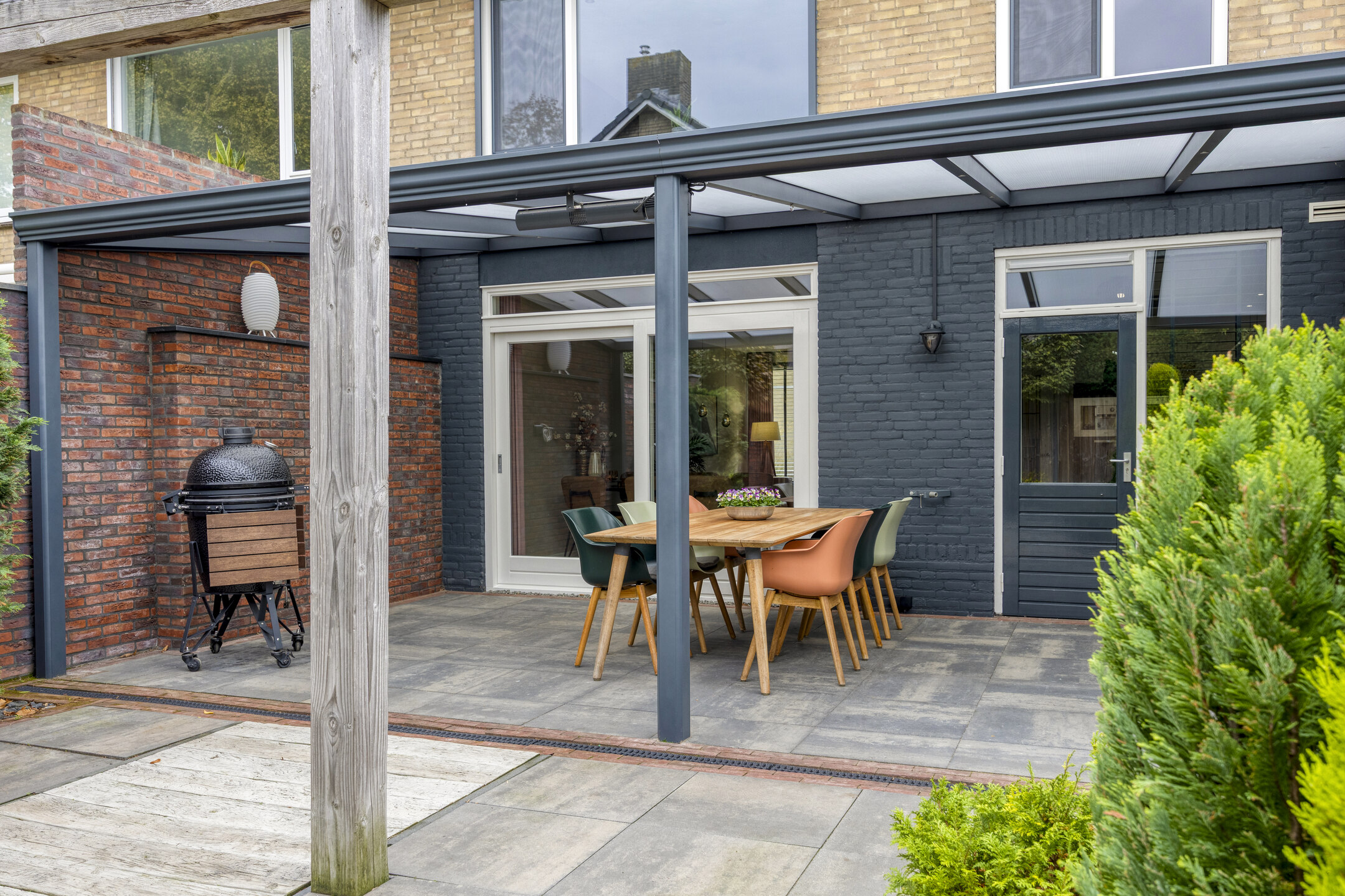 – het zitgedeelte aan de voorzijde ligt en het eetgedeelte aan de tuinzijde met brede schuifpui naar het terras met overkapping;