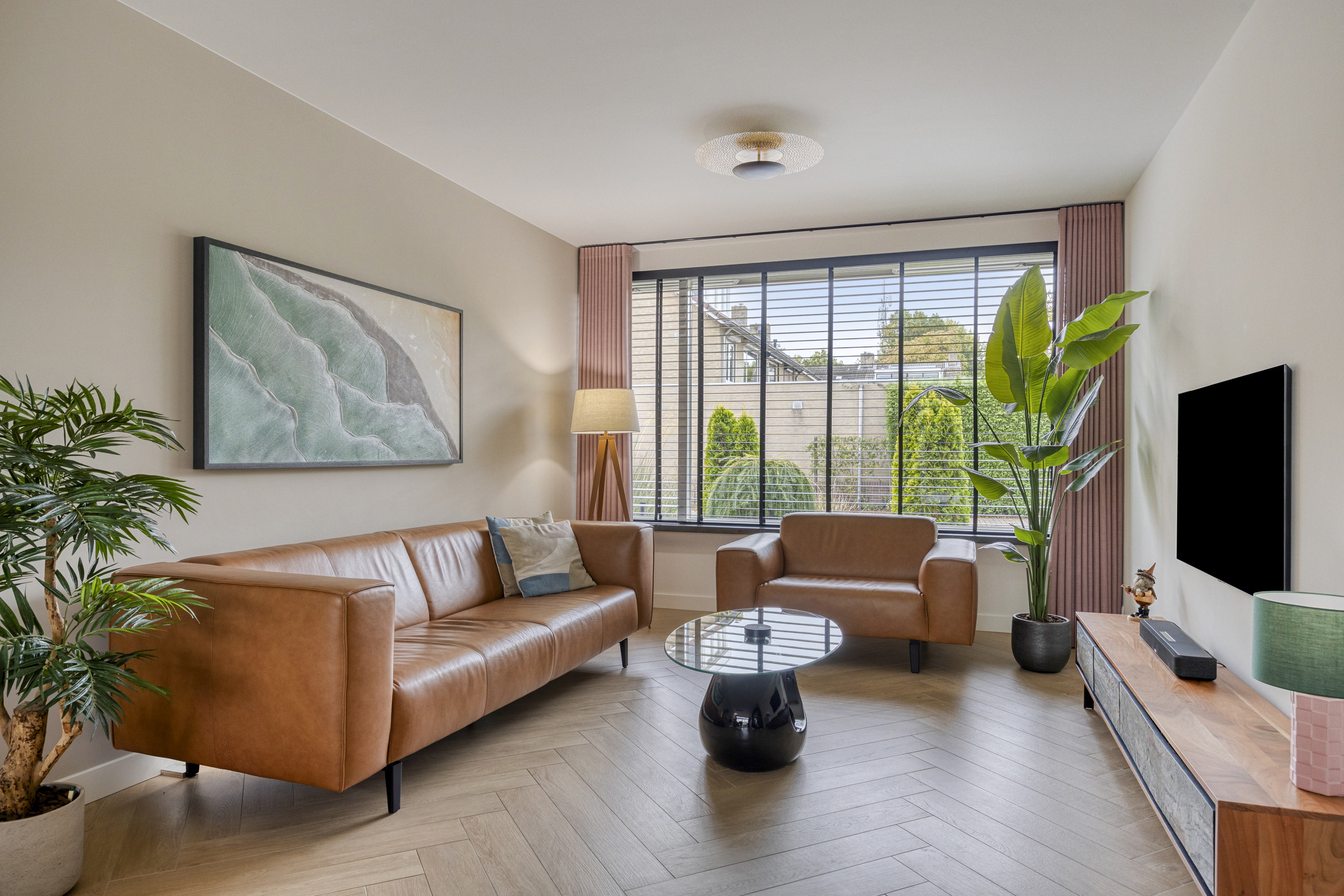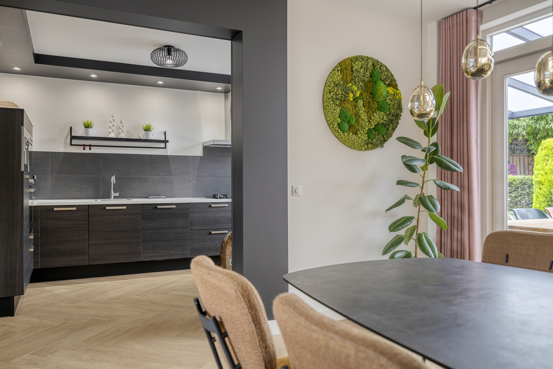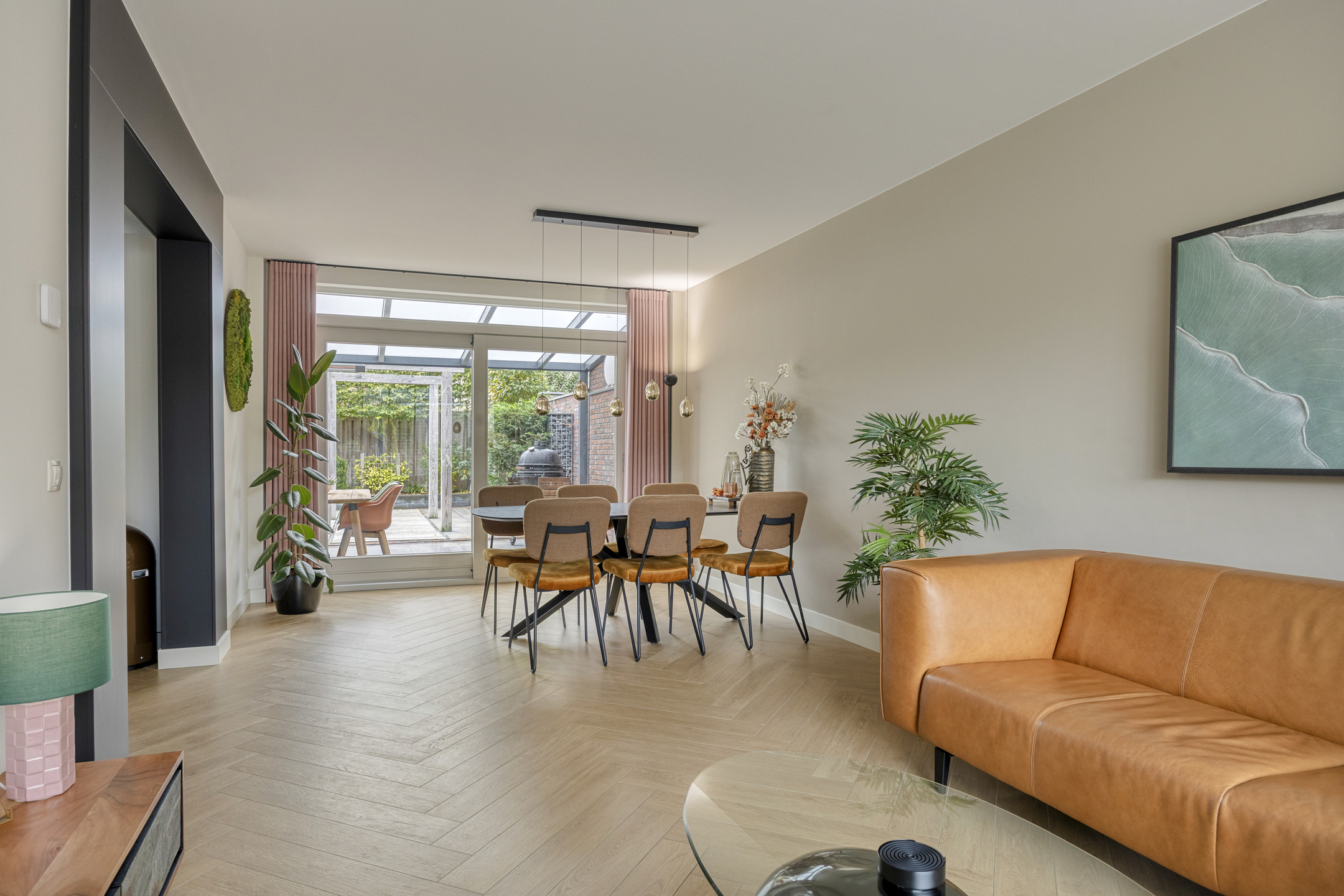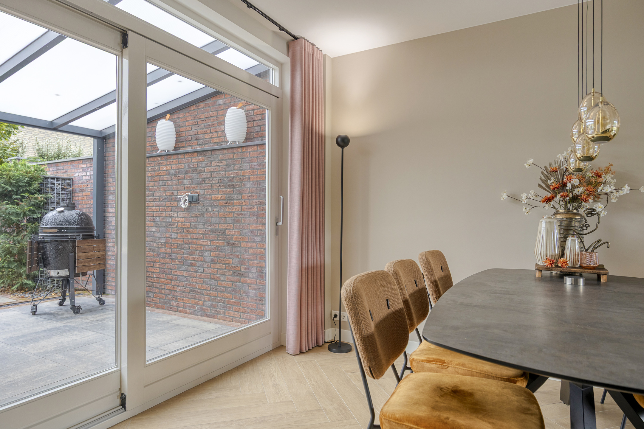 – het zitgedeelte aan de voorzijde ligt en het eetgedeelte aan de tuinzijde met brede schuifpui naar het terras met overkapping;