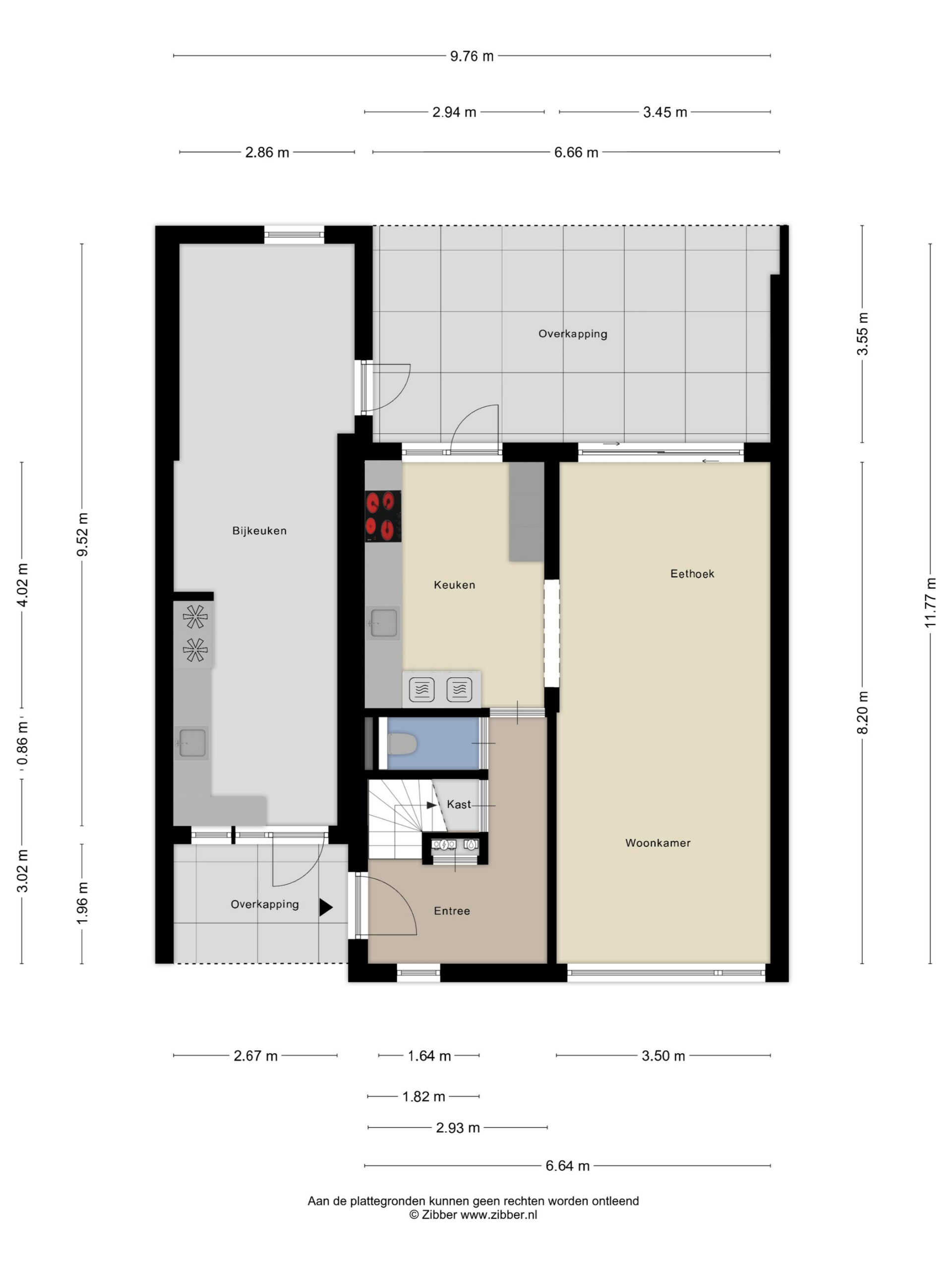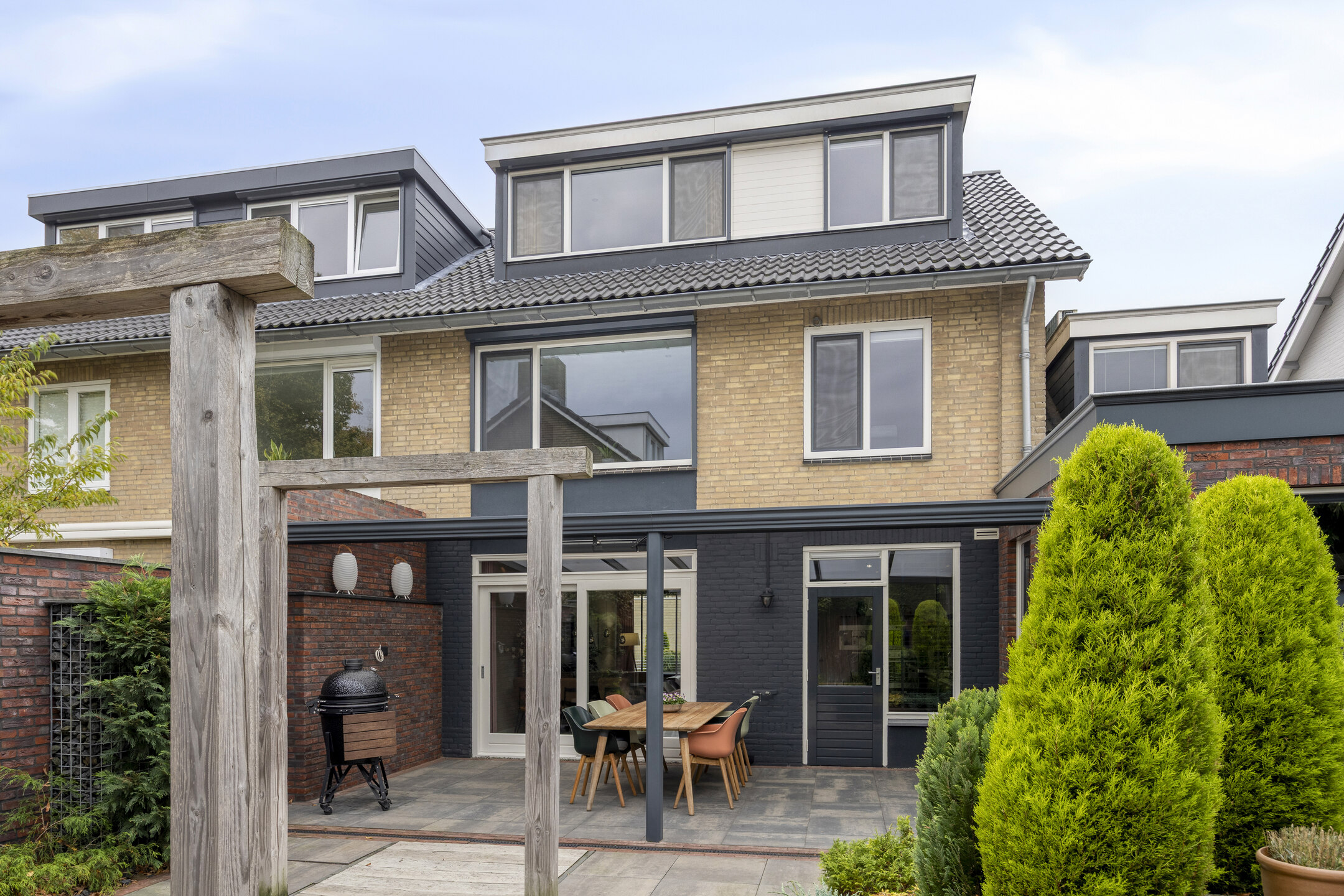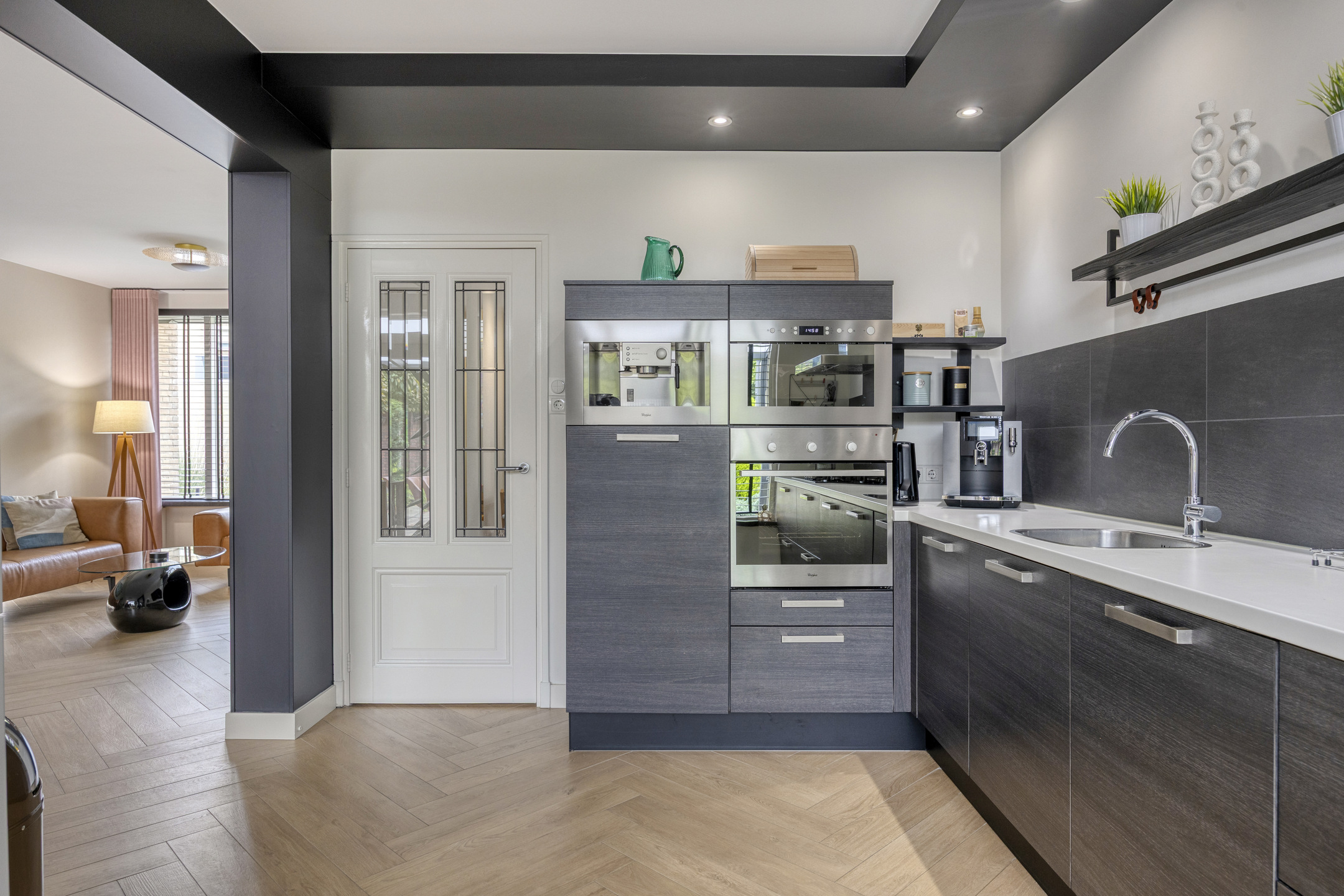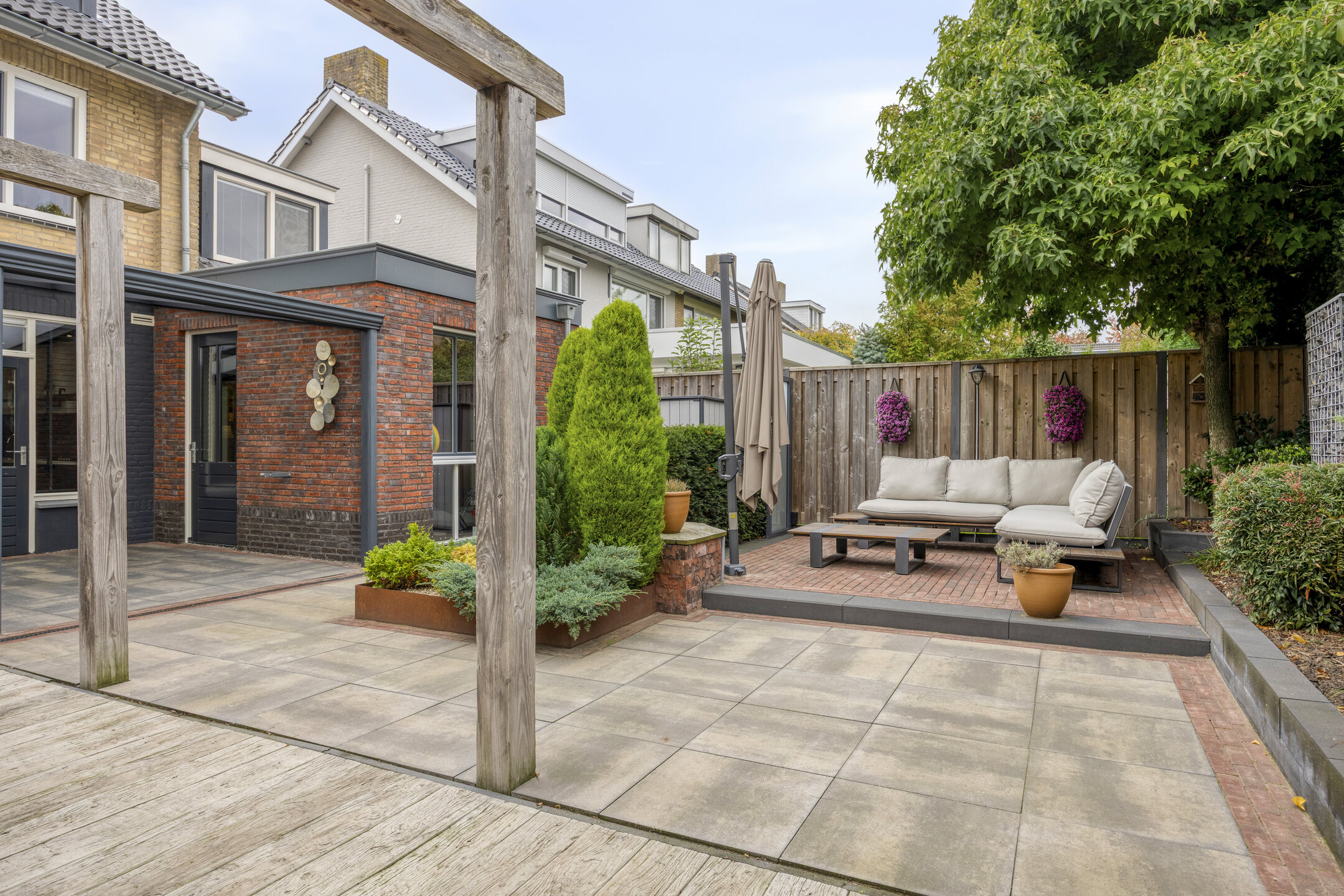 – het zitgedeelte aan de voorzijde ligt en het eetgedeelte aan de tuinzijde met brede schuifpui naar het terras met overkapping;