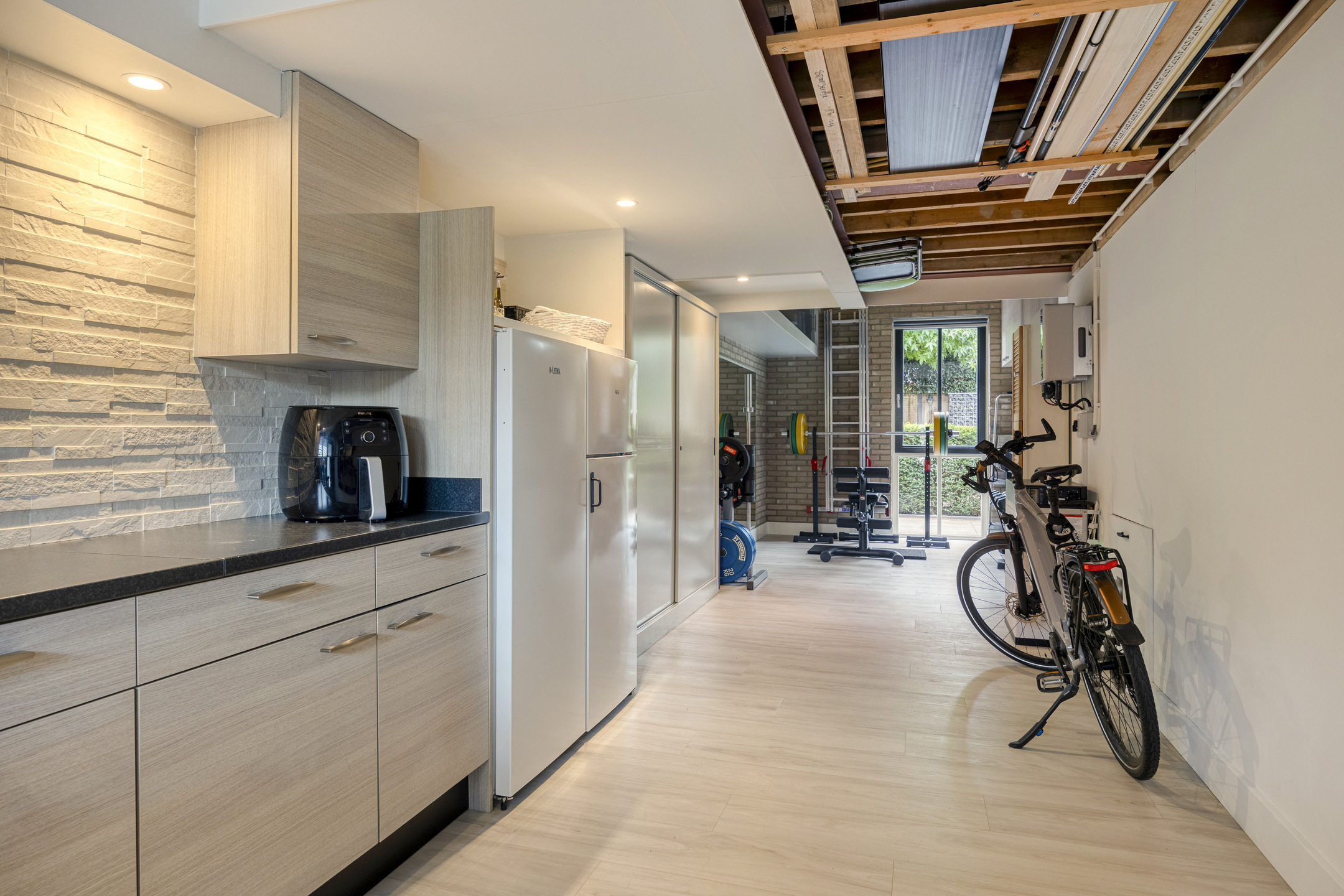 – de voormalige garage in 2020 is uitgebouwd tot een volledig geïsoleerde multifunctionele ruimte met pvc-vloer, extra keuken en veel bergruimte, ideaal als werk-, hobby- of sportruimte;