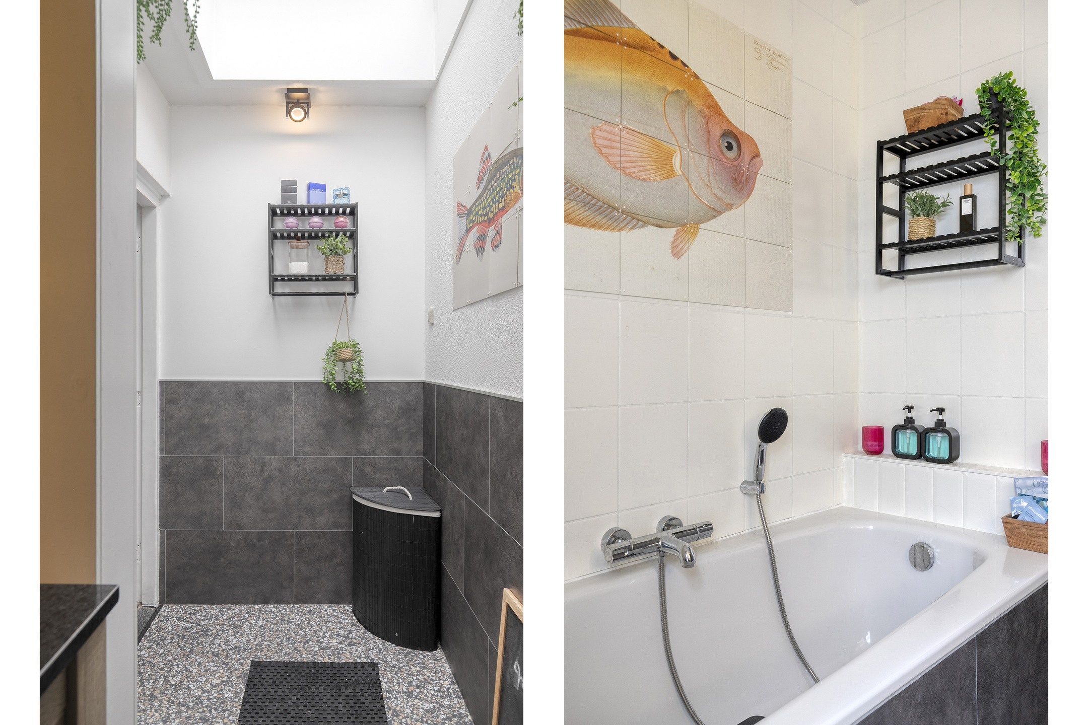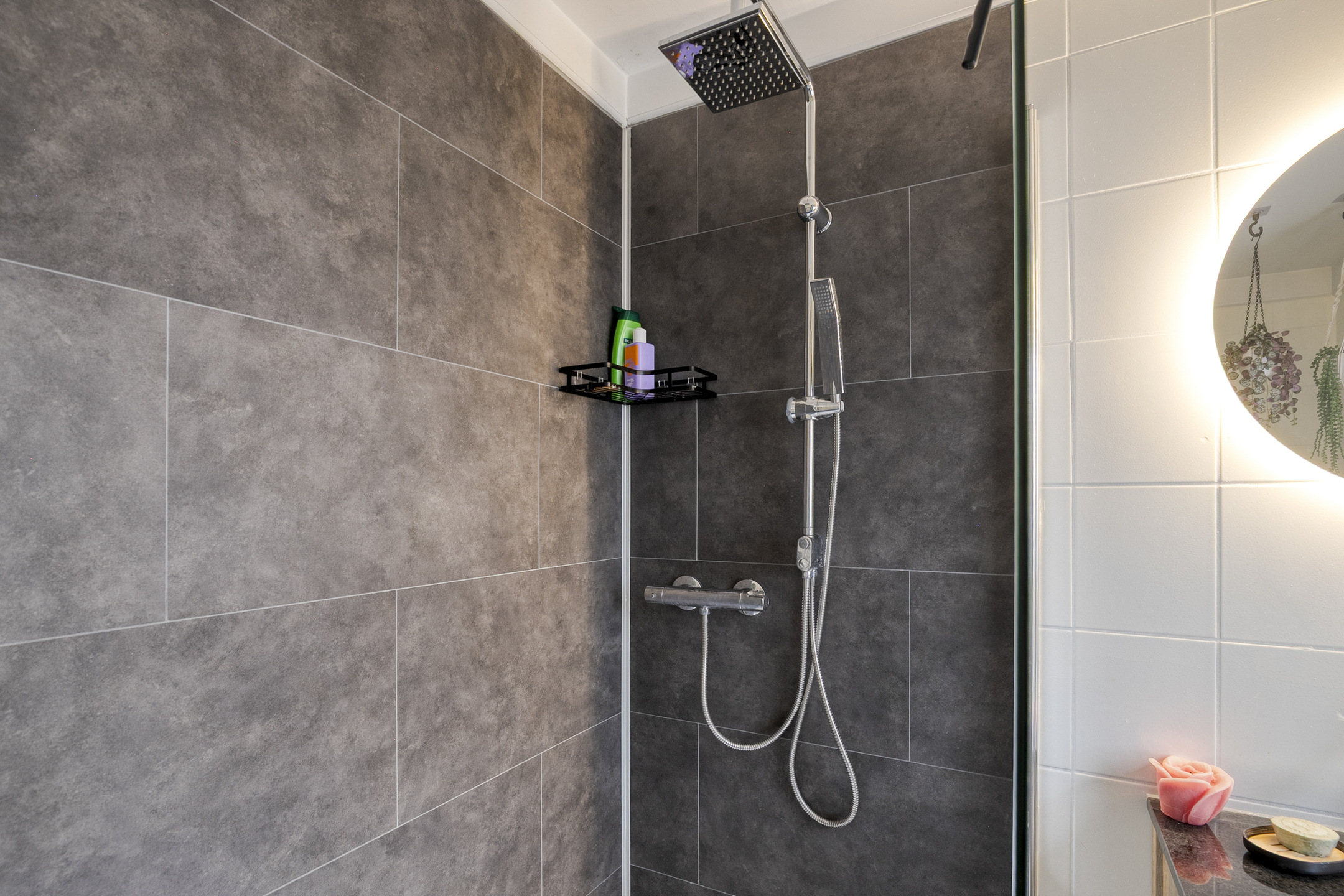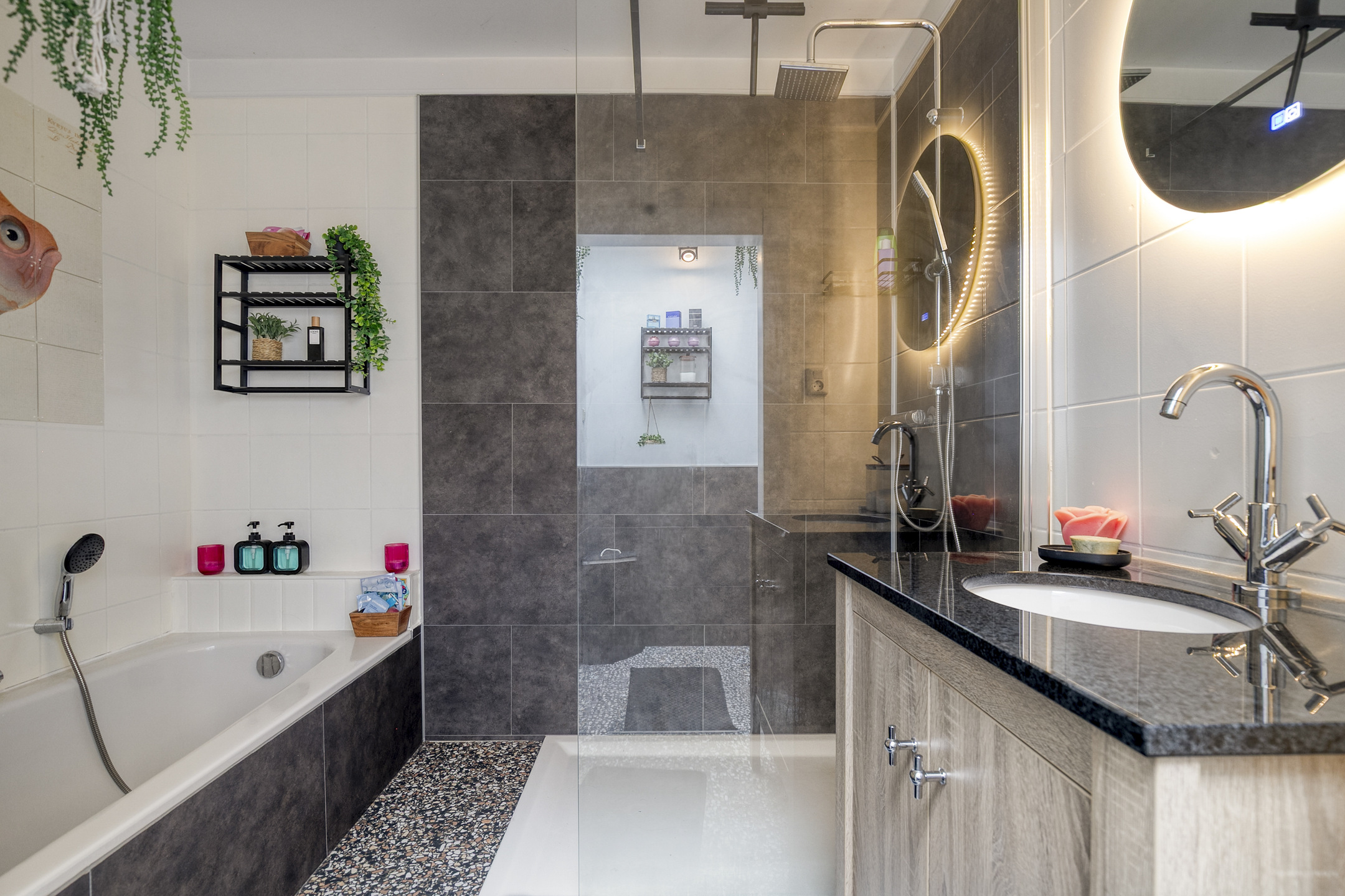 – de badkamer in 2025 grotendeels is vernieuwd en luxe oogt dankzij de moderne betegeling, het ligbad, de inloopdouche en het badkamermeubel met wastafel;