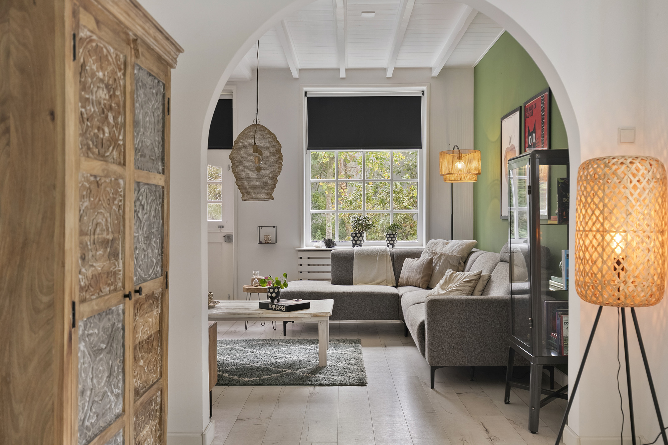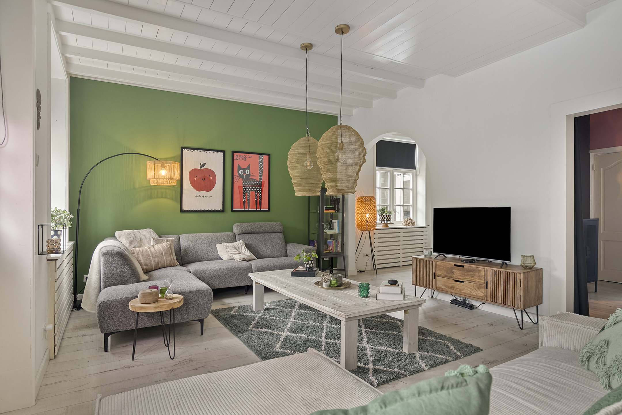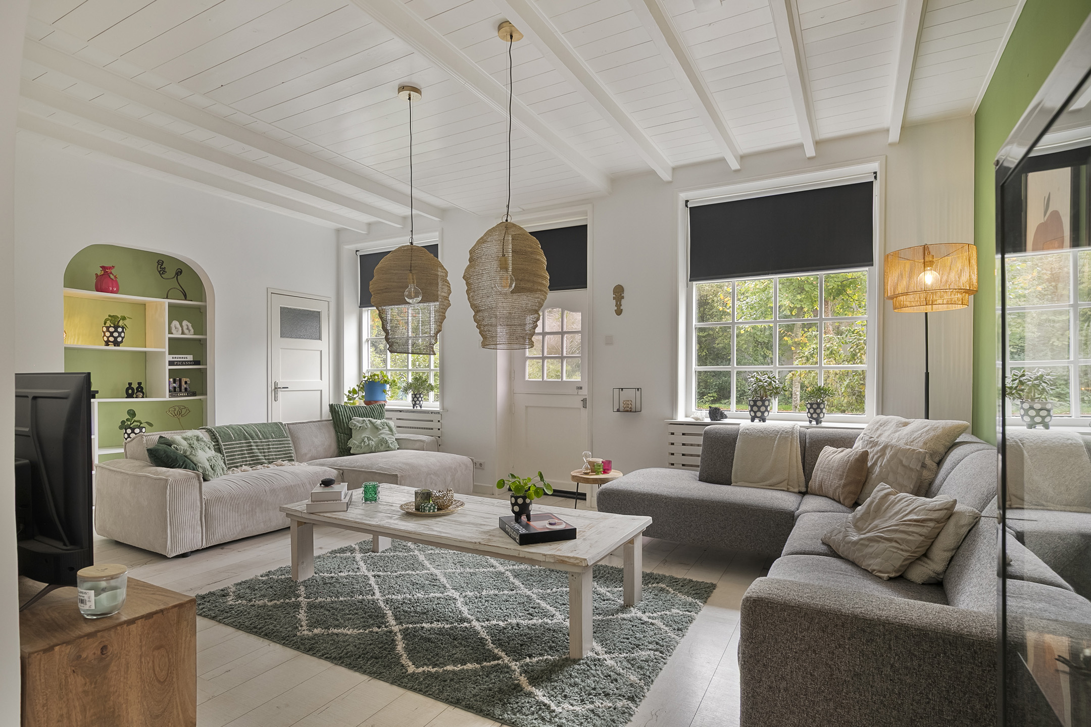 – de sfeervolle woonkamer, waar een moderne laminaatvloer, stucwerk wanden, een balkenplafond en hoge ramen samen zorgen voor een lichte en warme uitstraling;