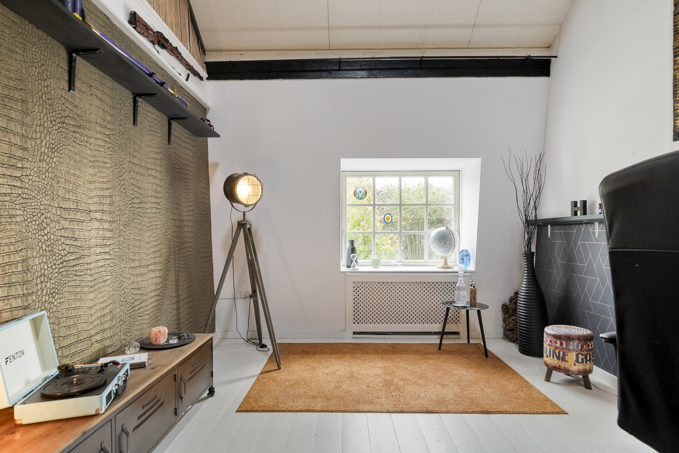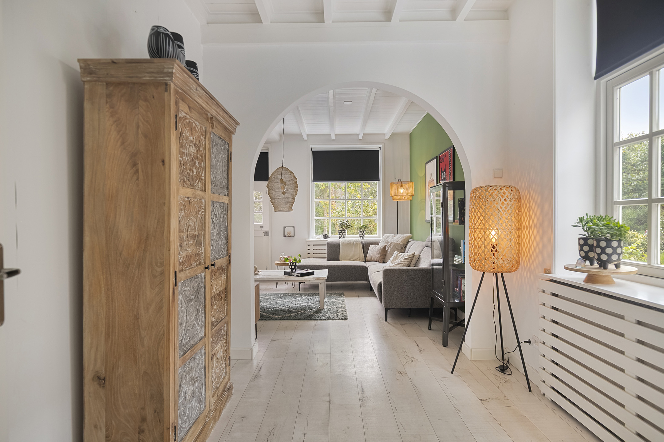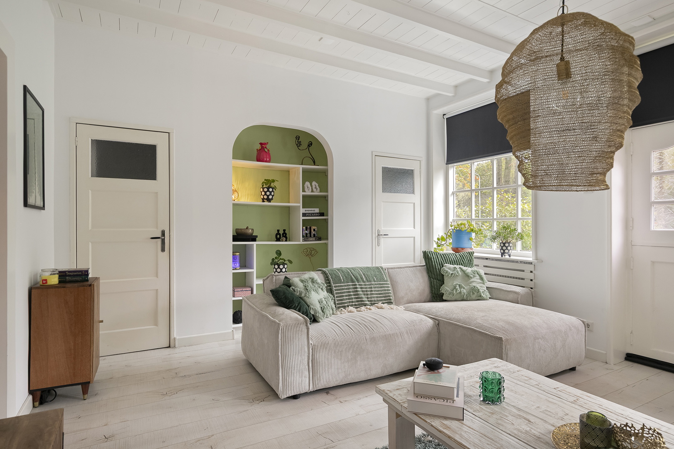 – de sfeervolle woonkamer, waar een moderne laminaatvloer, stucwerk wanden, een balkenplafond en hoge ramen samen zorgen voor een lichte en warme uitstraling;