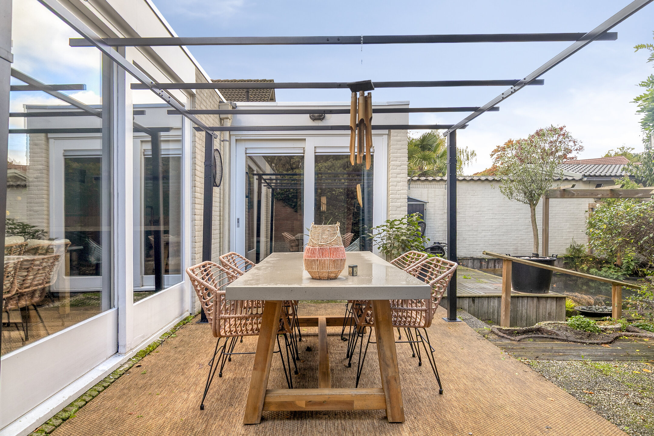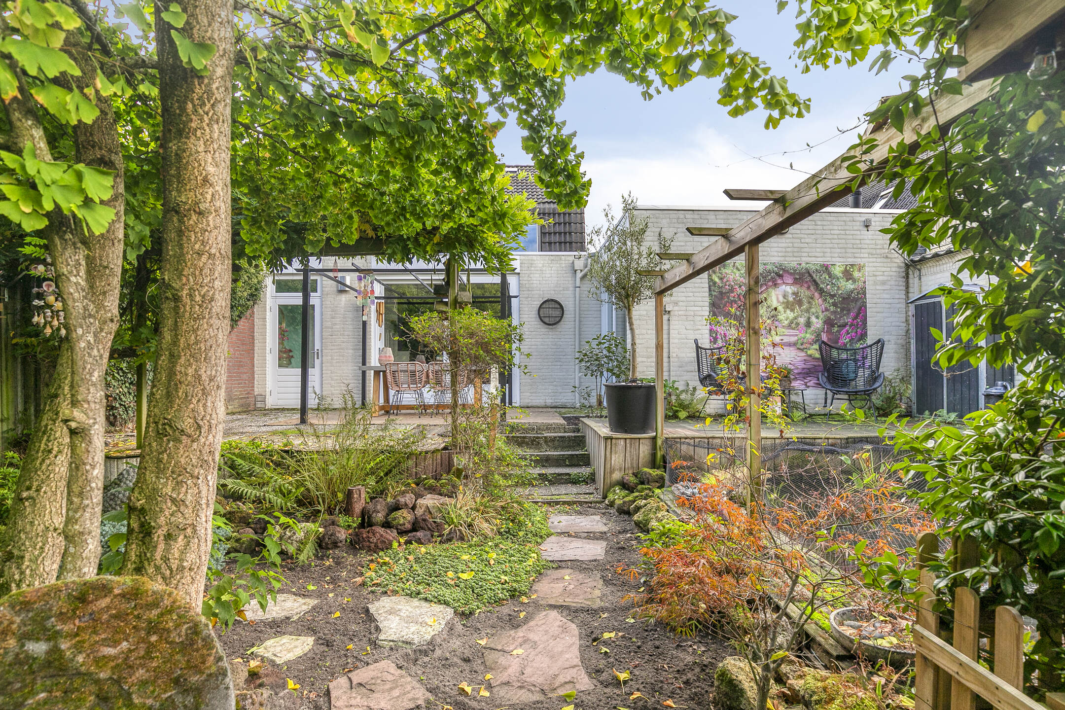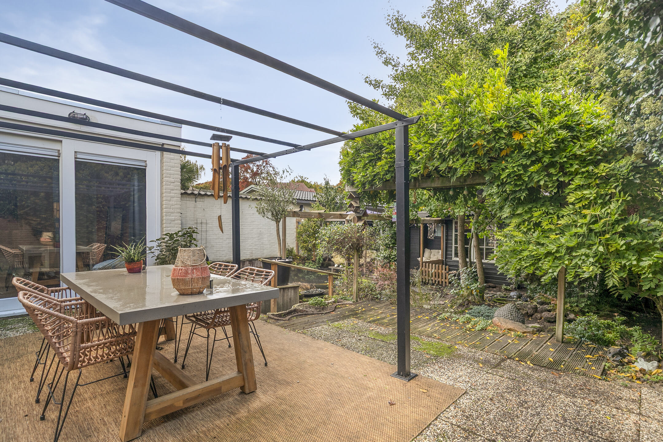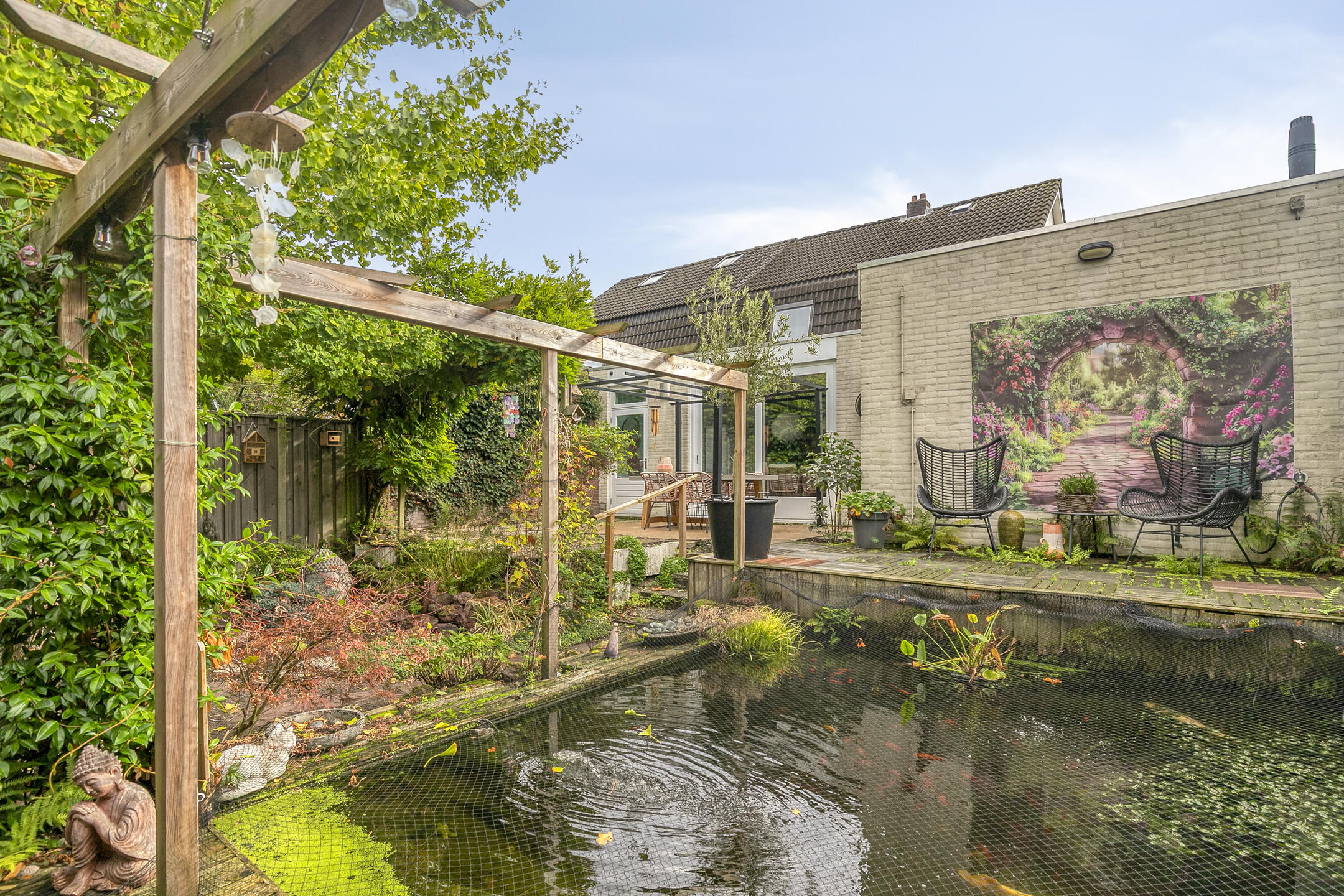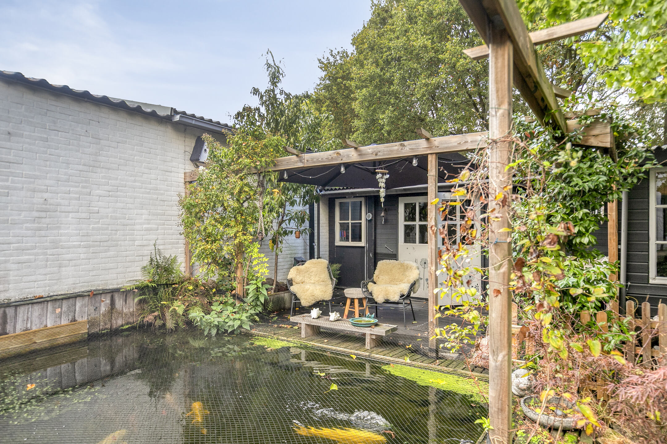 – de diepe achtertuin op het noordwesten een oase van rust vormt, met een groot terras, vijver, overkapping en veel privacy, ideaal voor zomerse avonden;