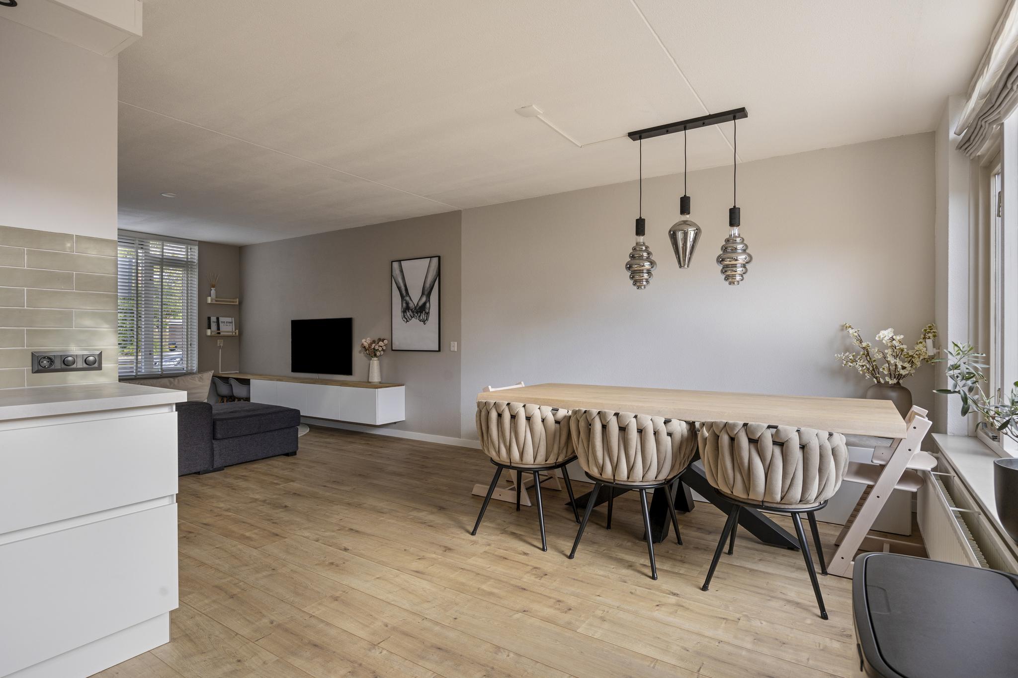 De eetkamer is gelegen aan de achterzijde van de woning, met uitzicht op de achtertuin. Hier is voldoende ruimte om een grote eettafel te plaatsen. Een portaal vanuit de woonkamer biedt toegang tot de trapopgang naar de eerste verdieping.