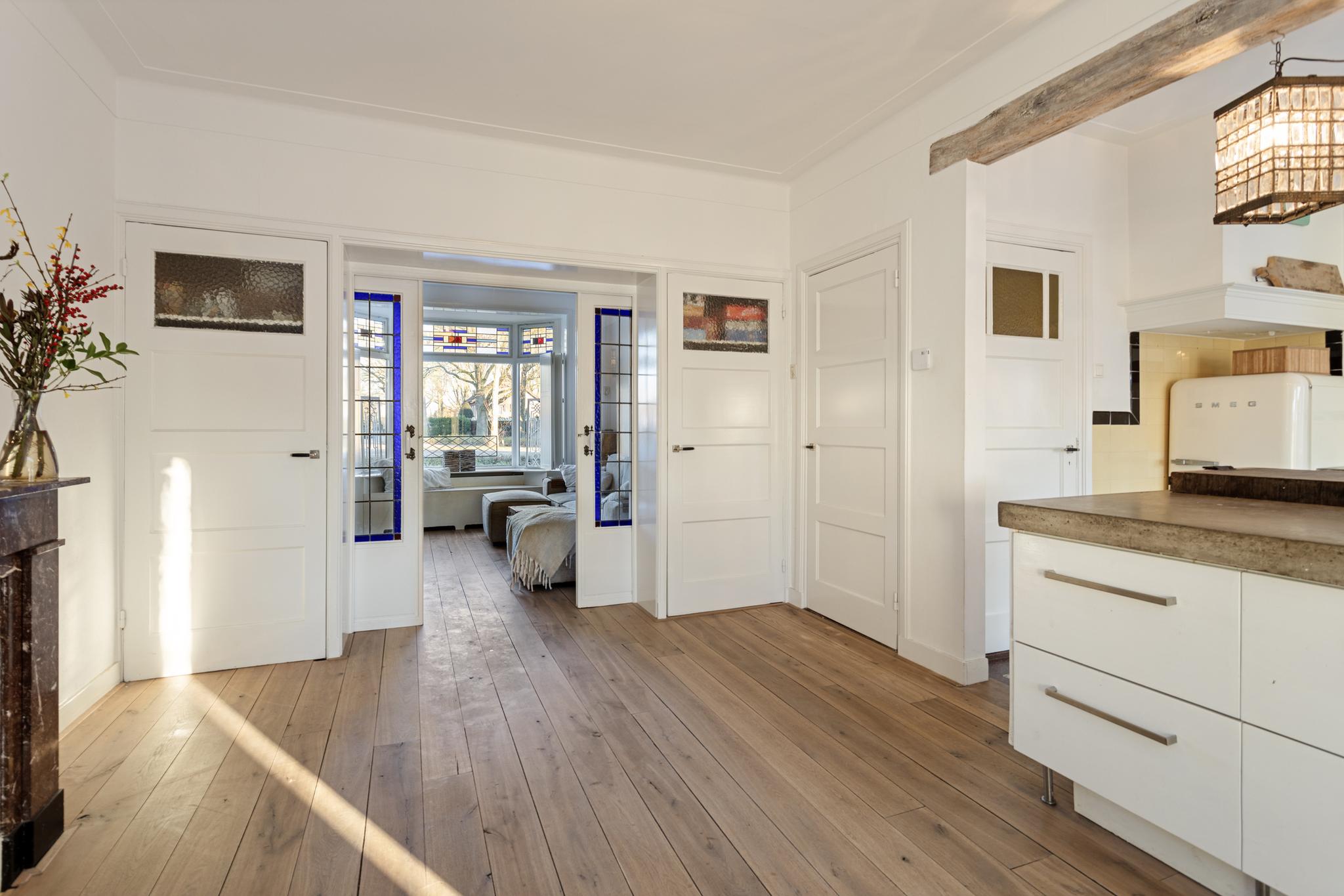 – de woonkamer en suite middels authentieke glas in lood deuren wordt gescheiden van de tussenkamer en beide ruimten van een optimale daglichttoetreding genieten door raampartijen aan de voor- en achterzijde. Hier bevinden zich tevens praktische vaste kasten;