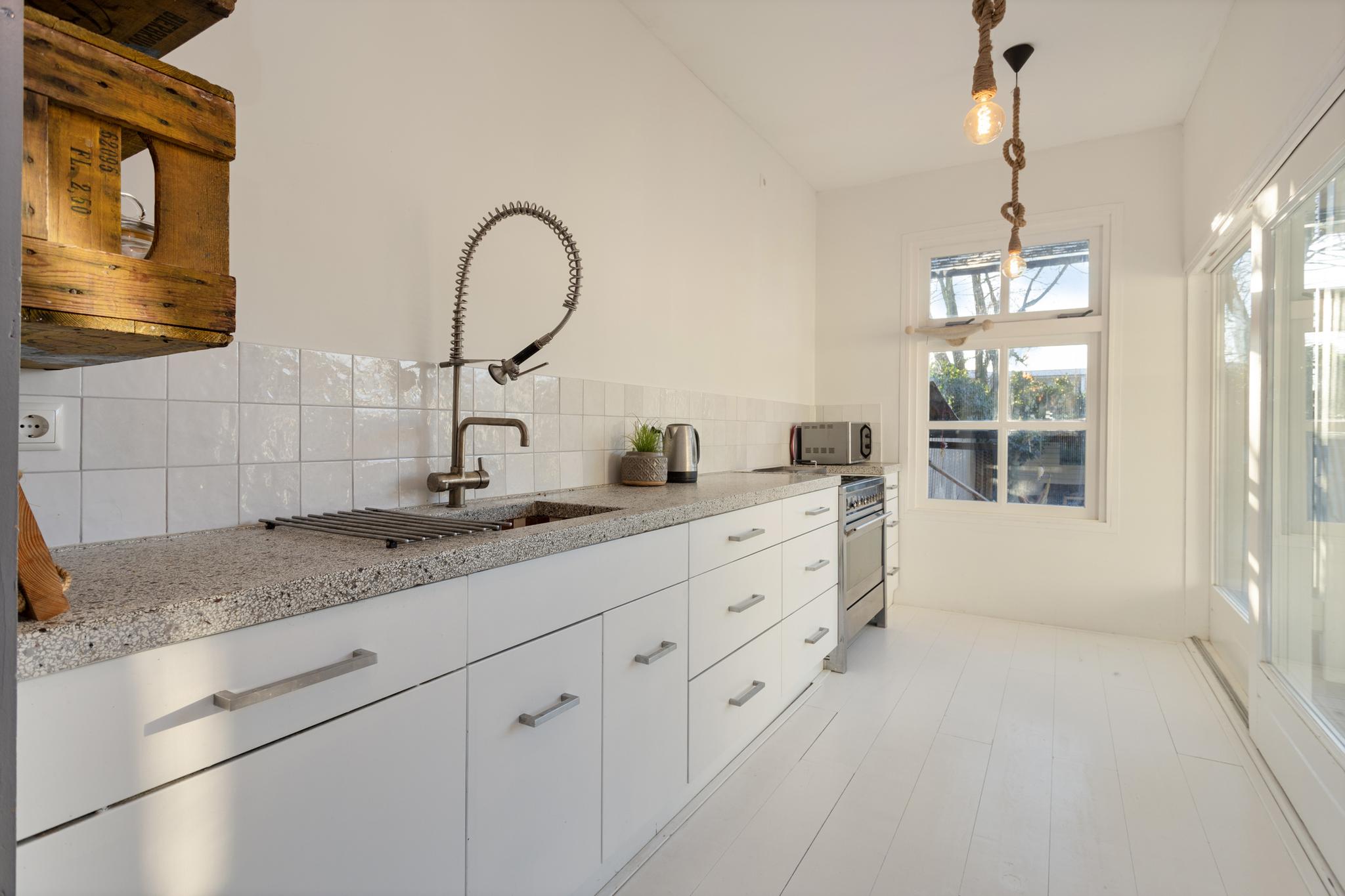 – middels een robuuste schuifdeur in de uitbouw de praktische bijkeuken toegankelijk is. De bijkeuken is ingedeeld met een keukenblok met veel werk-/opbergruimte, een gasfornuis en een vaatwasmachine. Tevens bevinden zich hier de aansluitingen voor de wasapparatuur;