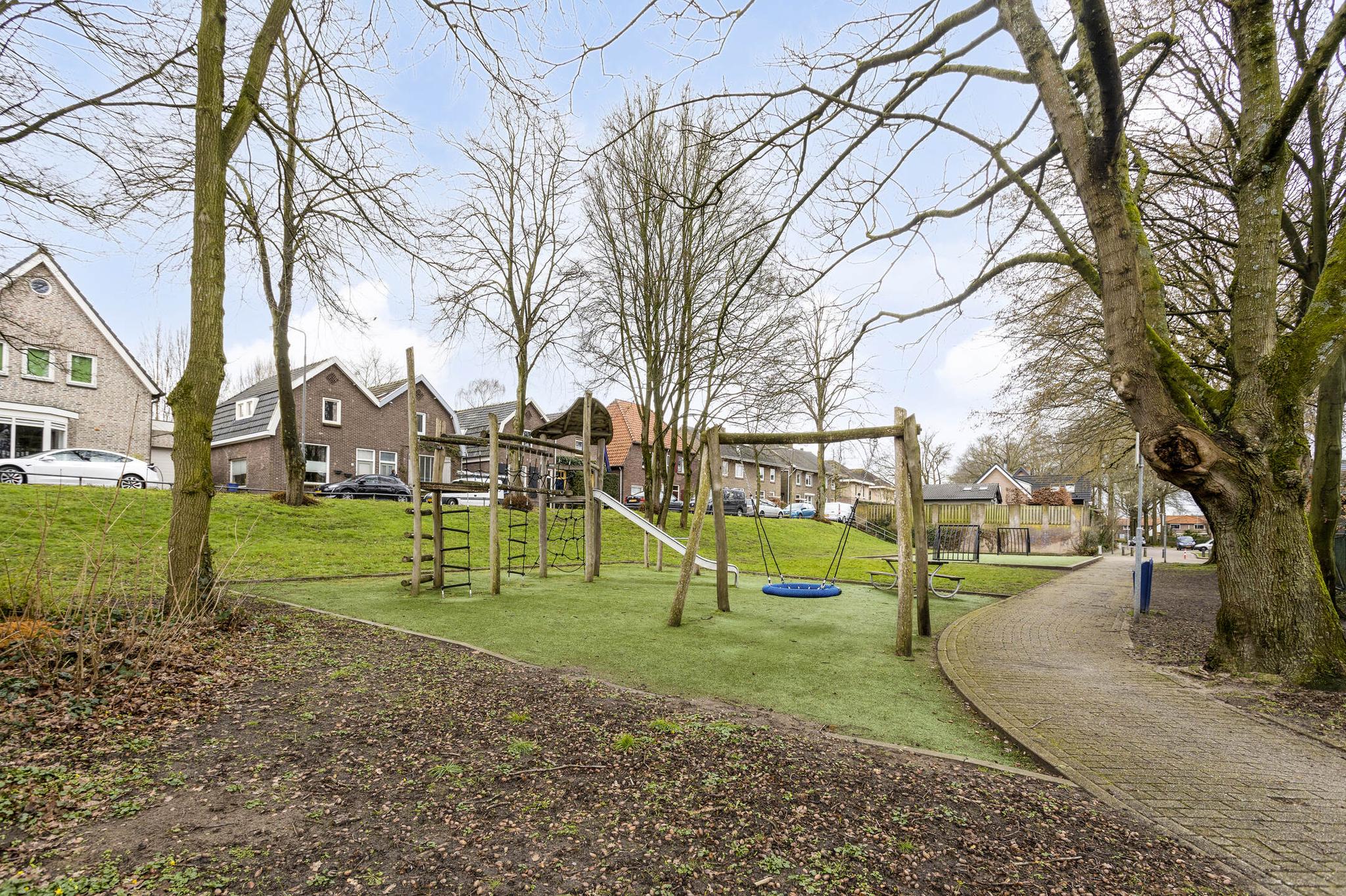 – de tuin een niveauverschil kent en is ingedeeld met een groot terras met overkapping en open haard, een trap naar beneden naar een looppad, zwembad, gazon, kunstgras, een extra overkapping achterin de tuin, een riante berging en achterom;