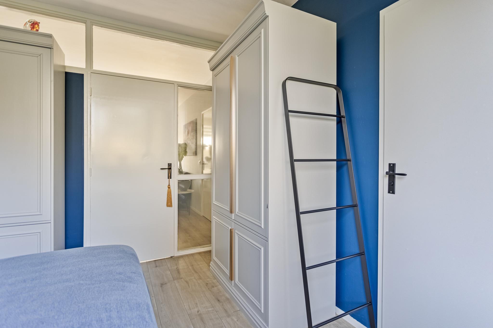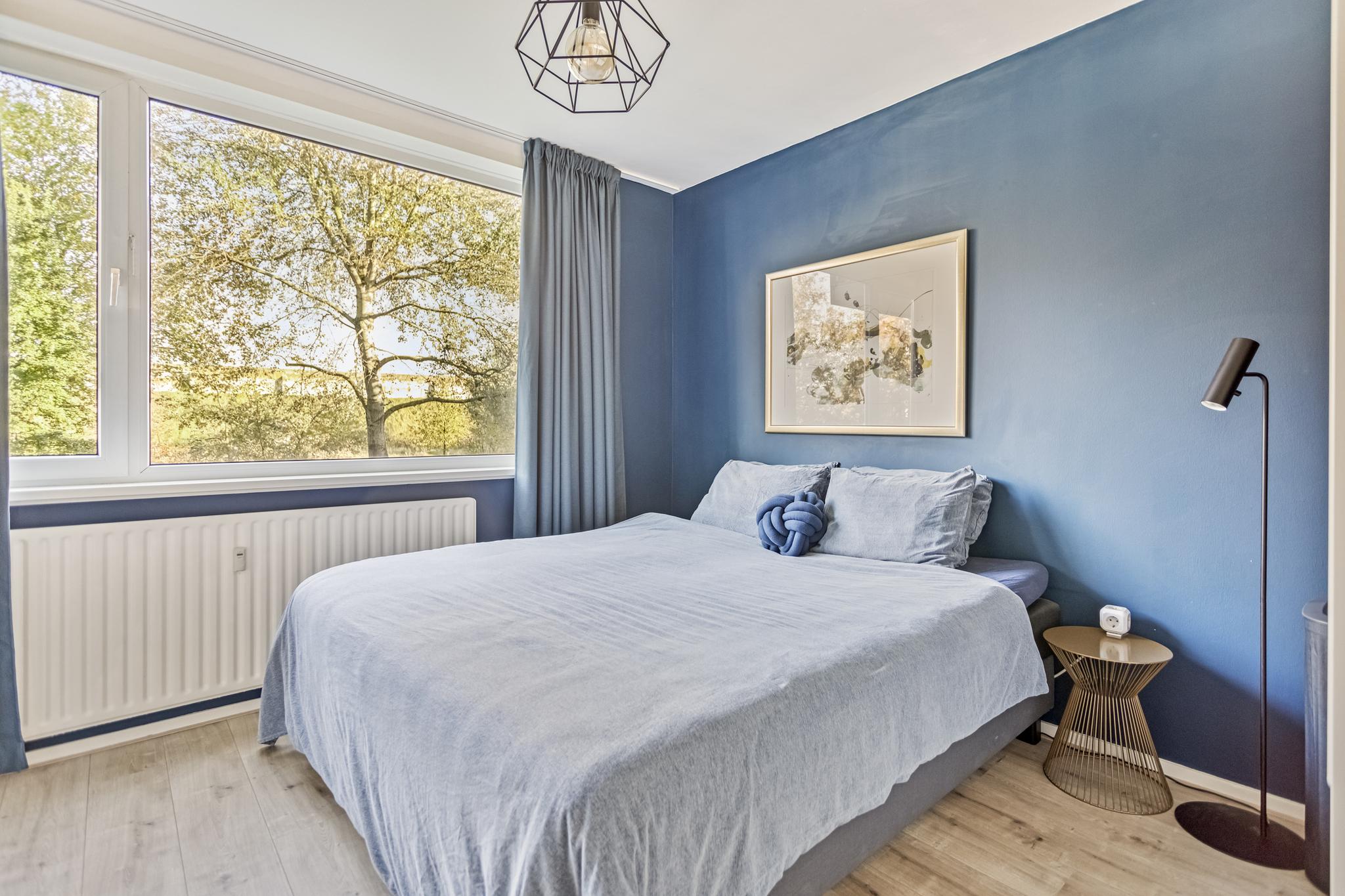 De eerste slaapkamer voldoende ruimte, ideaal voor extra opslag of fijne werkplek. De moderne toiletruimte is volledig betegeld en voorzien van een hangend toilet met een wastafeltje. De lichte, ruime woonkamer biedt toegang tot een tweede balkon, ook hier weer met een heerlijk uitzicht. Verder is er nog een royale masterbedroom, die grenst aan de badkamer en eveneens uitzicht biedt op het groen. De moderne badkamer (uit 2016) is strak betegeld en uitgerust met een regendouche, een kolomkast, en een wastafel met meubel.