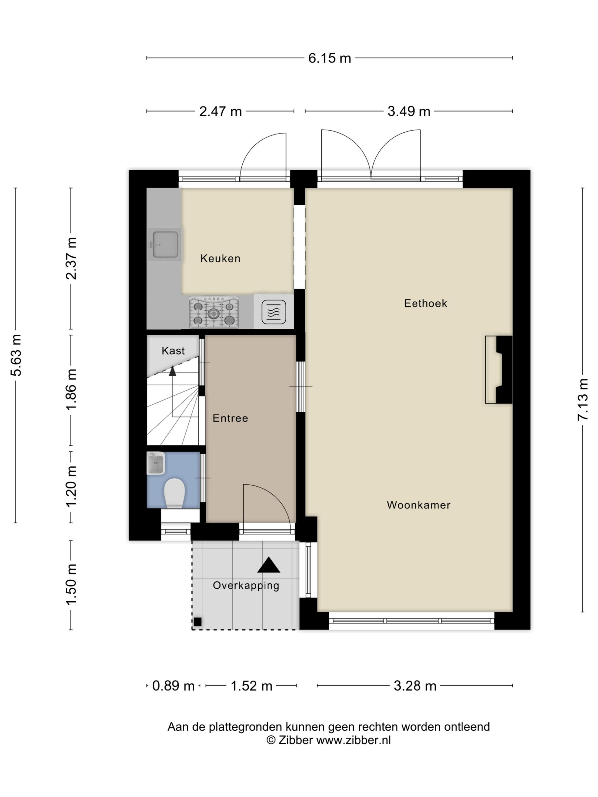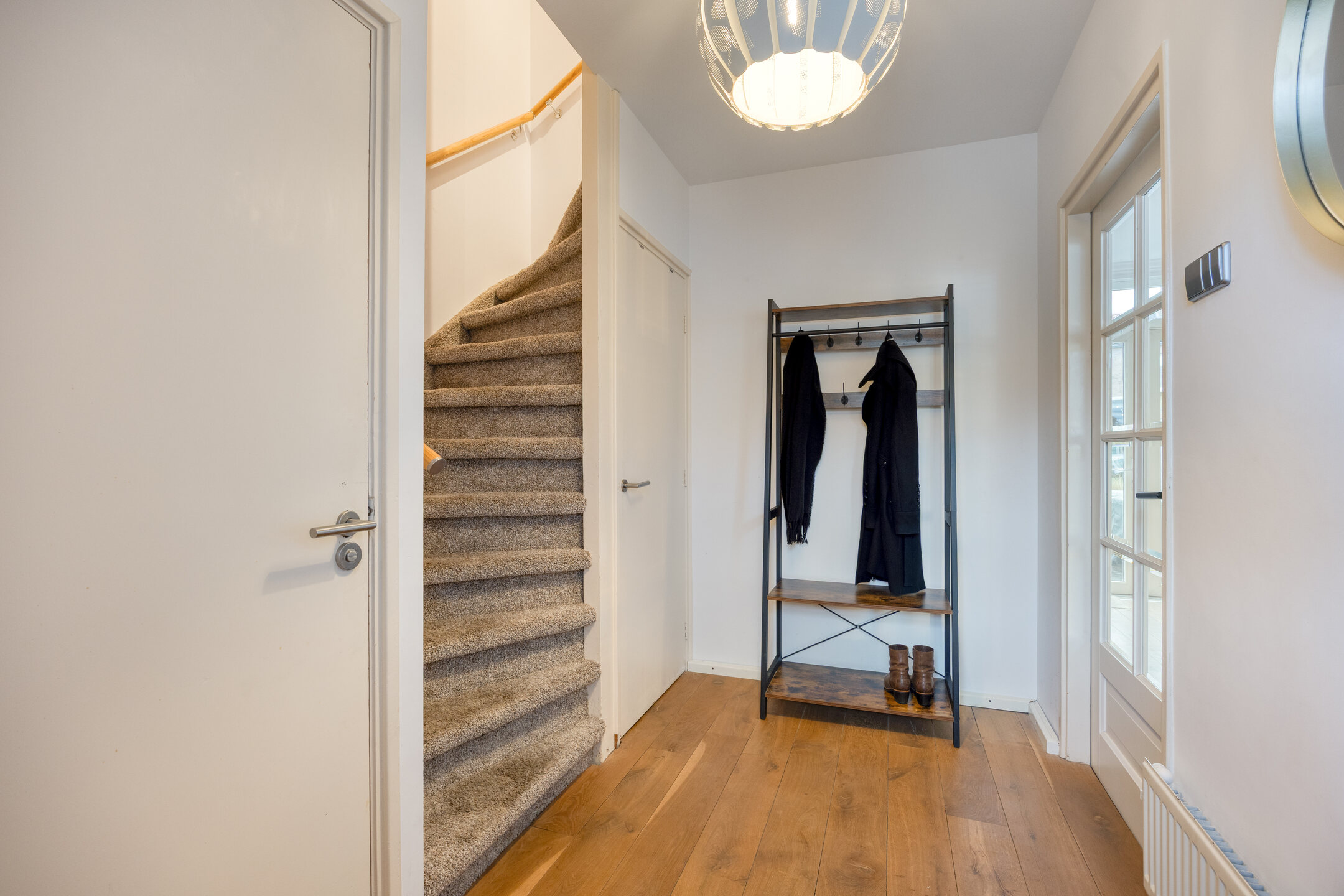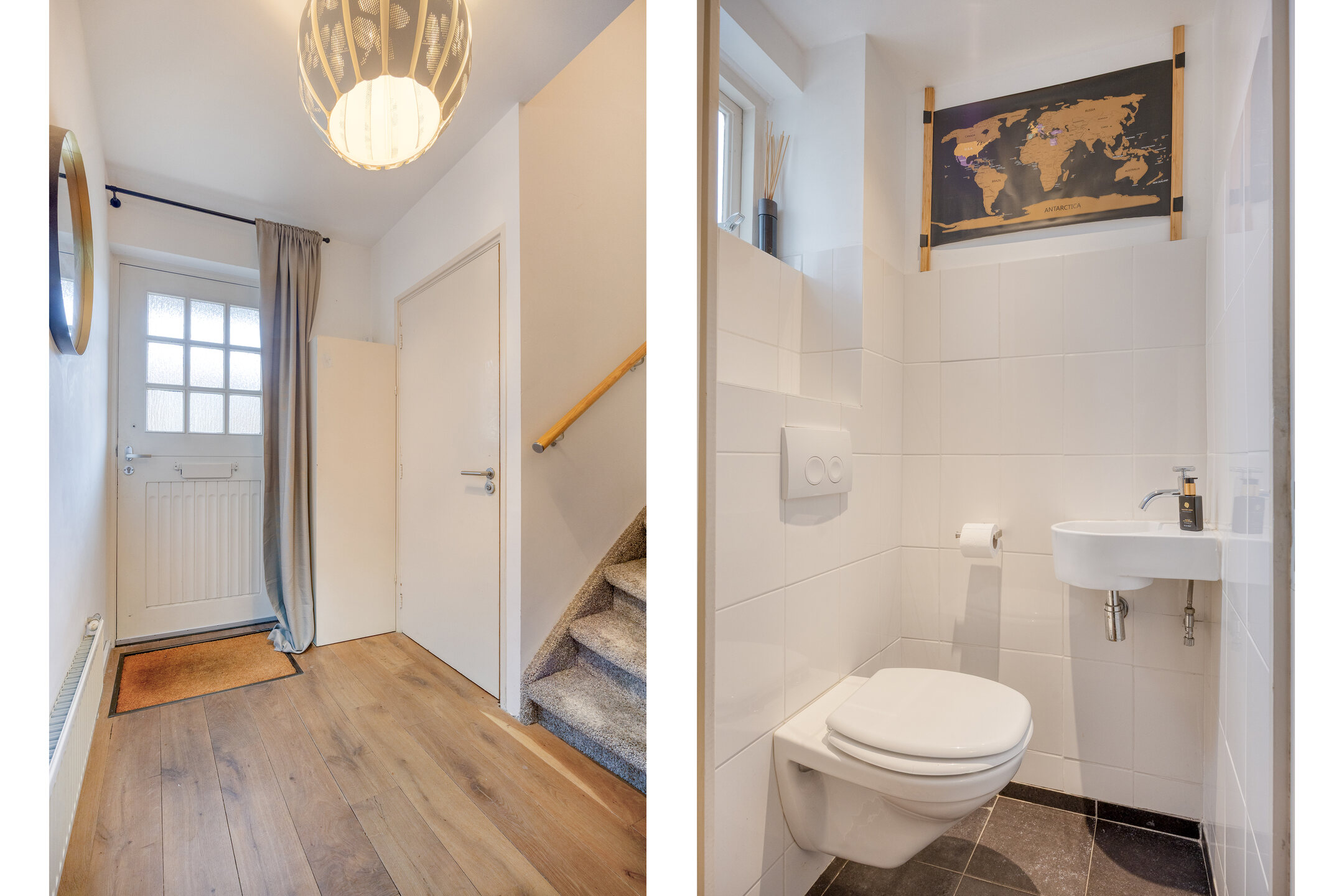 – de hal prettig binnenkomt en toegang biedt tot de meterkast, garderobe, toilet (met fonteintje), trapkast en de woonkamer;