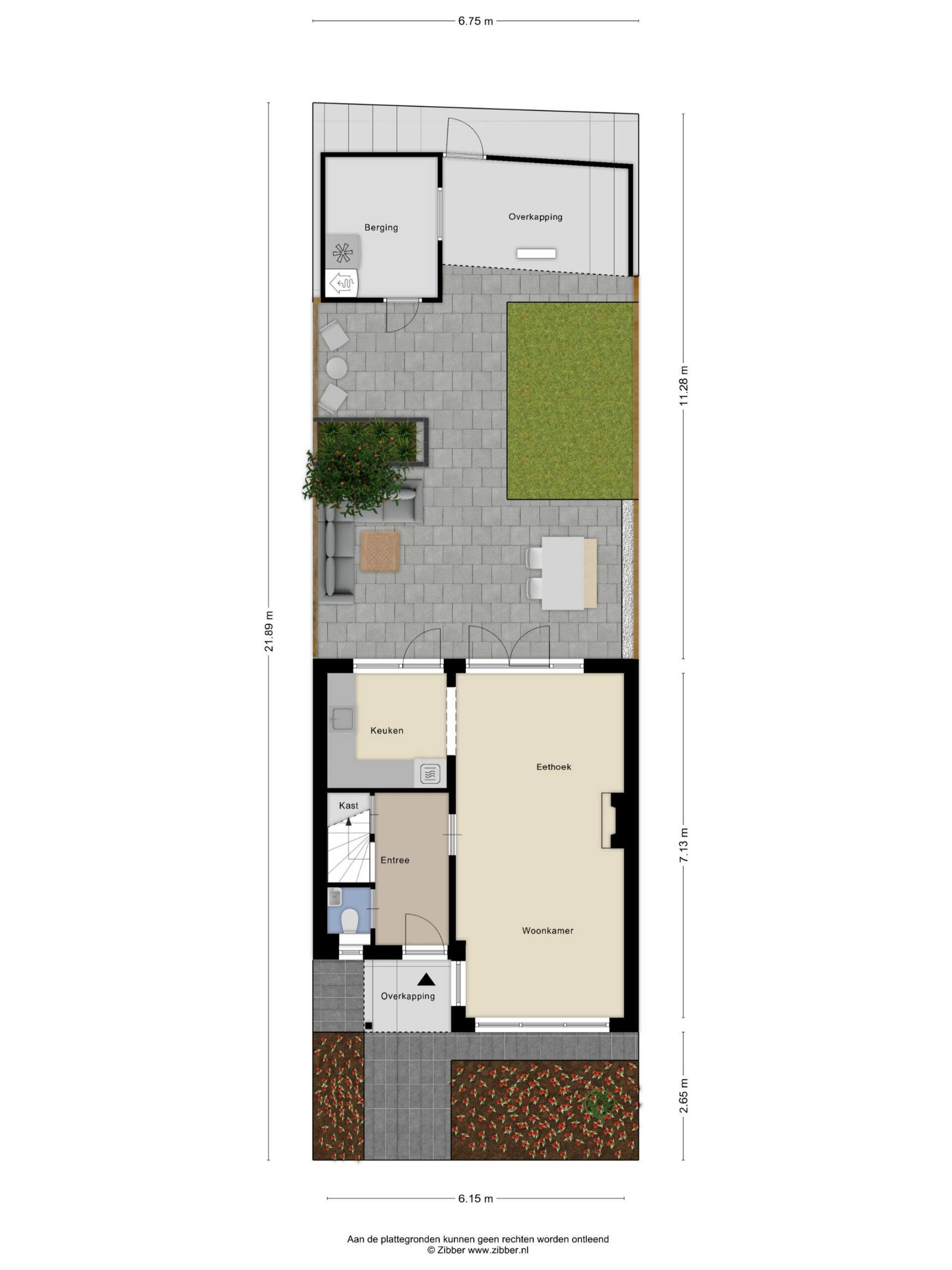 – de onderhoudsarme achtertuin op het zuiden is keurig aangelegd en beschikt over een stenen berging, overkapping en achterom;