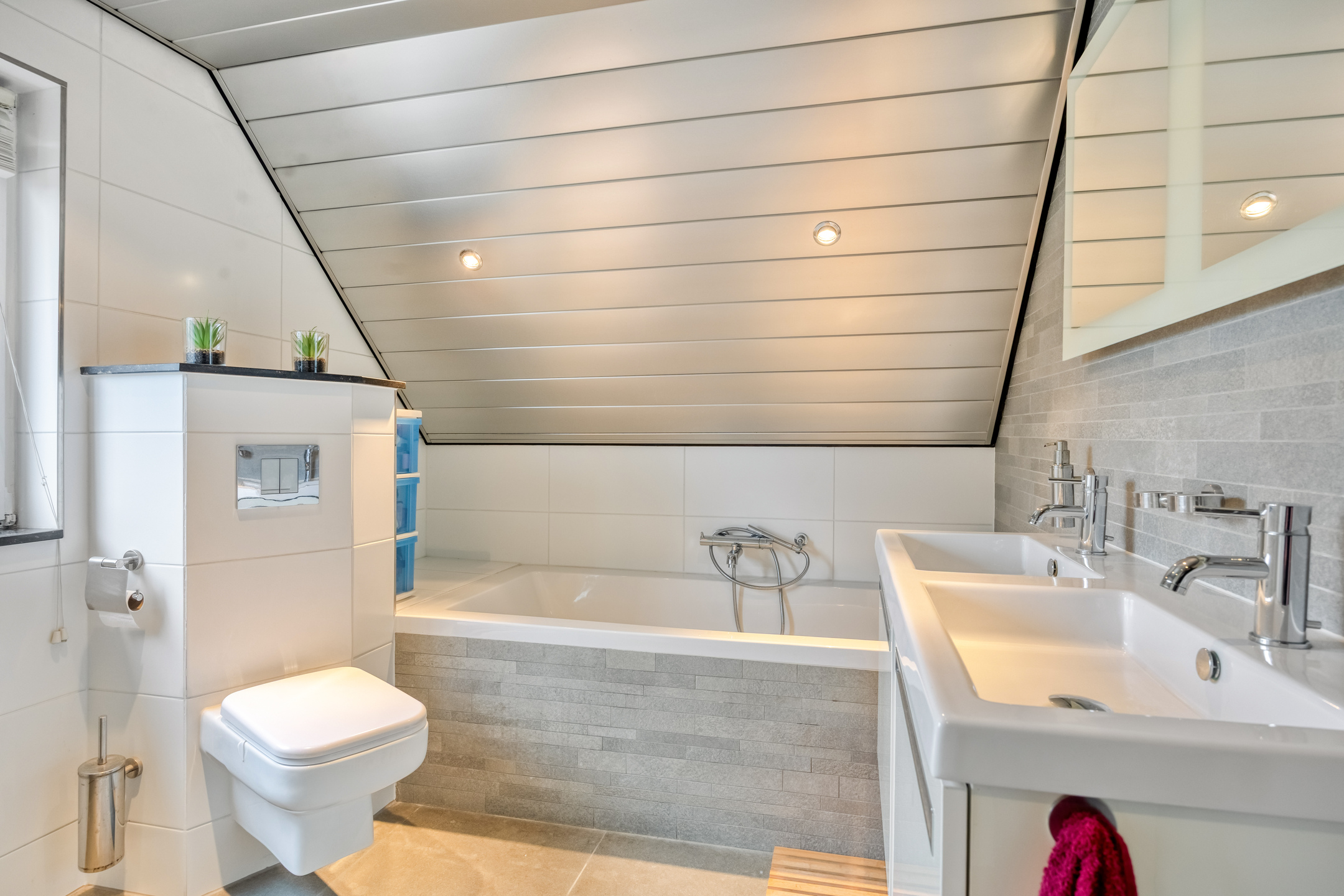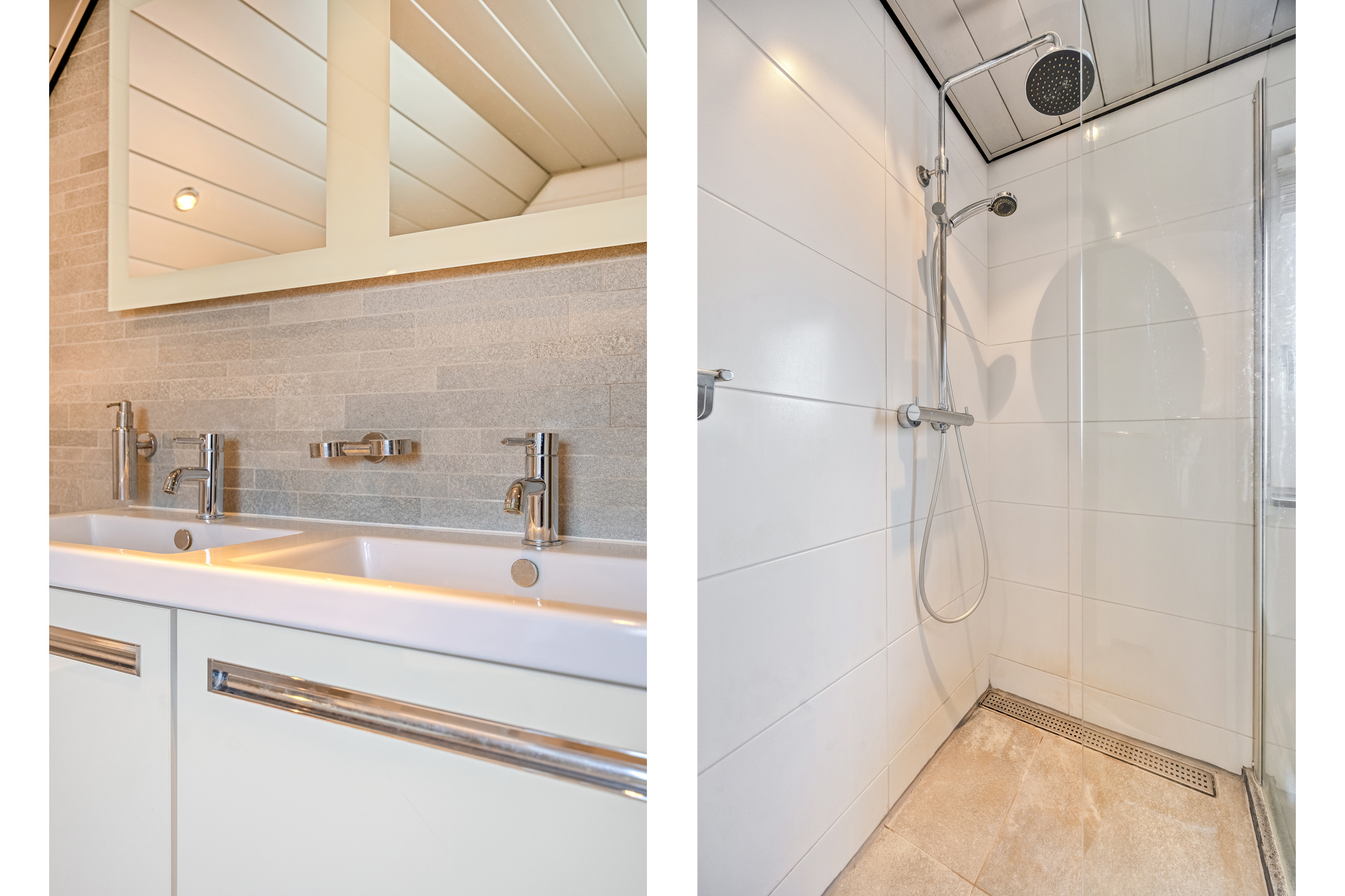 - Badkamervoorzieningen Ligbad, toilet, dubbele wastafel, wastafelmeubel, inloopdouche