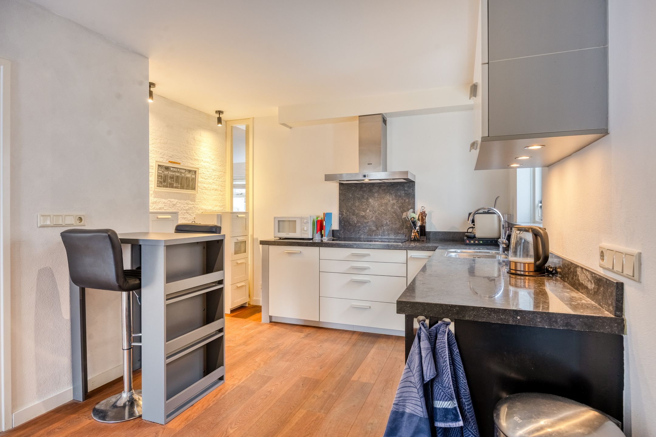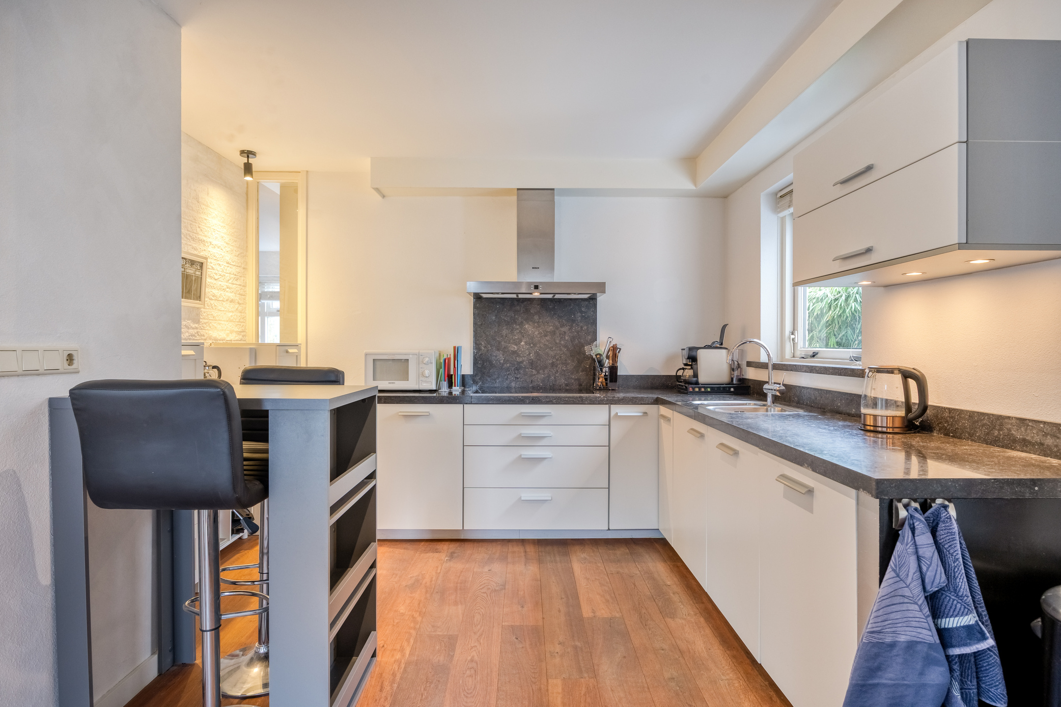 – Centrale woonkeuken met vloerverwarming en inbouwapparatuur zoals inductiekookplaat, oven, afzuigkap, vaatwasser en koelkast en natuurstenen aanrechtblad;