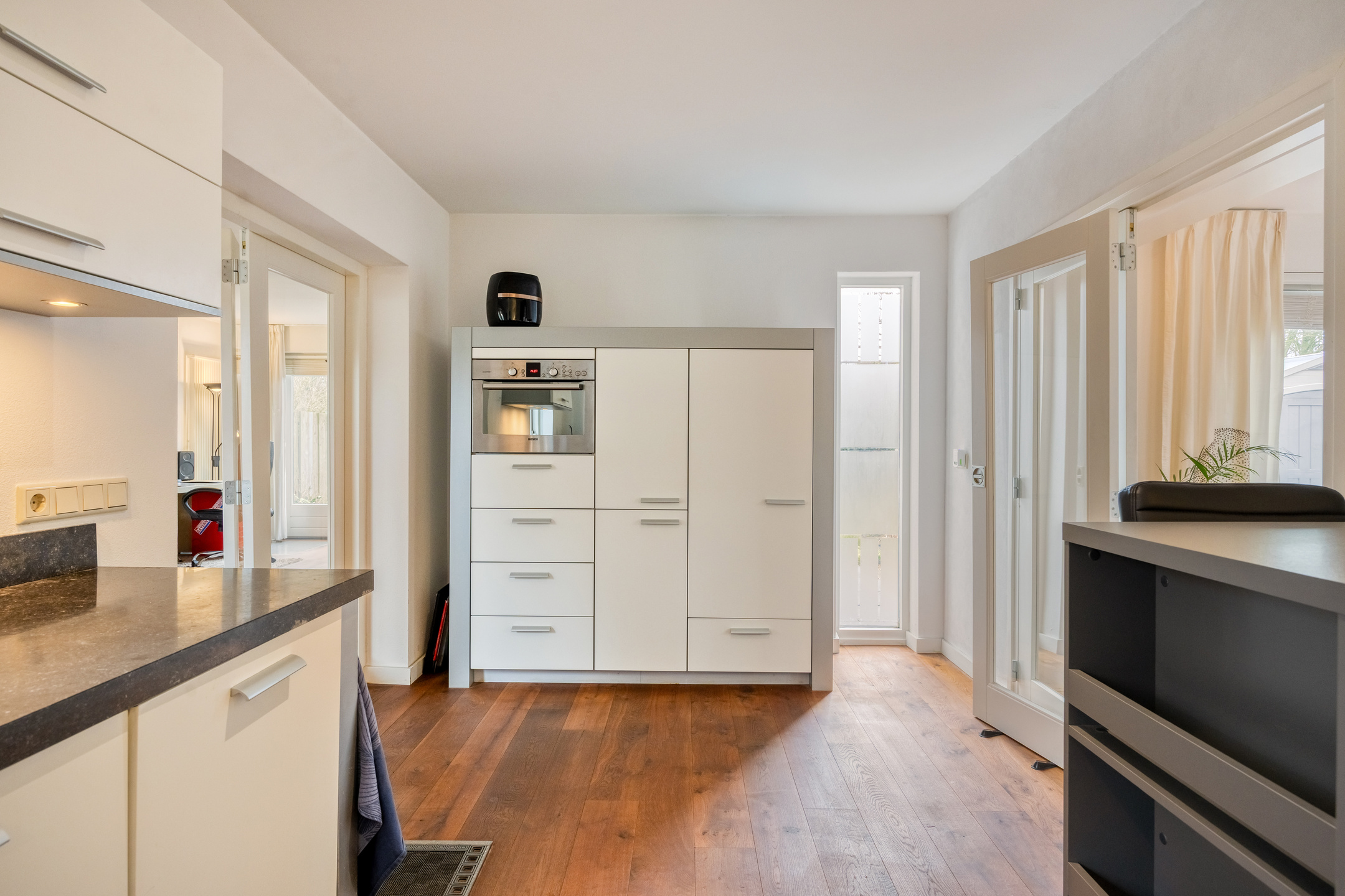 Gehele begane grond is voorzien van een warme eikenhouten vloer (uitgezonderd de bijkeuken)