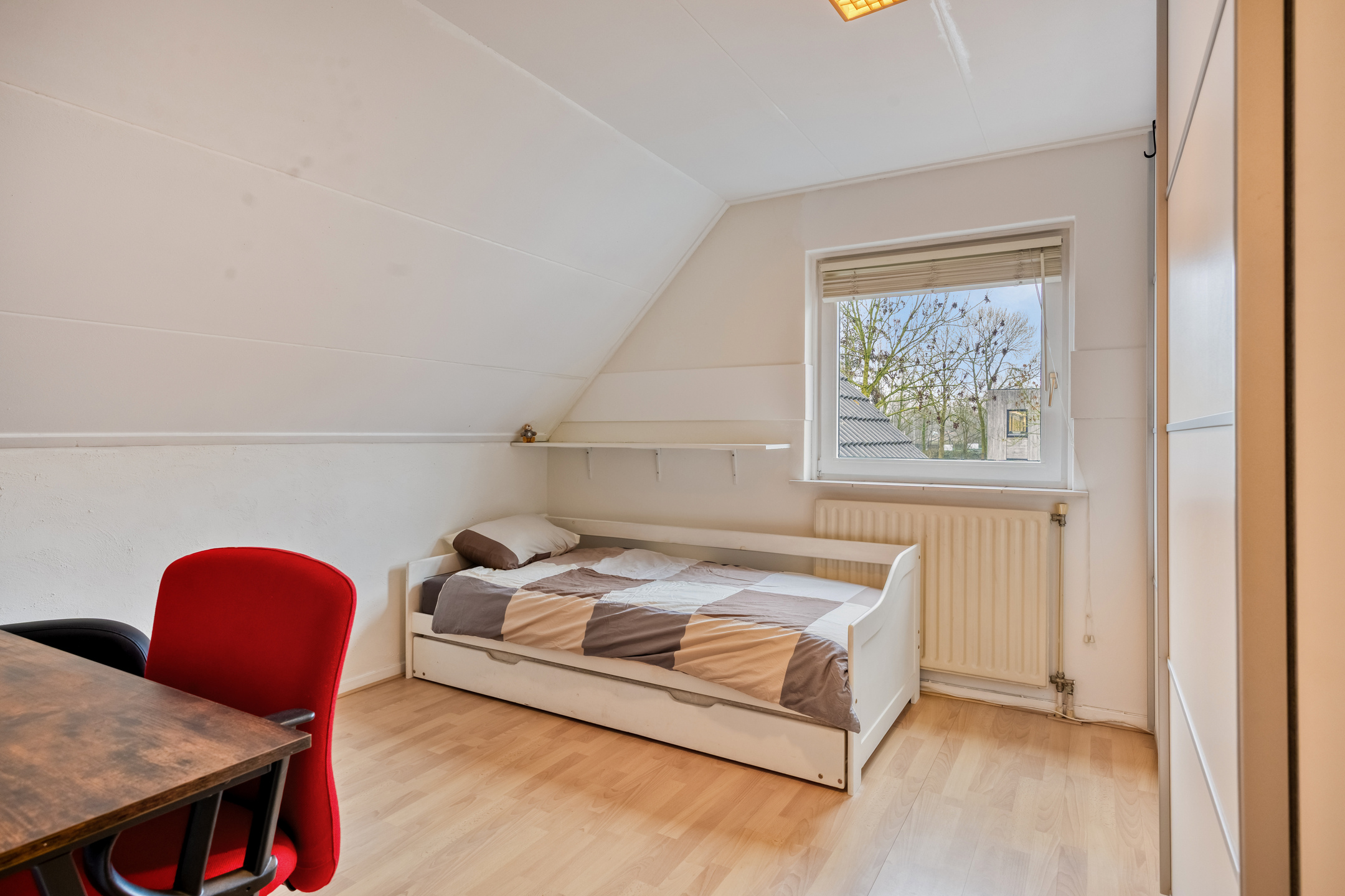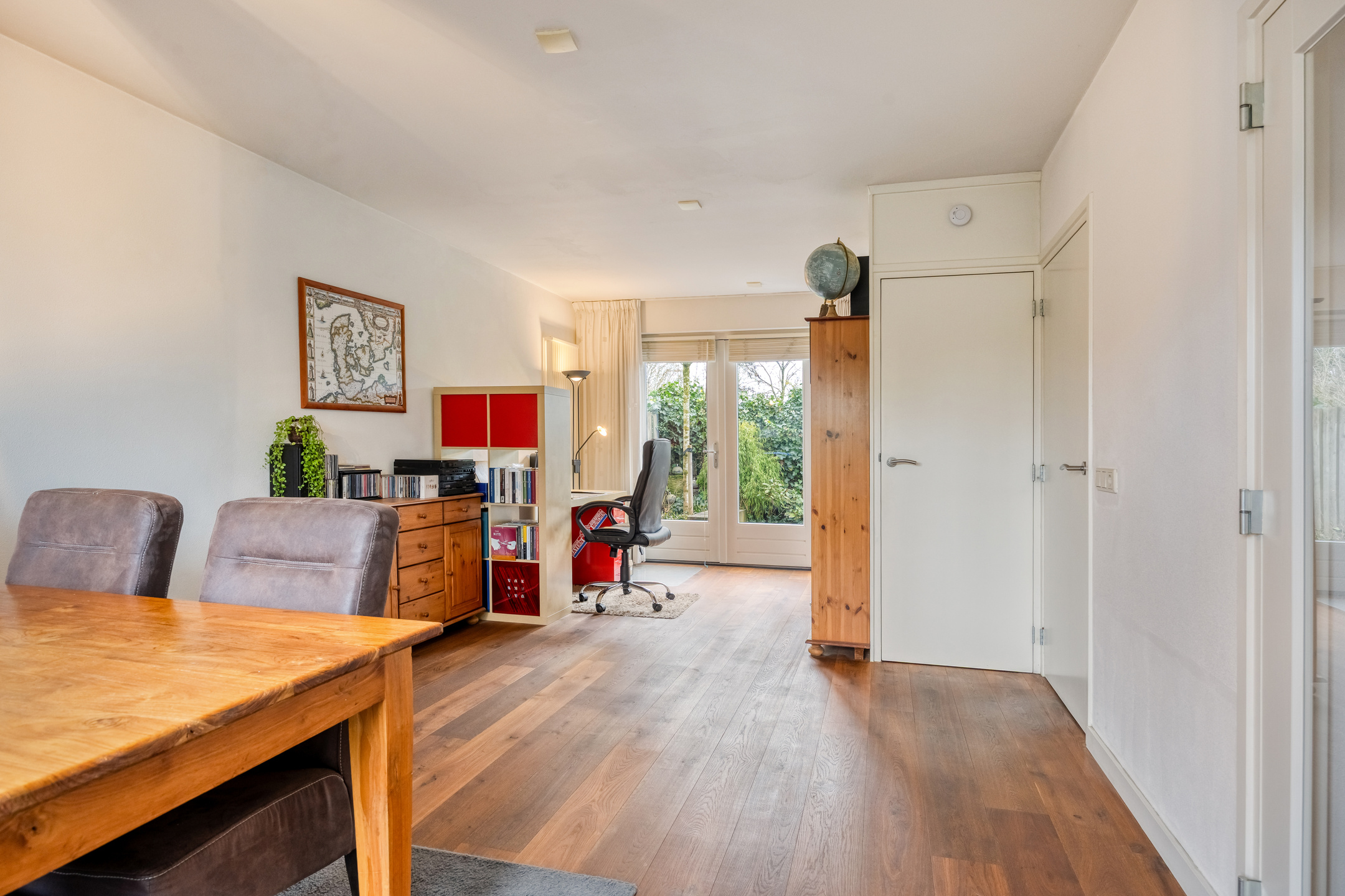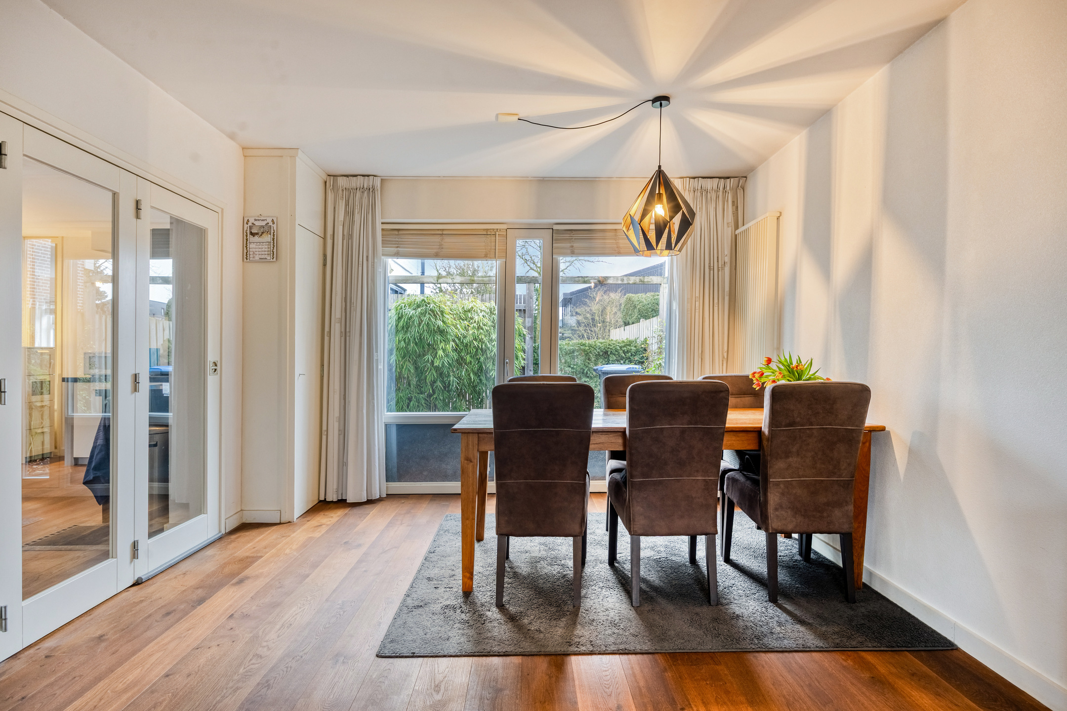 – Riante eetkamer (voormalige garage), perfect als werkkamer, praktijkruimte of hobbykamer, met openslaande deuren naar de tuin en vaste trap naar de multifunctionele zolderkamer;