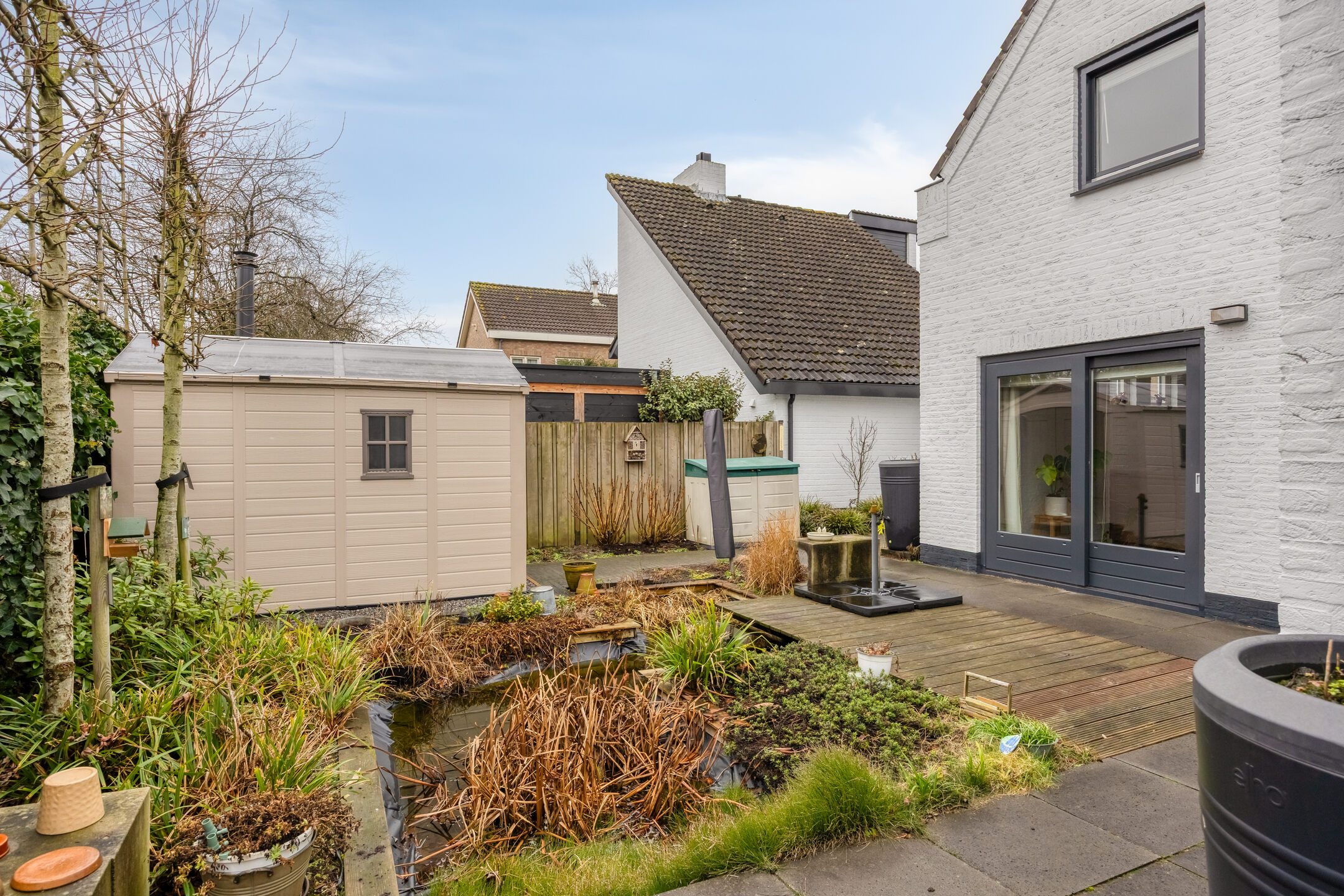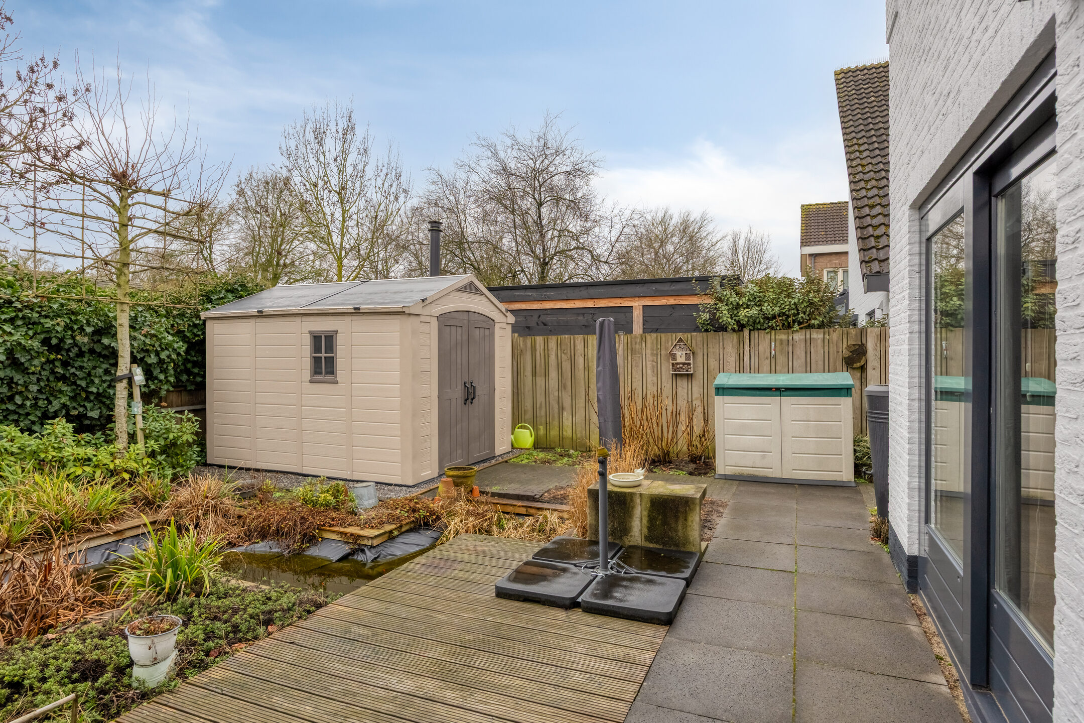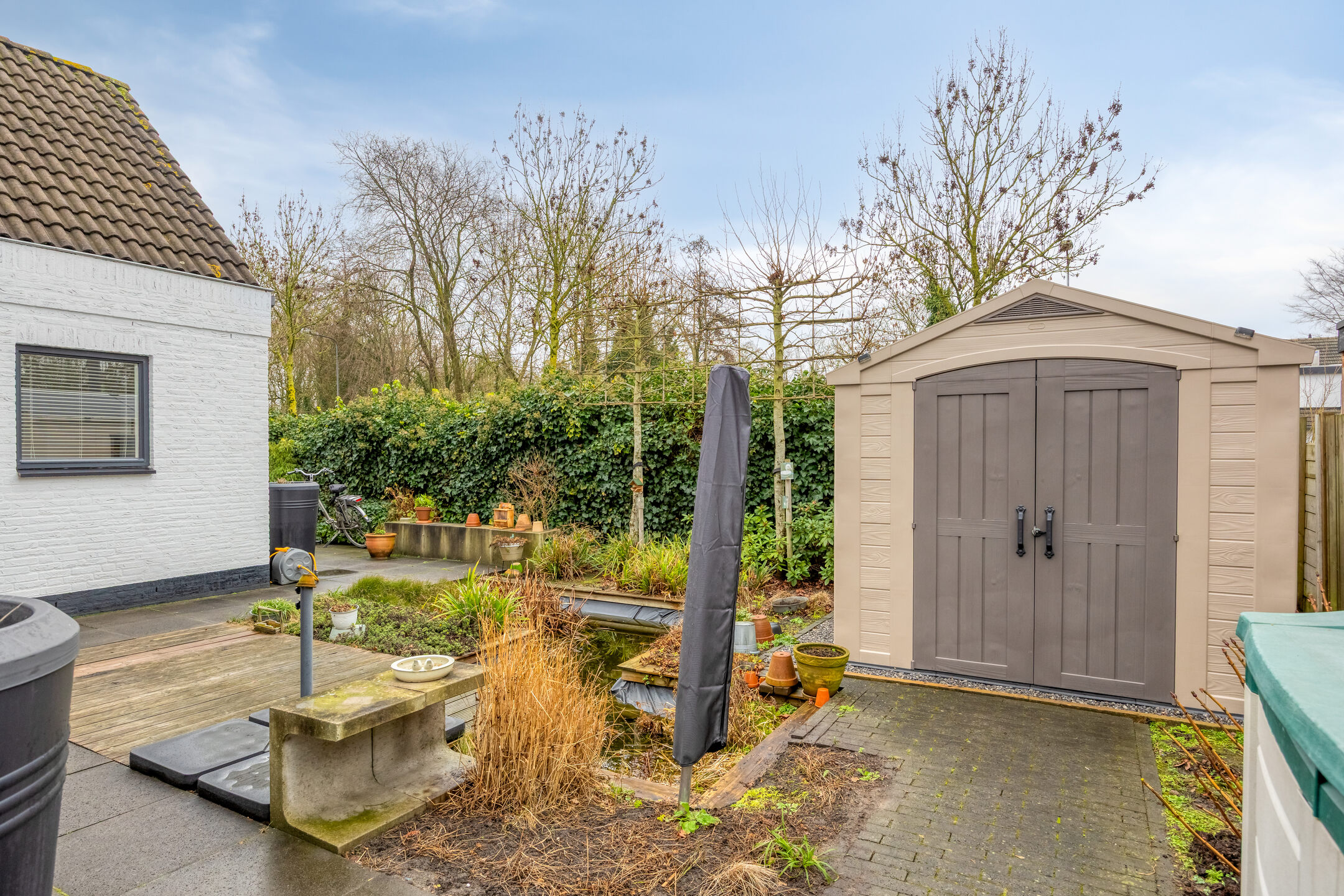 – Kunststof tuinhuis, recent geplaatst, ideaal voor opslag van fietsen, tuinmeubels of gereedschap;
