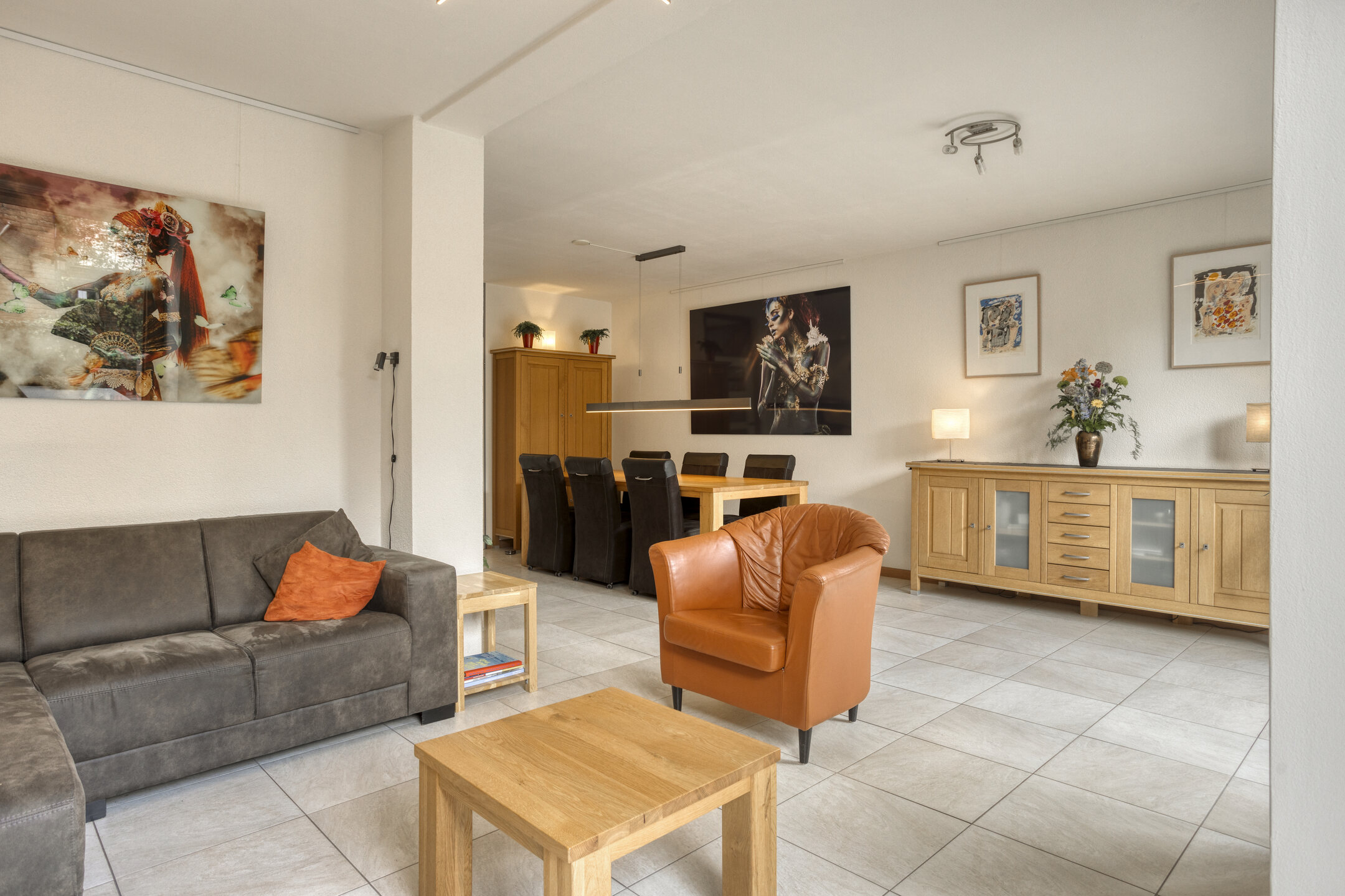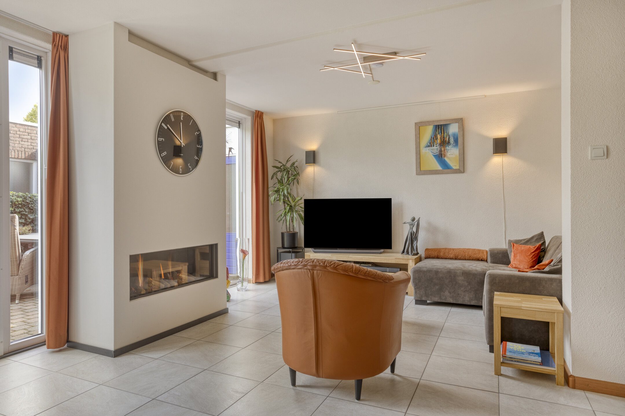 de woonkamer ruim is opgezet, beschikt over een sfeervolle gashaard, veel lichtinval en een tegelvloer met vloerverwarming;