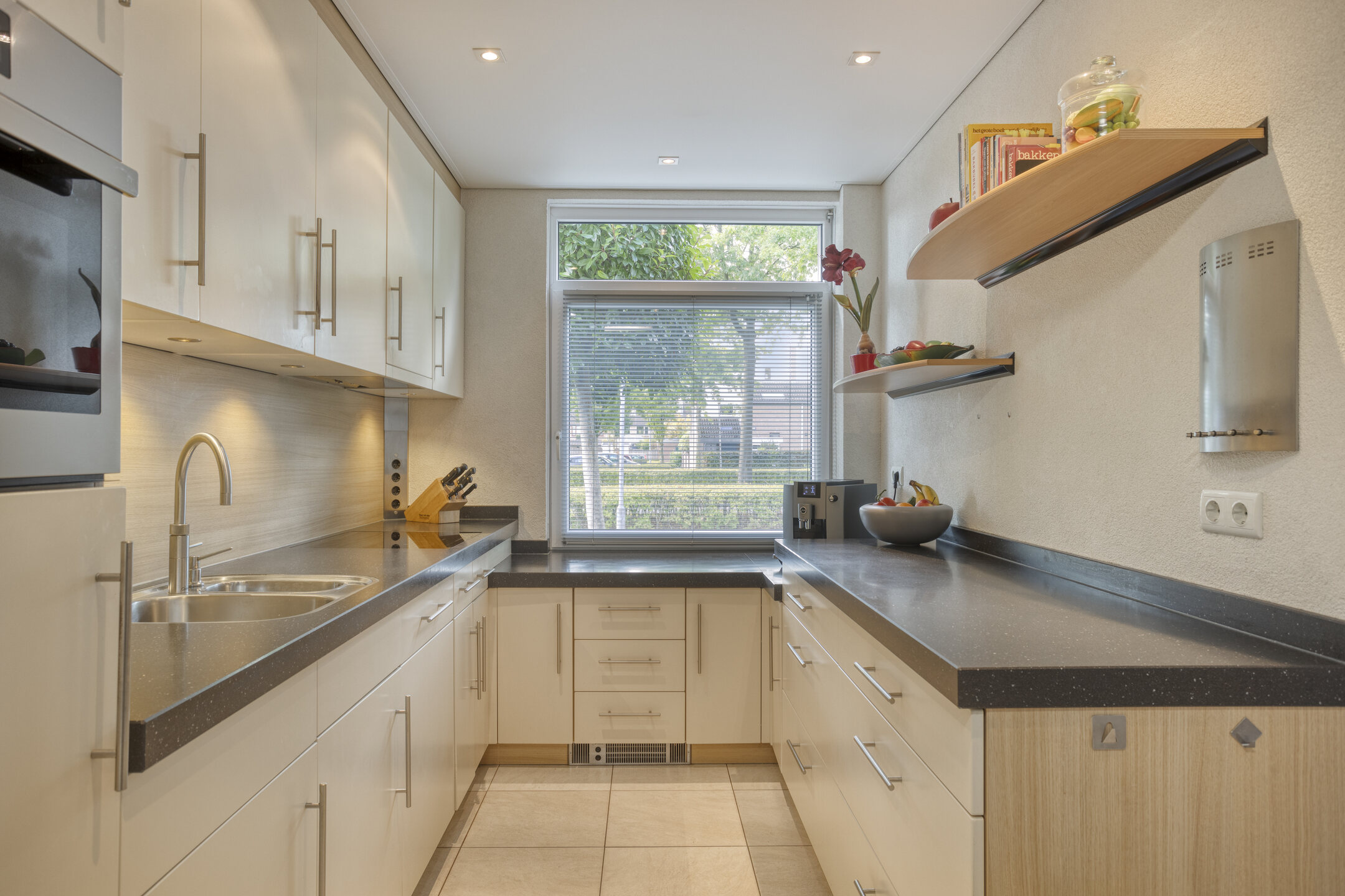 – de open keuken aan de voorzijde ligt en is voorzien van een moderne U-opstelling met inbouwapparatuur zoals een combimagnetron (2023), vaatwasser (2020), koelkast, vriezer, inductie kookplaat, afzuigkap en Quookerkraan (met kokend, bruisend en gekoeld water) (2018);