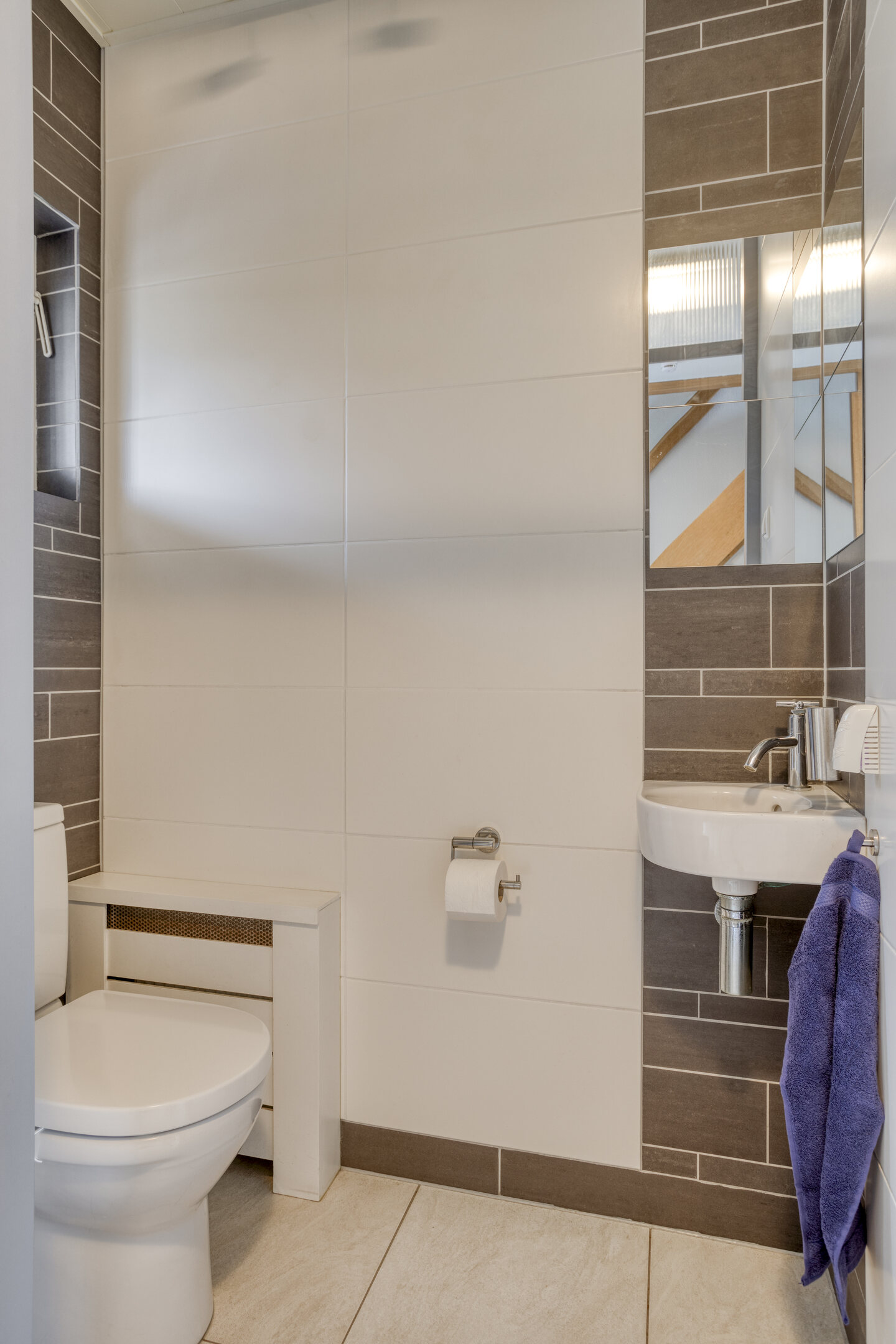 – de badkamer modern en volledig betegeld is, voorzien van elektrische vloerverwarming, een ligbad, aparte douche, dubbele wastafel en separaat een tweede toilet;