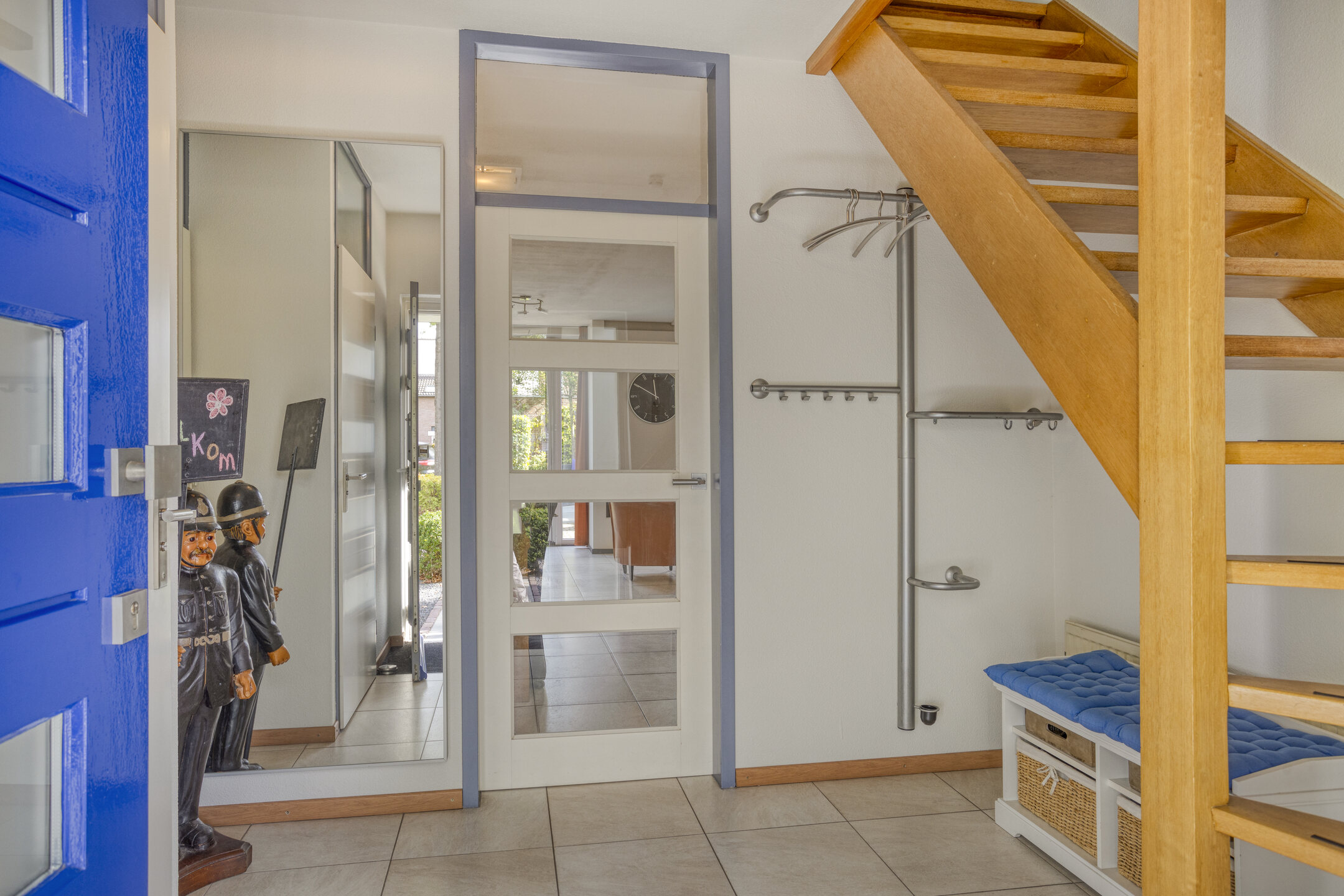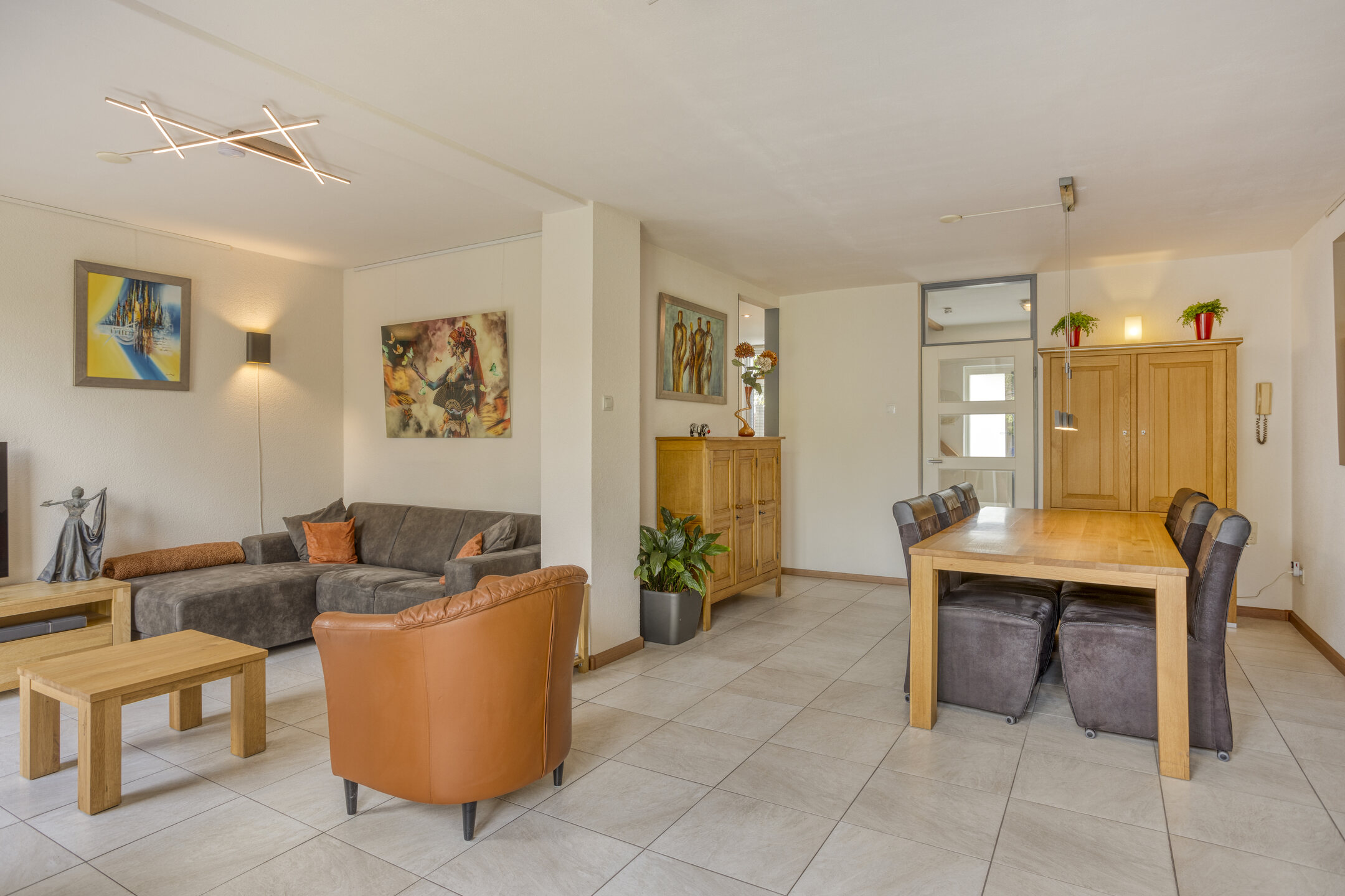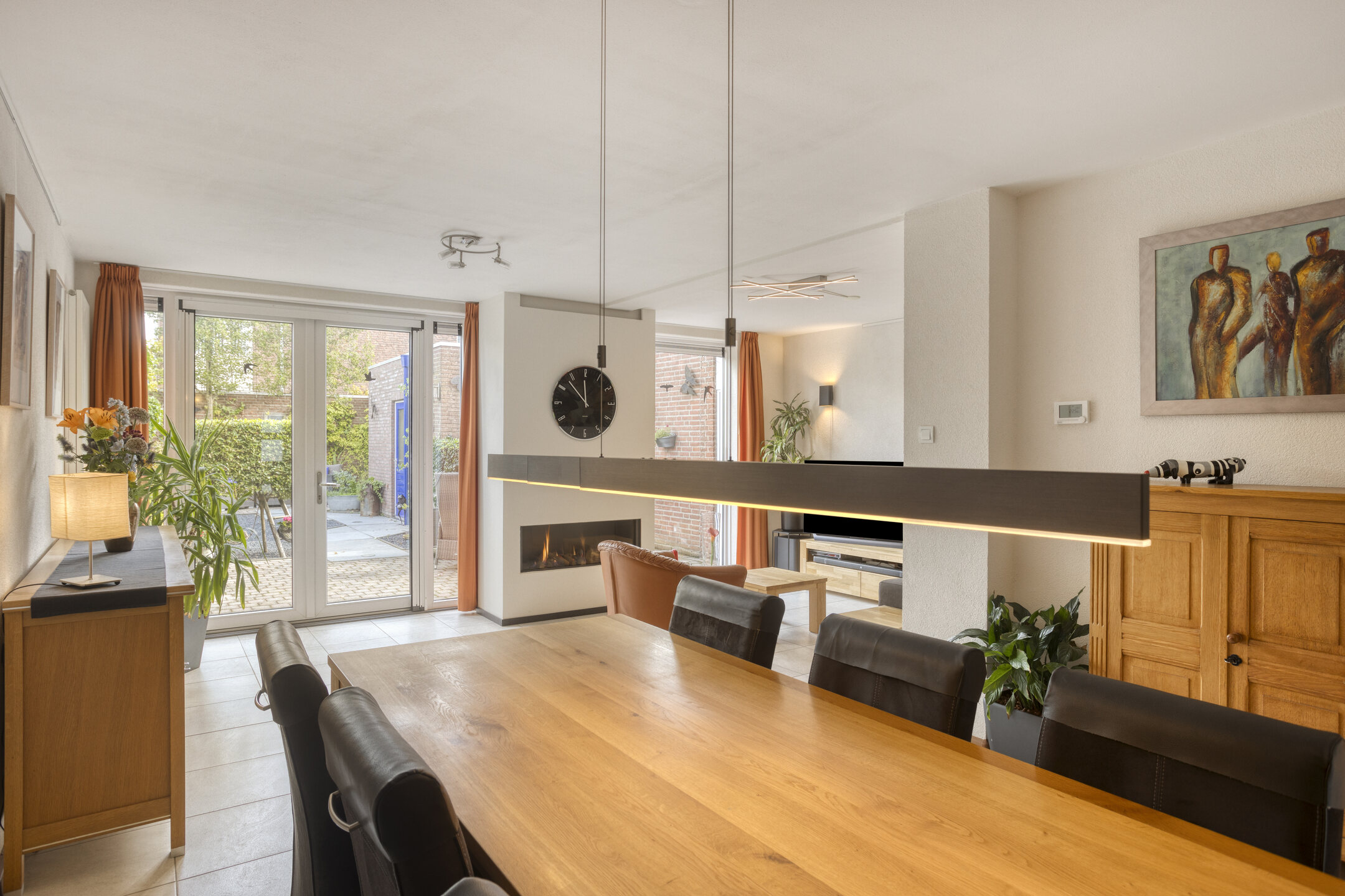 Je komt binnen in een ruime hal met garderobenis en toilet, die toegang geeft tot de woonkamer. Hier ervaar je meteen het gevoel van ruimte en licht. De royale living is sfeervol ingericht met een gashaard en grote raampartijen die zorgen voor een prettige lichtinval. De tegelvloer met vloerverwarming maakt het geheel comfortabel en aangenaam in elk seizoen.